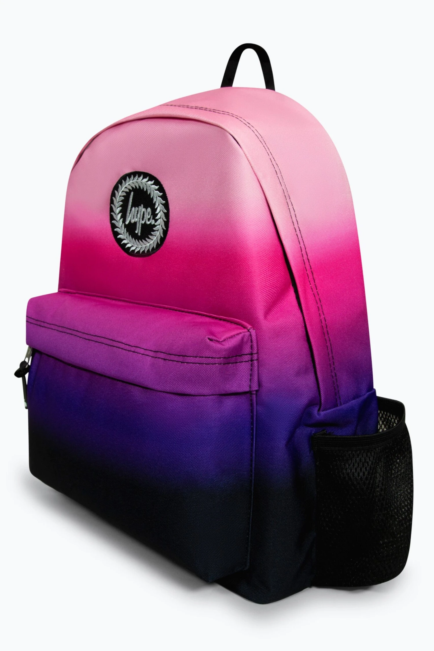 The HYPE. Gradient Badge Backpack is your new accessory staple. With an all-over gradient effect in a pink, purple and black colour palette. Measuring at 42cm x 30cm x 12cm, finished with a front mini pocket, grab handle, embossed zips, branded inside lining. Boasting the iconic HYPE. crest badge in monochrome embroidered on the front and straps offer supreme comfort with just the right amount of padding on the back. This backpack features a mesh side bottle holder and inside padded laptop sleeve and velcro fastening. Wipe clean only.