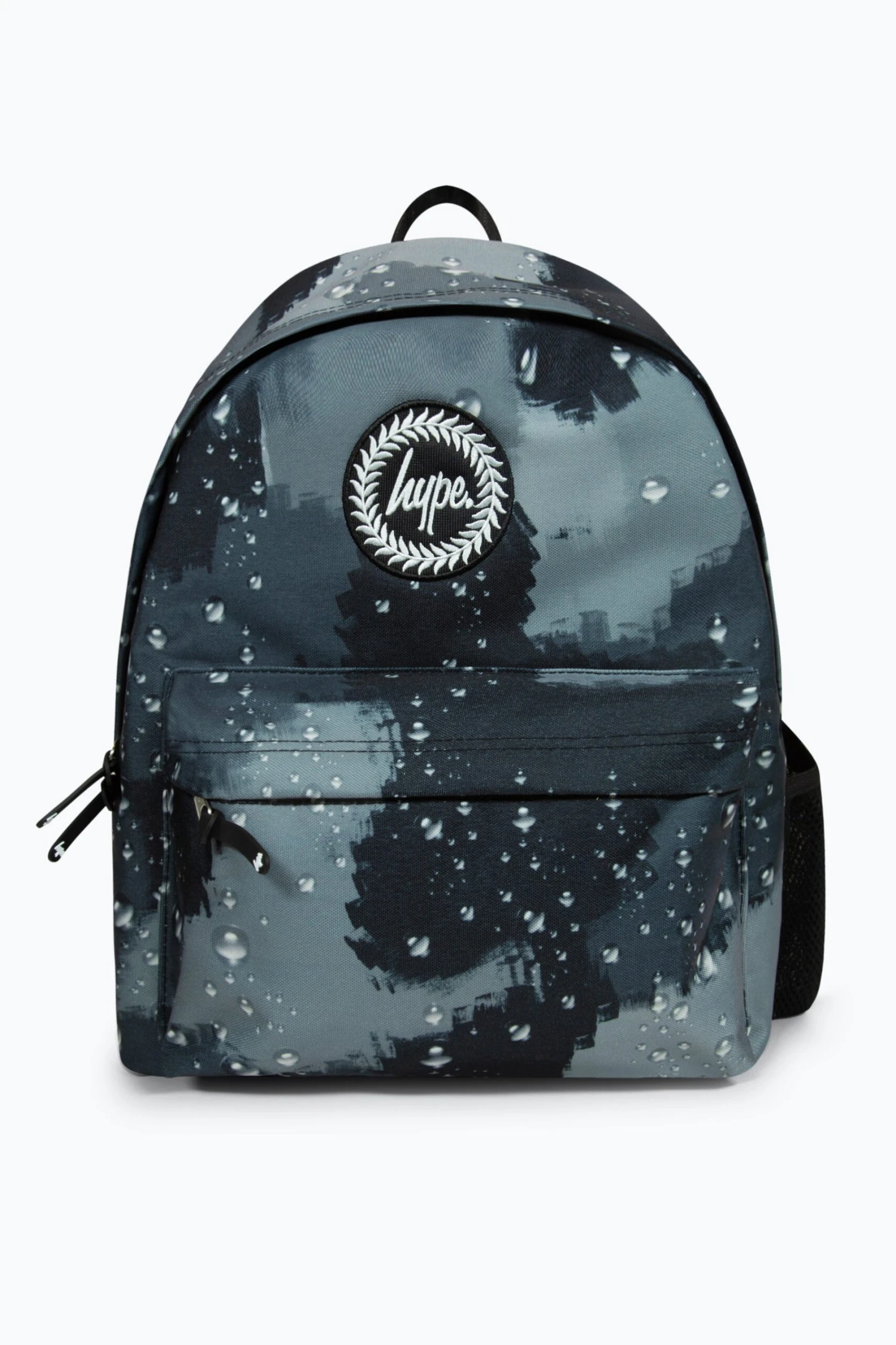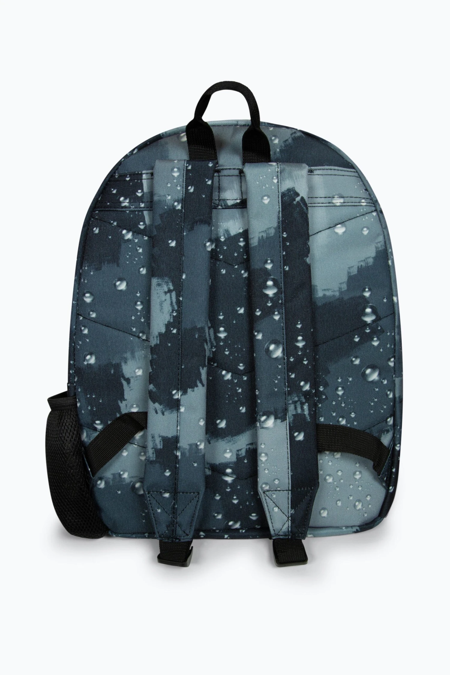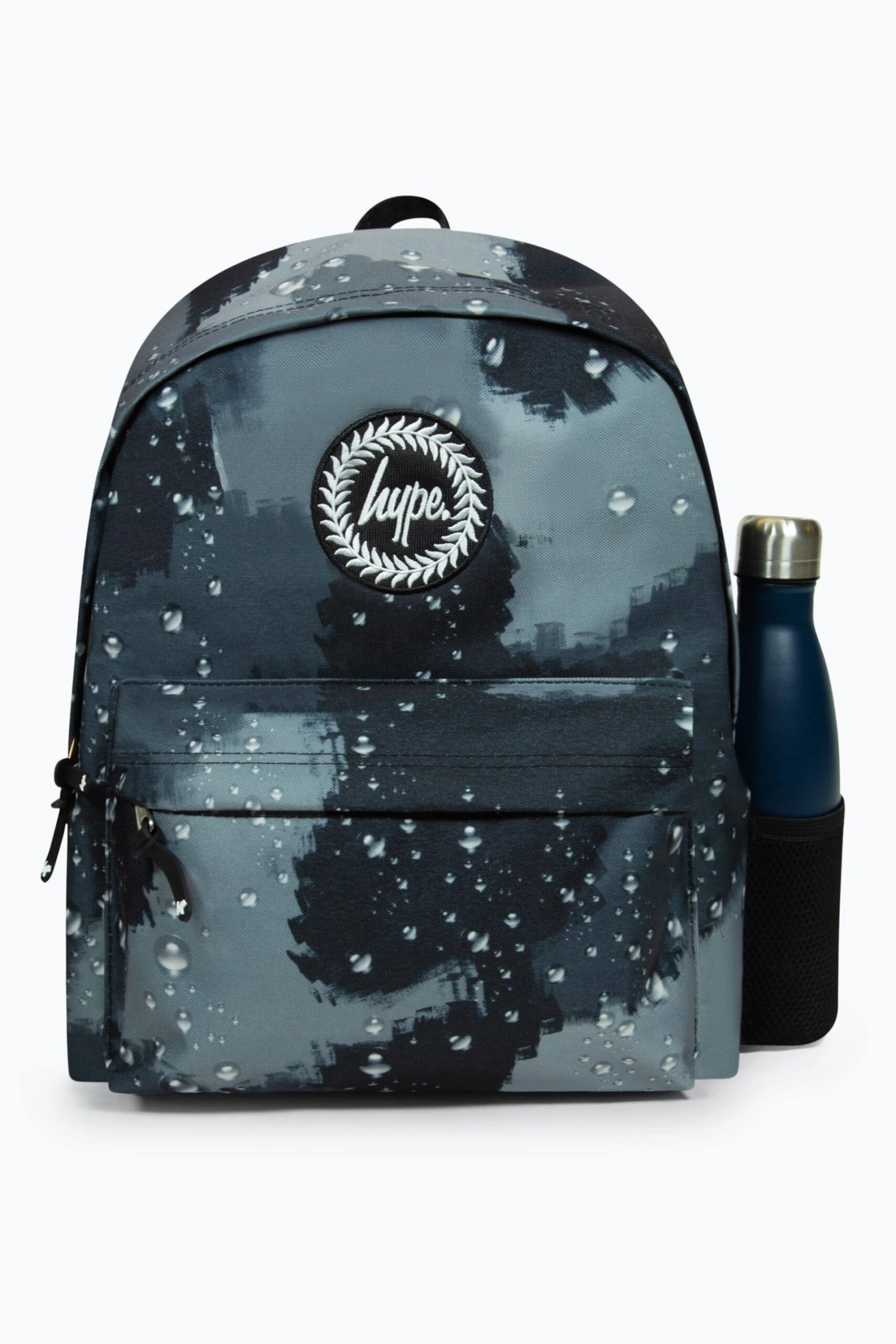 The HYPE. Black Rain Drop Camo Badge Backpack is your new accessory staple. With our signature all-over camo print with a black rain inspired injection in a contrasting navy and grey colour palette. Measuring at 42cm x 30cm x 12cm, finished with a front mini pocket, grab handle, embossed zips, branded inside lining. Boasting the iconic HYPE. crest badge in monochrome embroidered on the front and straps offer supreme comfort with just the right amount of padding on the back. This backpack features a mesh side bottle holder and inside padded laptop sleeve and velcro fastening. Wipe clean only.