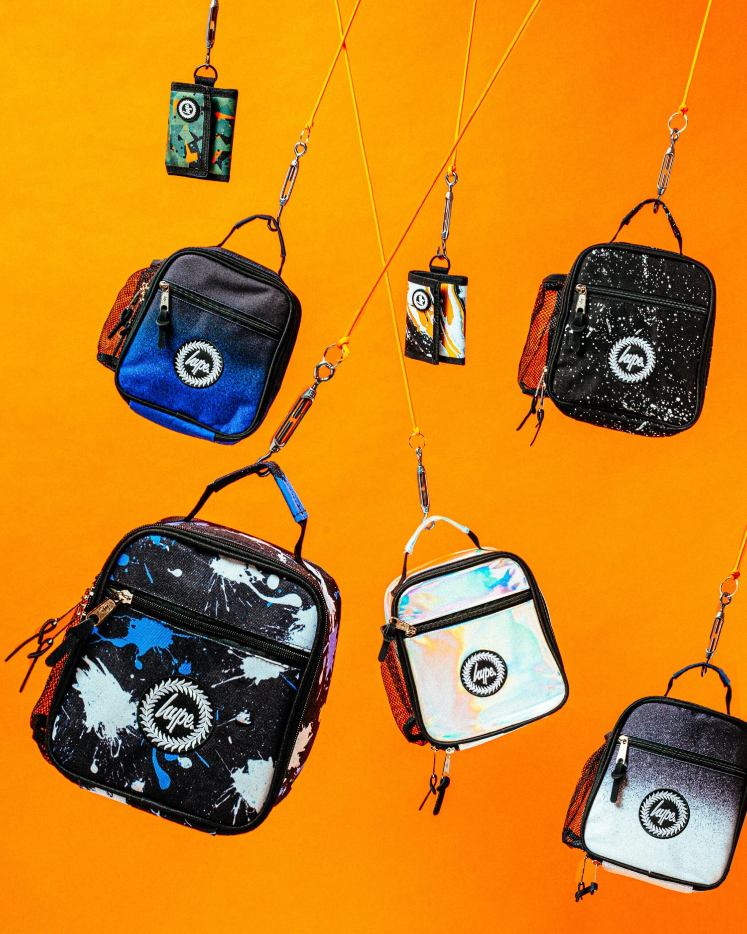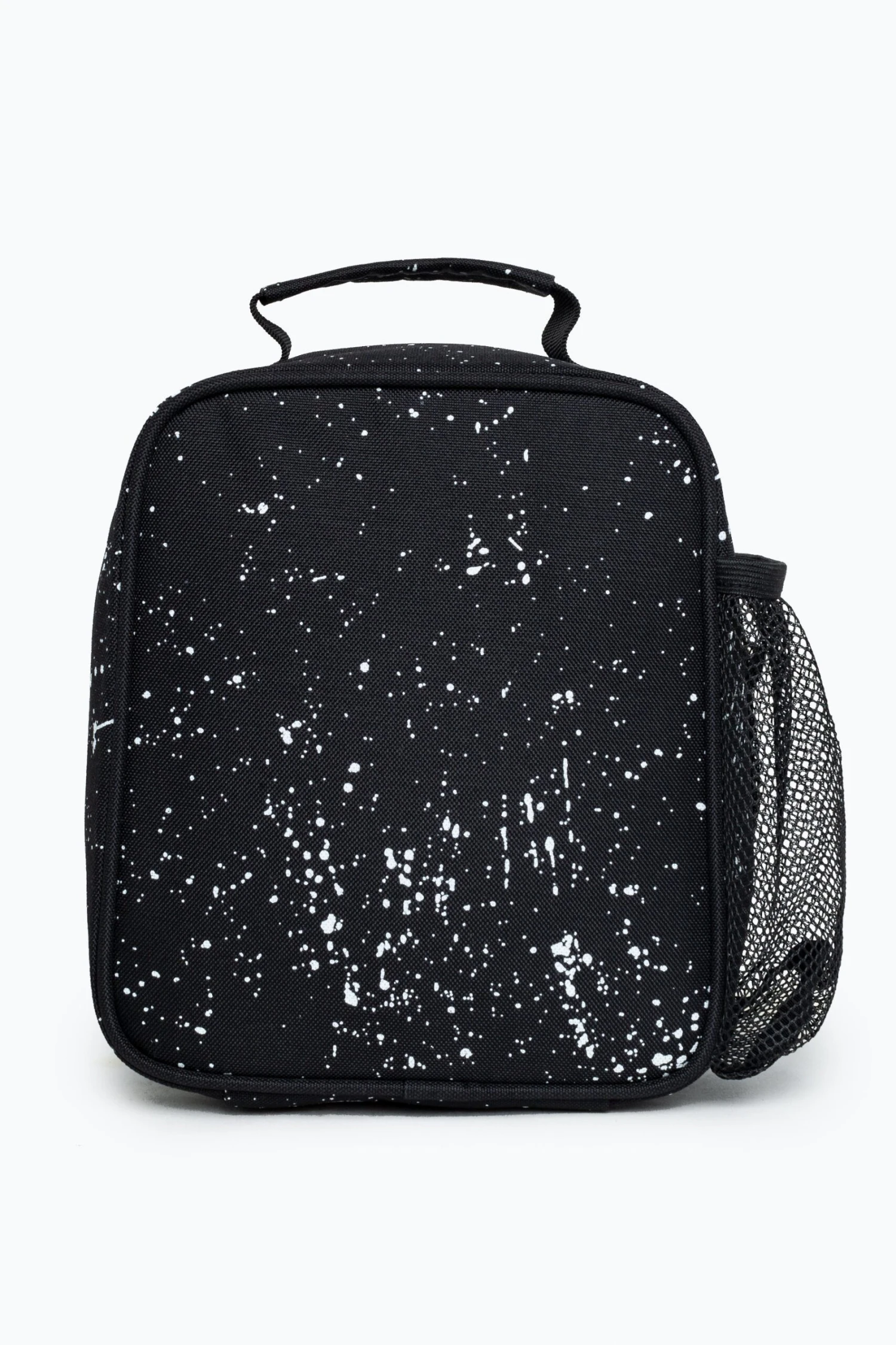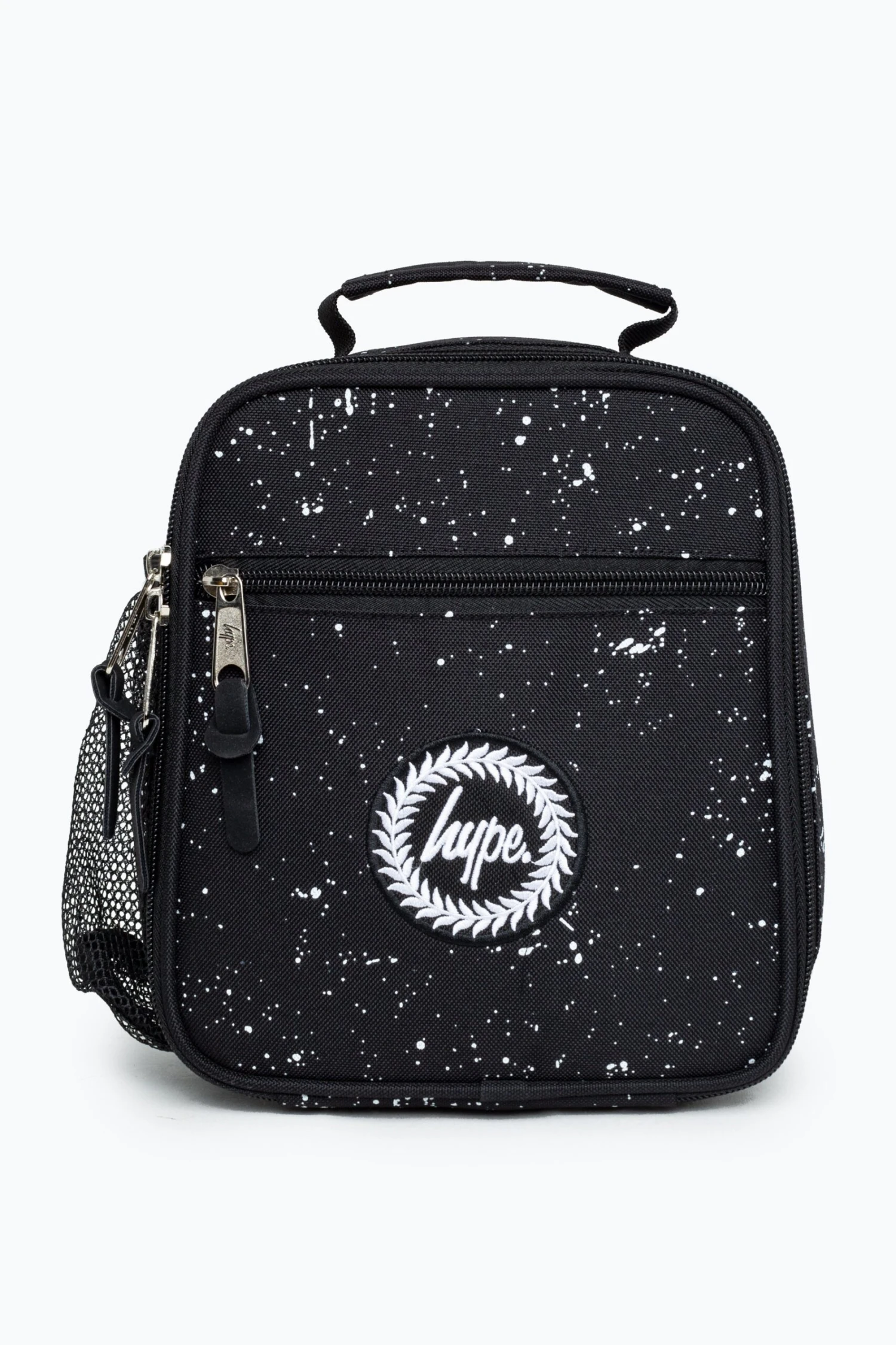 Introducing the HYPE. Black Speckle Lunch Bag. Designed in our standard unisex lunch box shape and style in an all-over speckle print. This lunch box is perfect for storing your school lunch or even as a cute picnic transporter. Featuring a mesh side pocket to store your water bottle and inside insulated lining to keep your lunch fresh. Finished with the iconic HYPE. crest logo embroidered on the front. Wipe clean only.