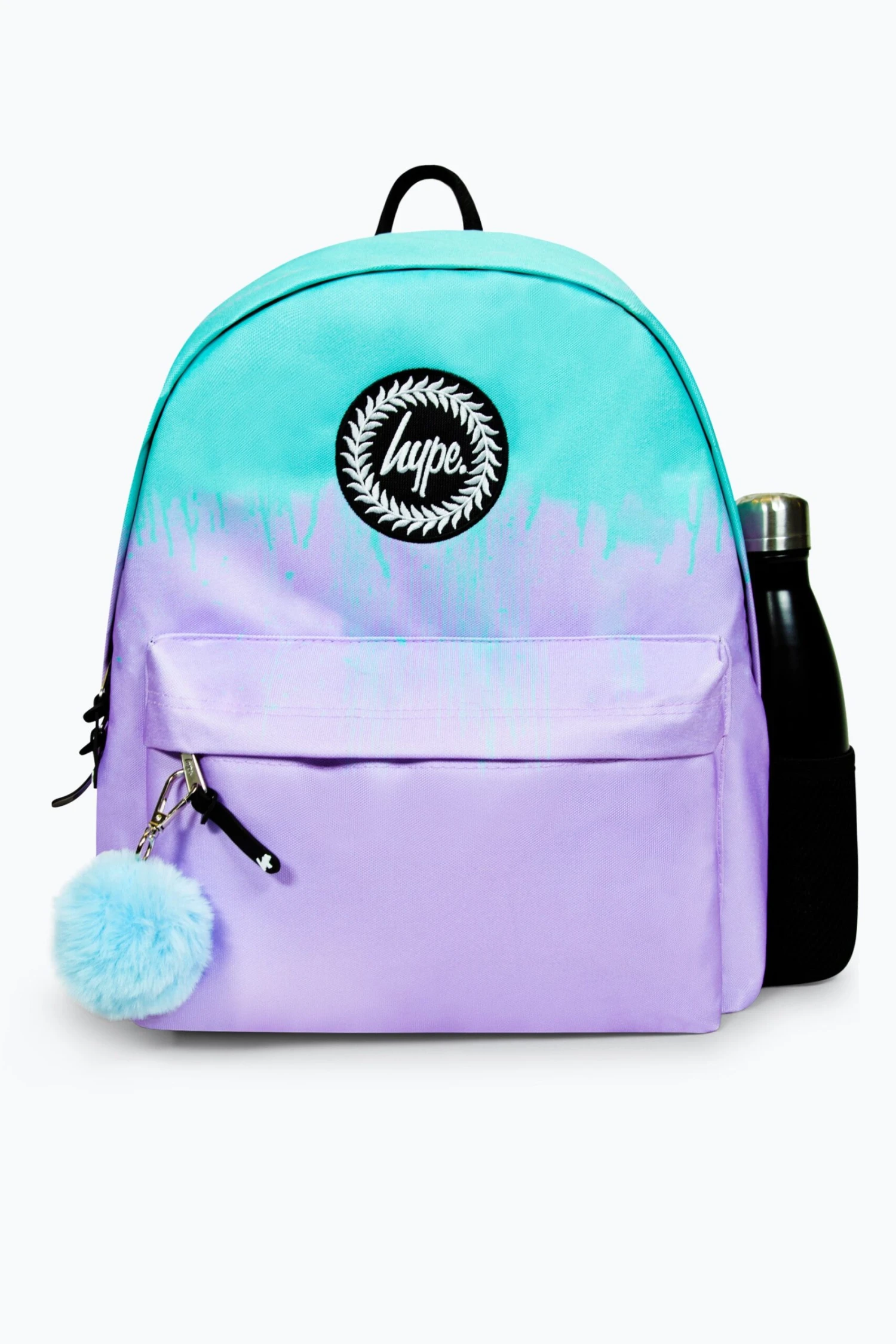 The HYPE. Blue Drips Badge Backpack is your new accessory staple. With an all-over paint-drips inspired print in a pastel blue and pink colour palette – with a removable pom pom key chain. Measuring at 42cm x 30cm x 12cm, finished with a front mini pocket, grab handle, embossed zips, branded inside lining. Boasting the iconic HYPE. crest badge in monochrome embroidered on the front and straps offer supreme comfort with just the right amount of padding on the back. This backpack features a mesh side bottle holder and inside padded laptop sleeve and velcro fastening. Wipe clean only.