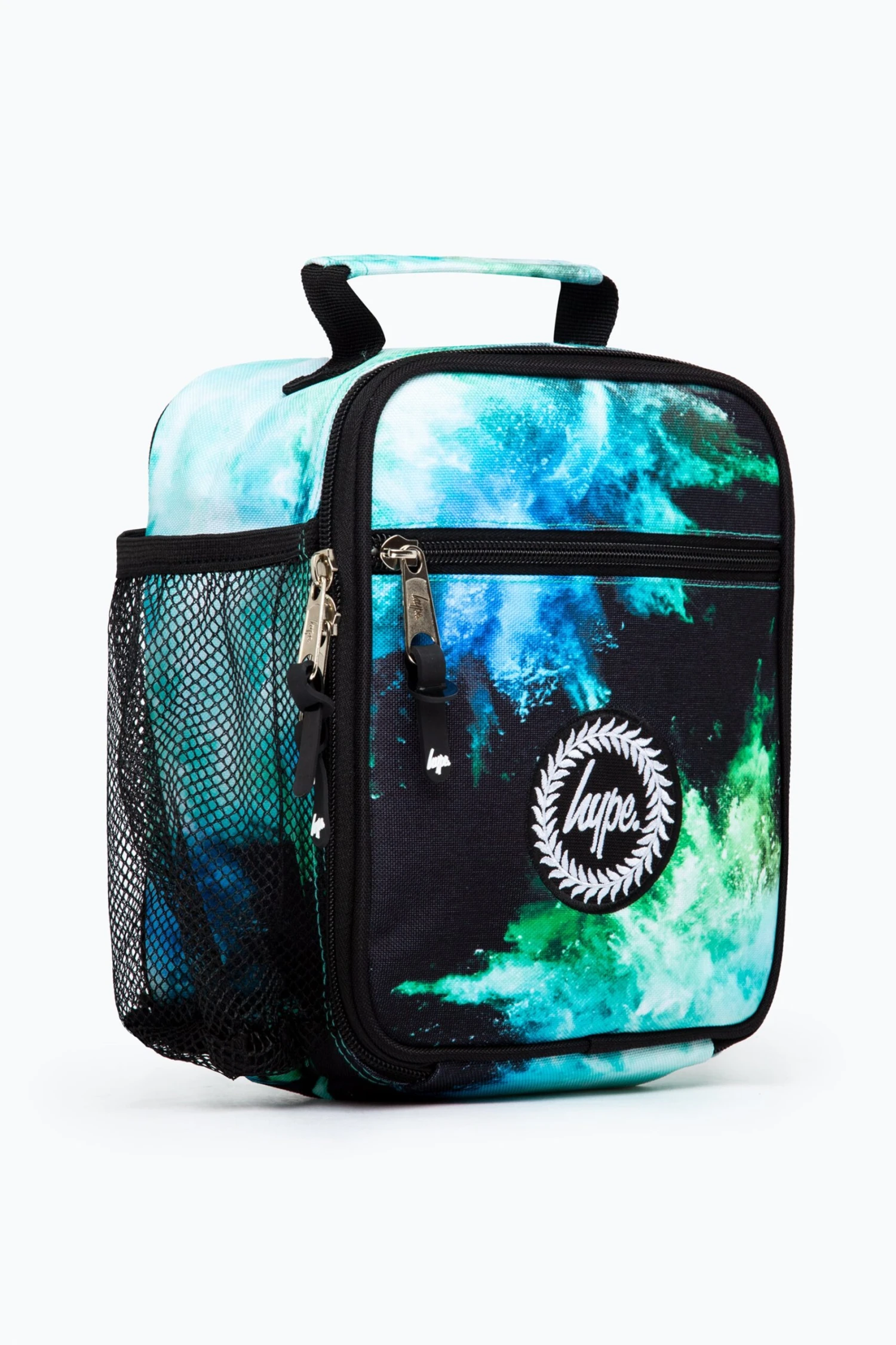 Meet the HYPE. Blue & Green Chalk Dust Lunchbox, part of the HYPE. 2022 Back to School collection. Designed in our standard lunch box shape with thermal lining to keep more food fresh for longer. Made from 100% polyester, featuring a grab handle, embroidered crest branding, rubber zip puller, and all-over blue and green chalk dust print. Bundle up with the matching backpack, drawstring bag, pencil case, wallet, and water bottle to start the school year in style. Wipe clean only.