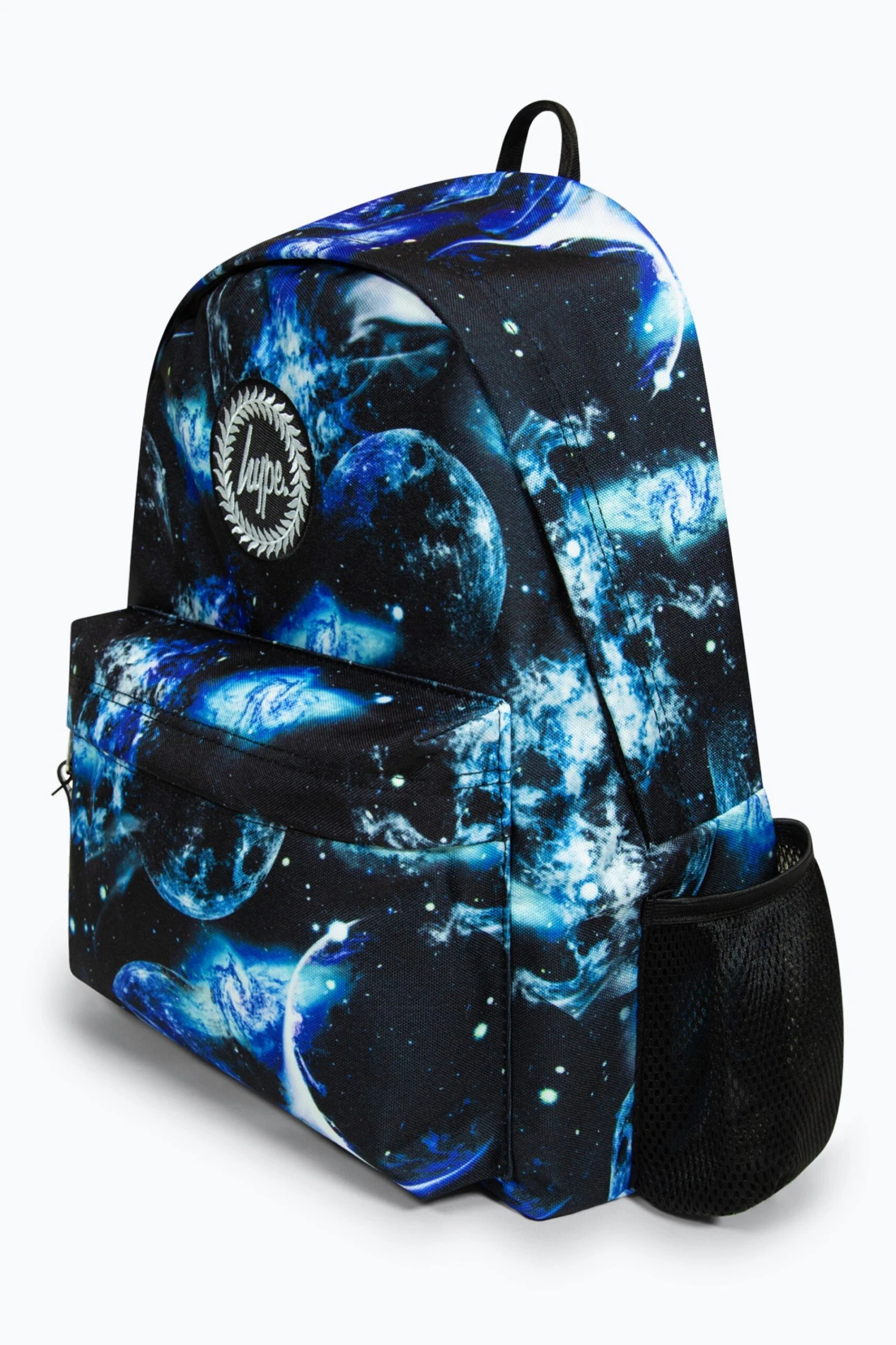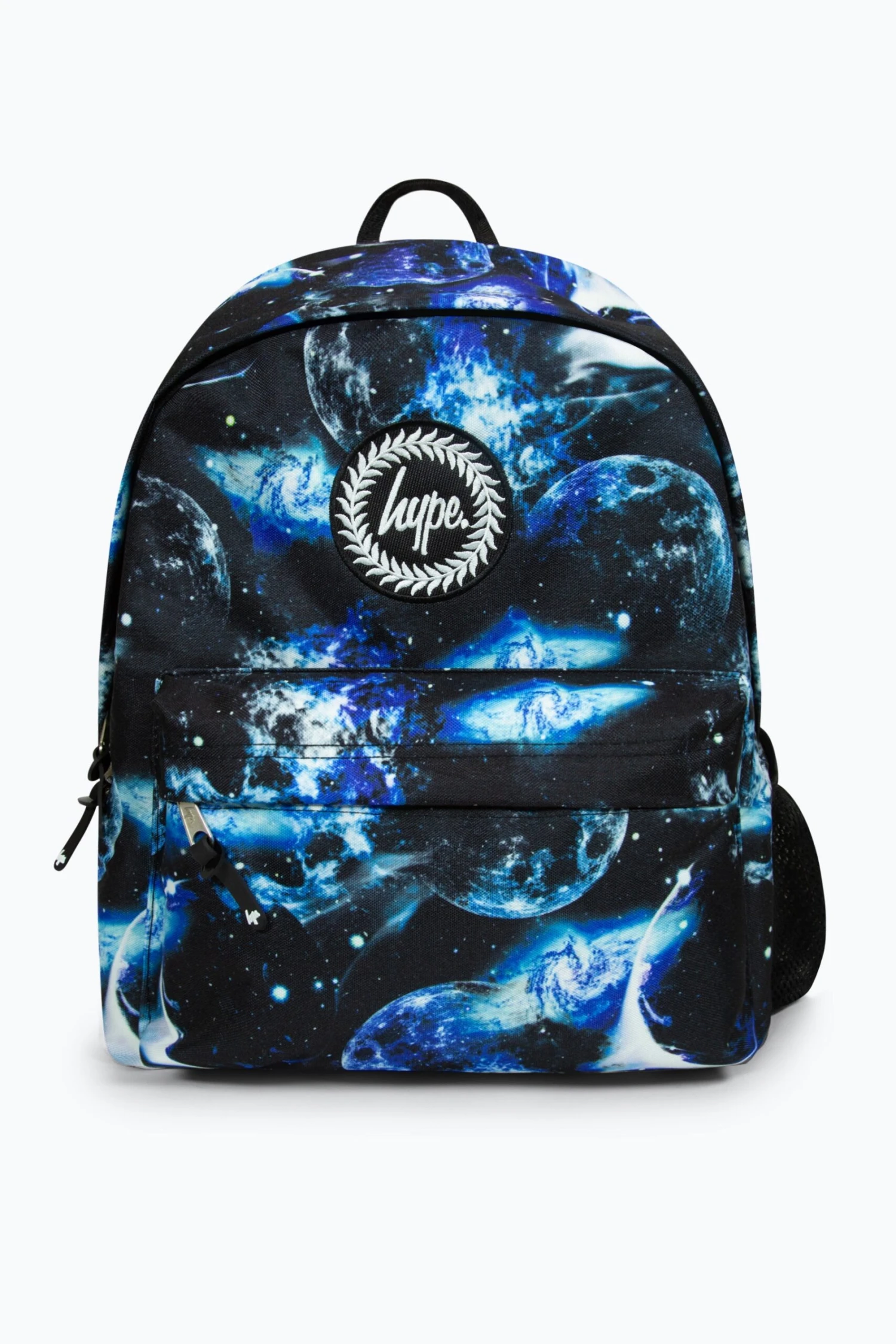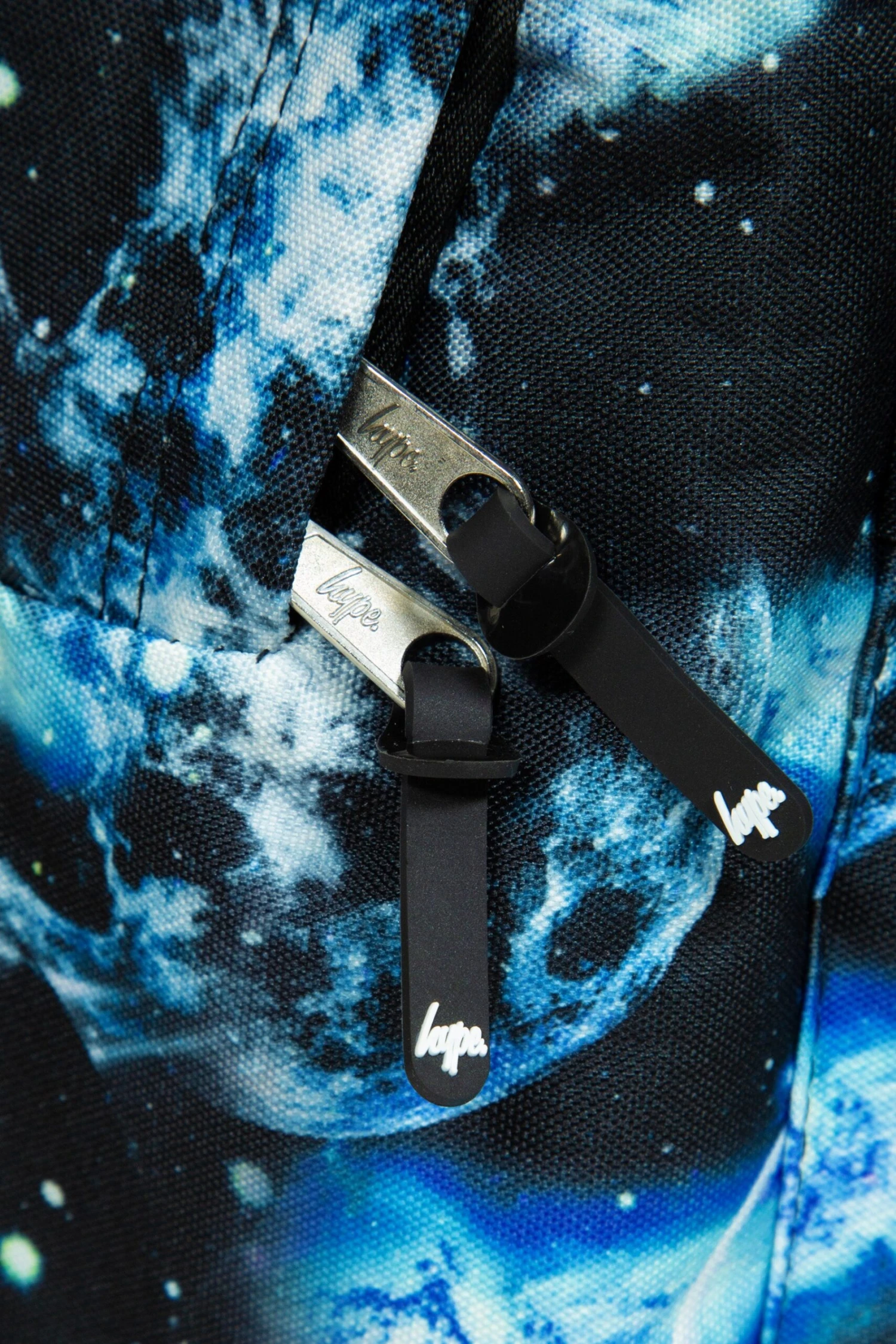 The HYPE. Blue Moons Badge Backpack is your new accessory staple. With an all-over galaxy moon inspired print in a tonal blue colour palette. Measuring at 42cm x 30cm x 12cm, finished with a front mini pocket, grab handle, embossed zips, branded inside lining. Boasting the iconic HYPE. crest badge in monochrome embroidered on the front and straps offer supreme comfort with just the right amount of padding on the back. This backpack features a mesh side bottle holder and inside padded laptop sleeve and velcro fastening. Wipe clean only.