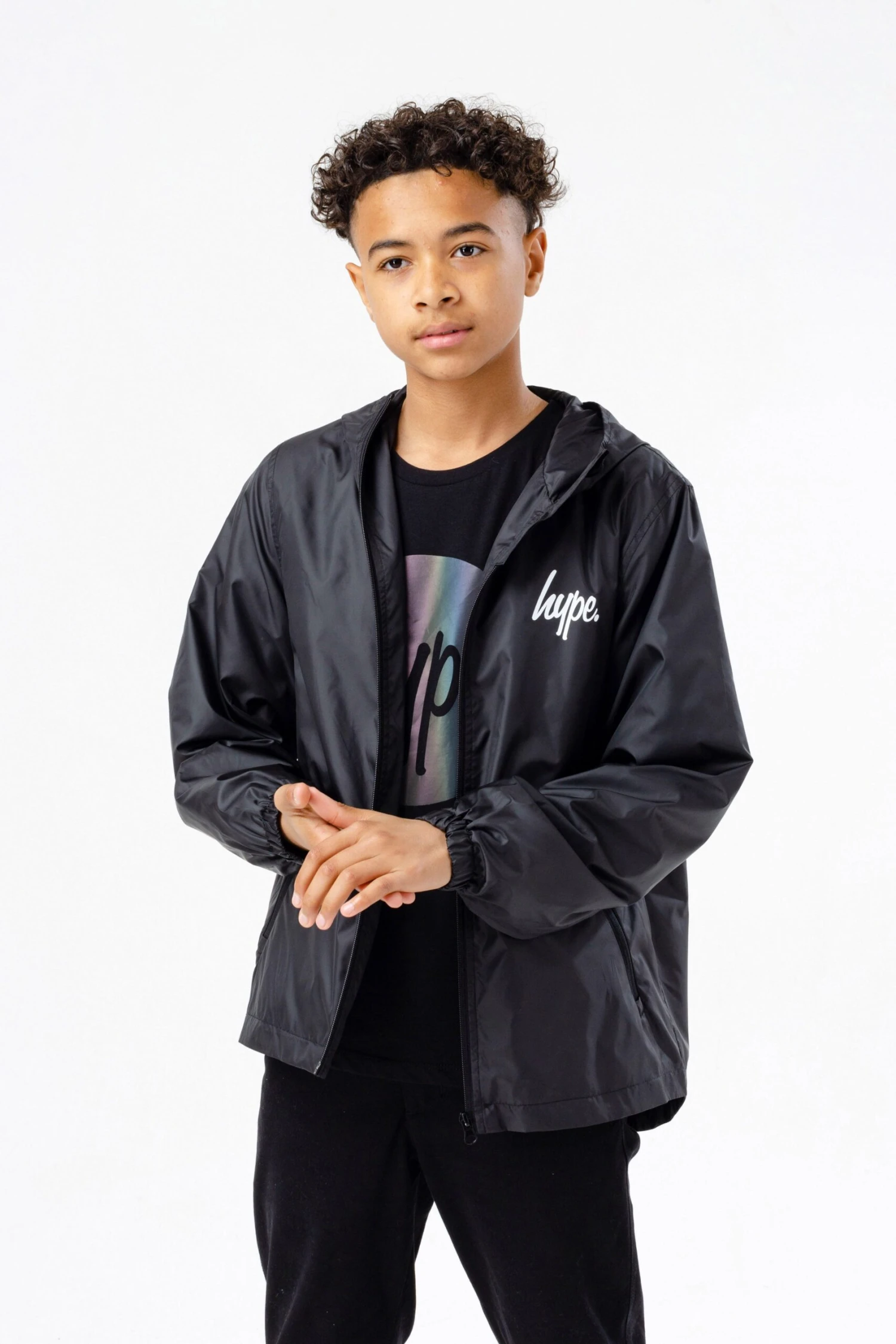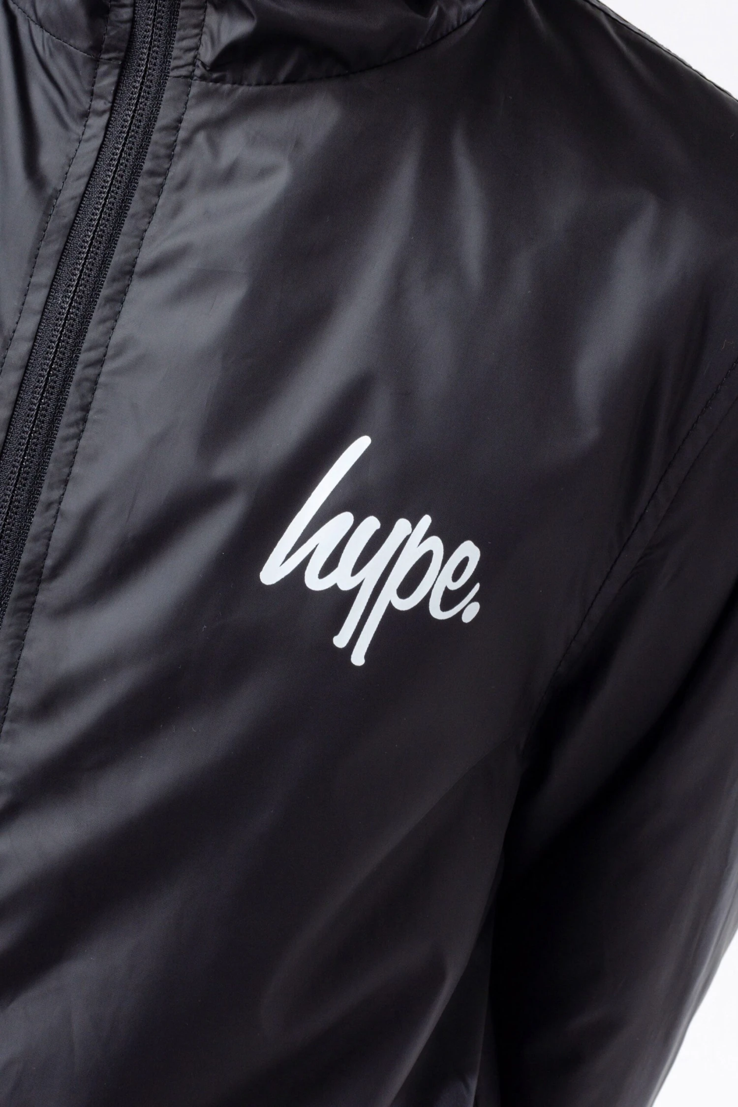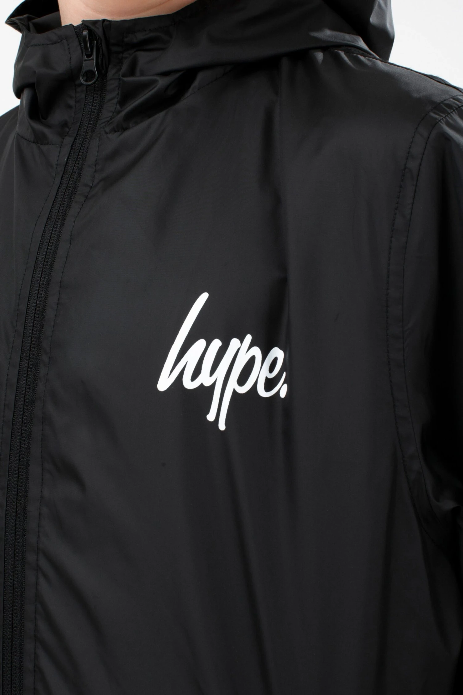 Meet the HYPE. Kids Black Runner Jacket, part of the HYPE. 2022 Back to School collection. Designed in our unisex kids runner jacket shape in black and boasting the mini HYPE. script logo in a contrasting white on the front. Finished with a fixed hood, mesh lining, zip pockets and elasticated cuffs. Machine wash at 30 degrees.