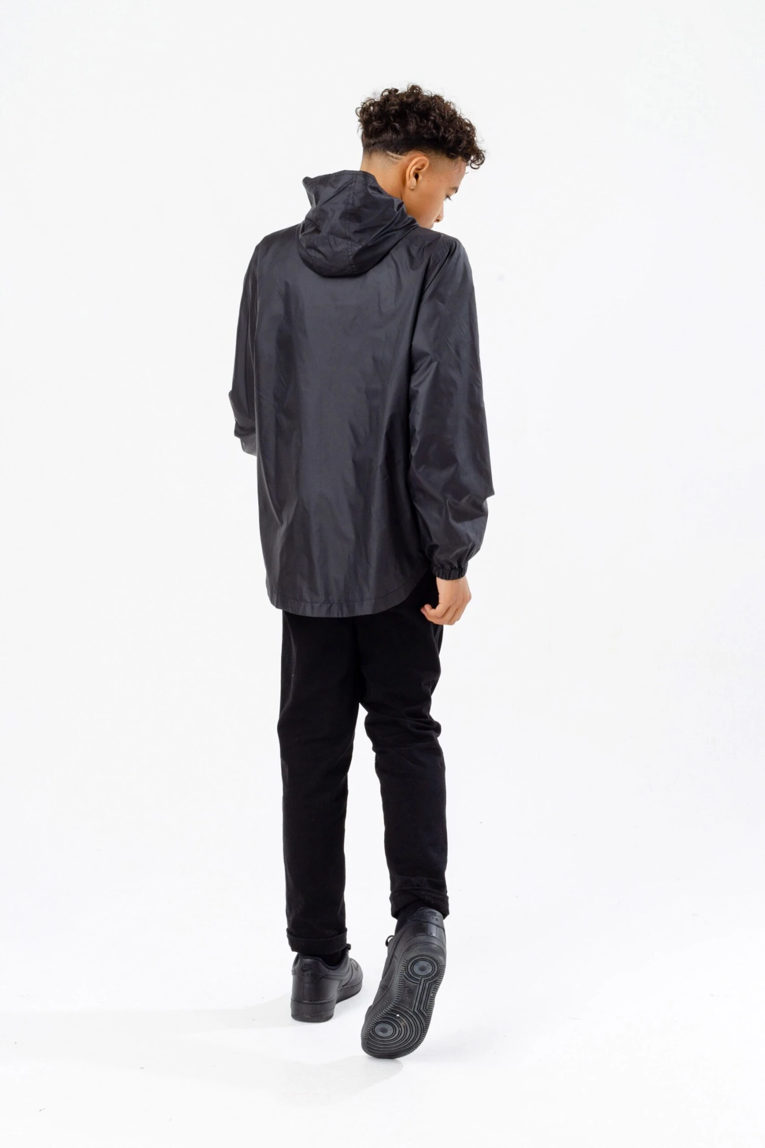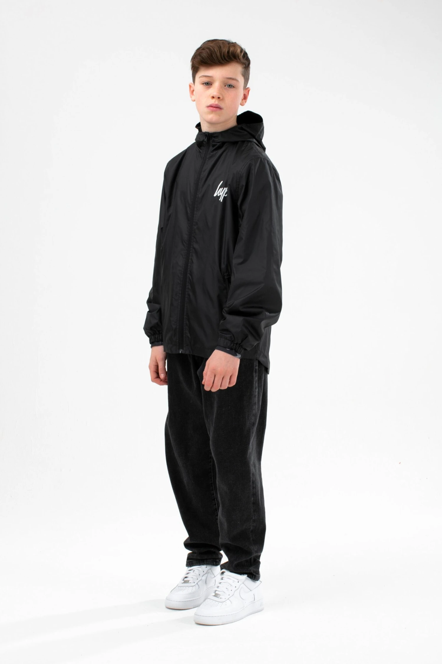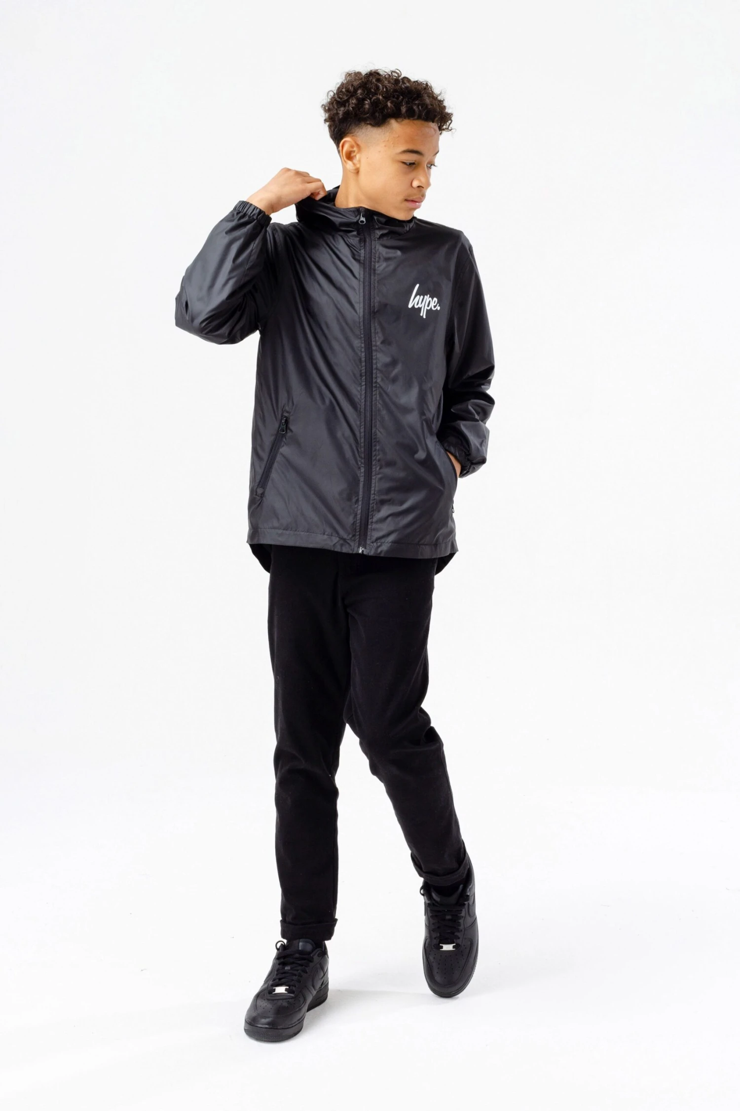 Meet the HYPE. Kids Black Runner Jacket, part of the HYPE. 2022 Back to School collection. Designed in our unisex kids runner jacket shape in black and boasting the mini HYPE. script logo in a contrasting white on the front. Finished with a fixed hood, mesh lining, zip pockets and elasticated cuffs. Machine wash at 30 degrees.