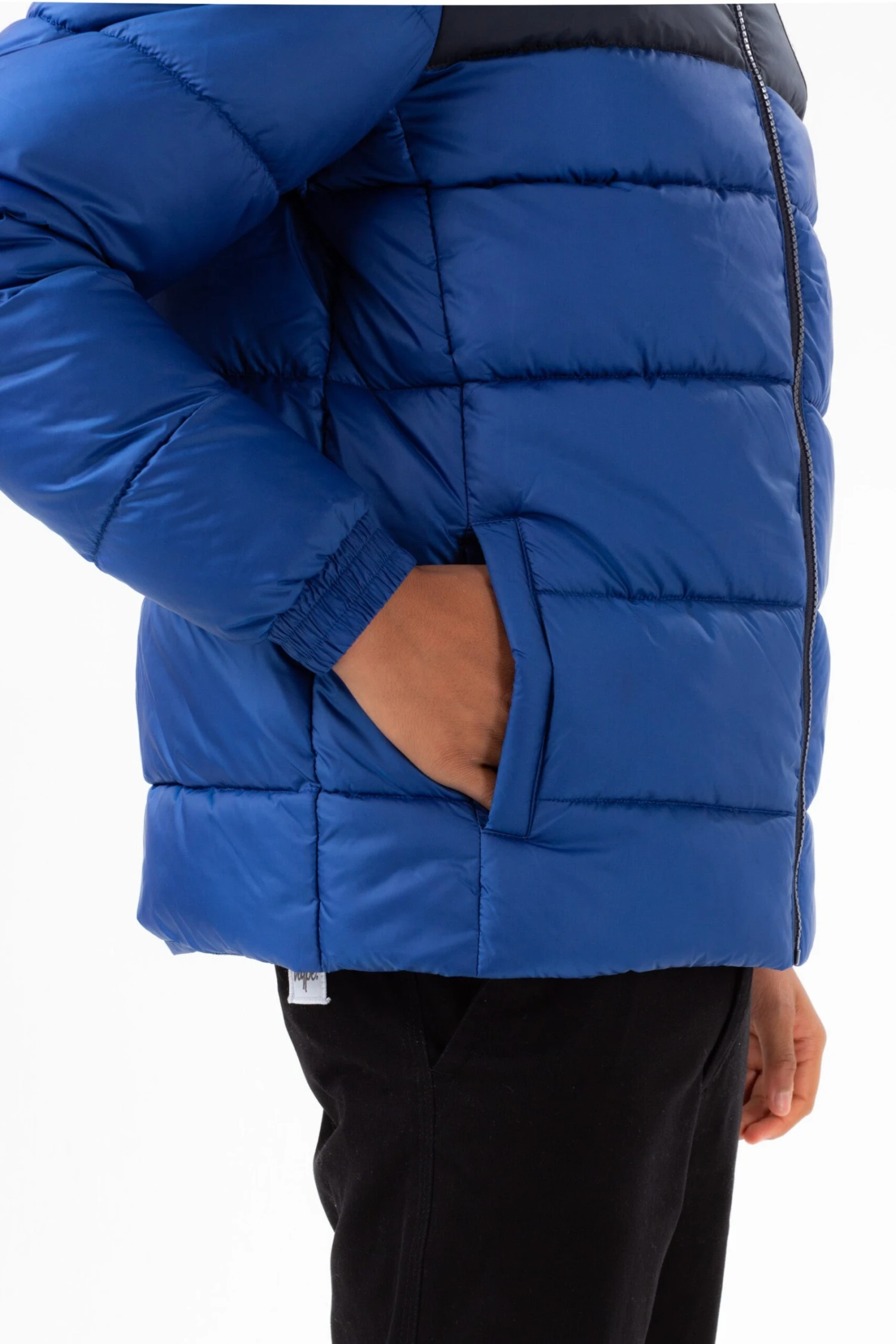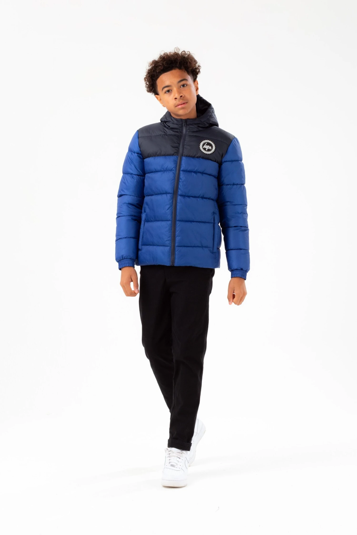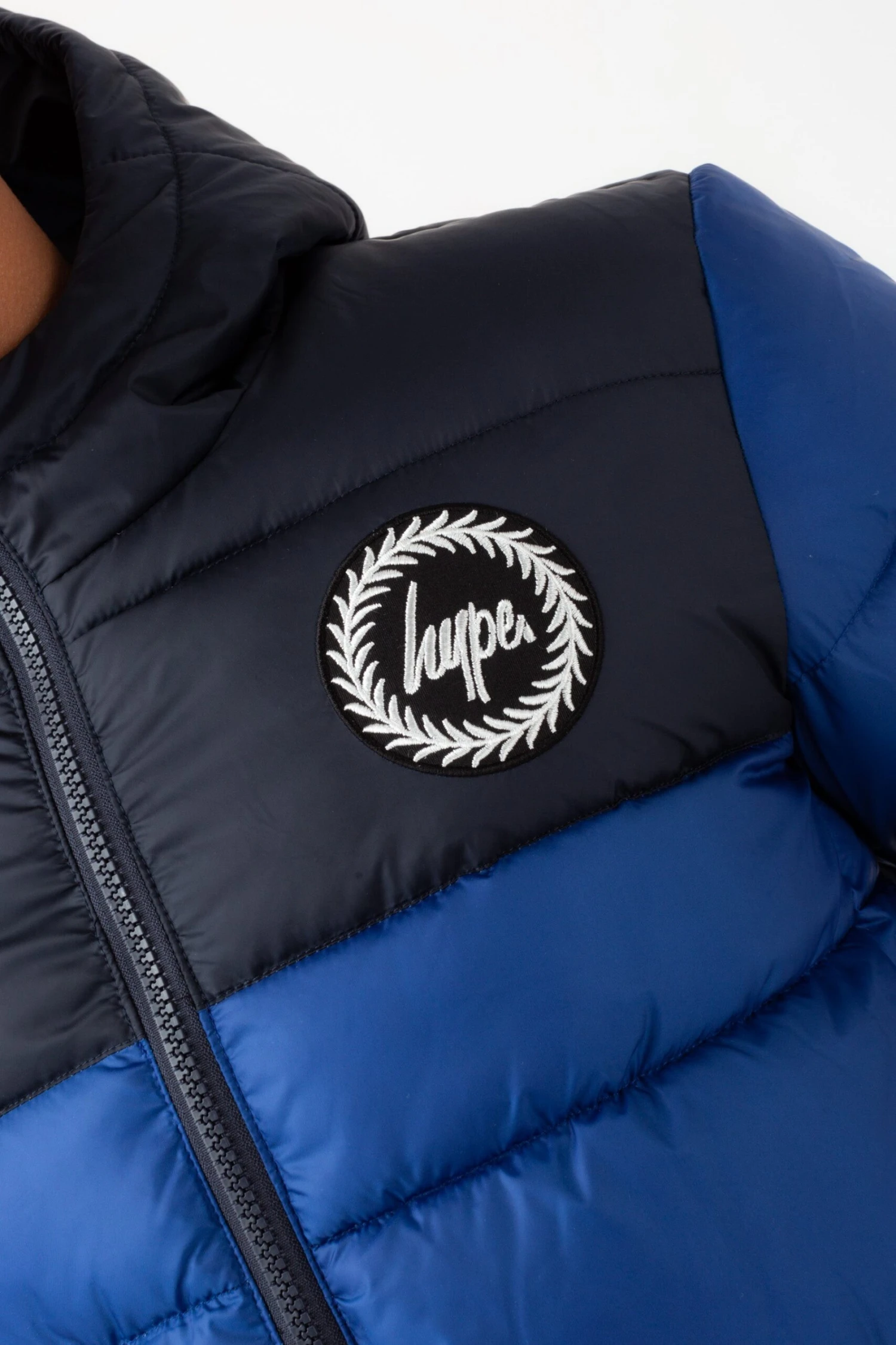 Wrap up in style this season with the HYPE. Cobalt Navy Short Padded Panel Embroidered Arm Crest Jacket. Designed in our standard kids short padded jacket shape in a navy colour palette. Finished with a fixed hood, zip, pockets, and the embroidered HYPE. crest logo on the arm. Machine washable at 30 degrees.