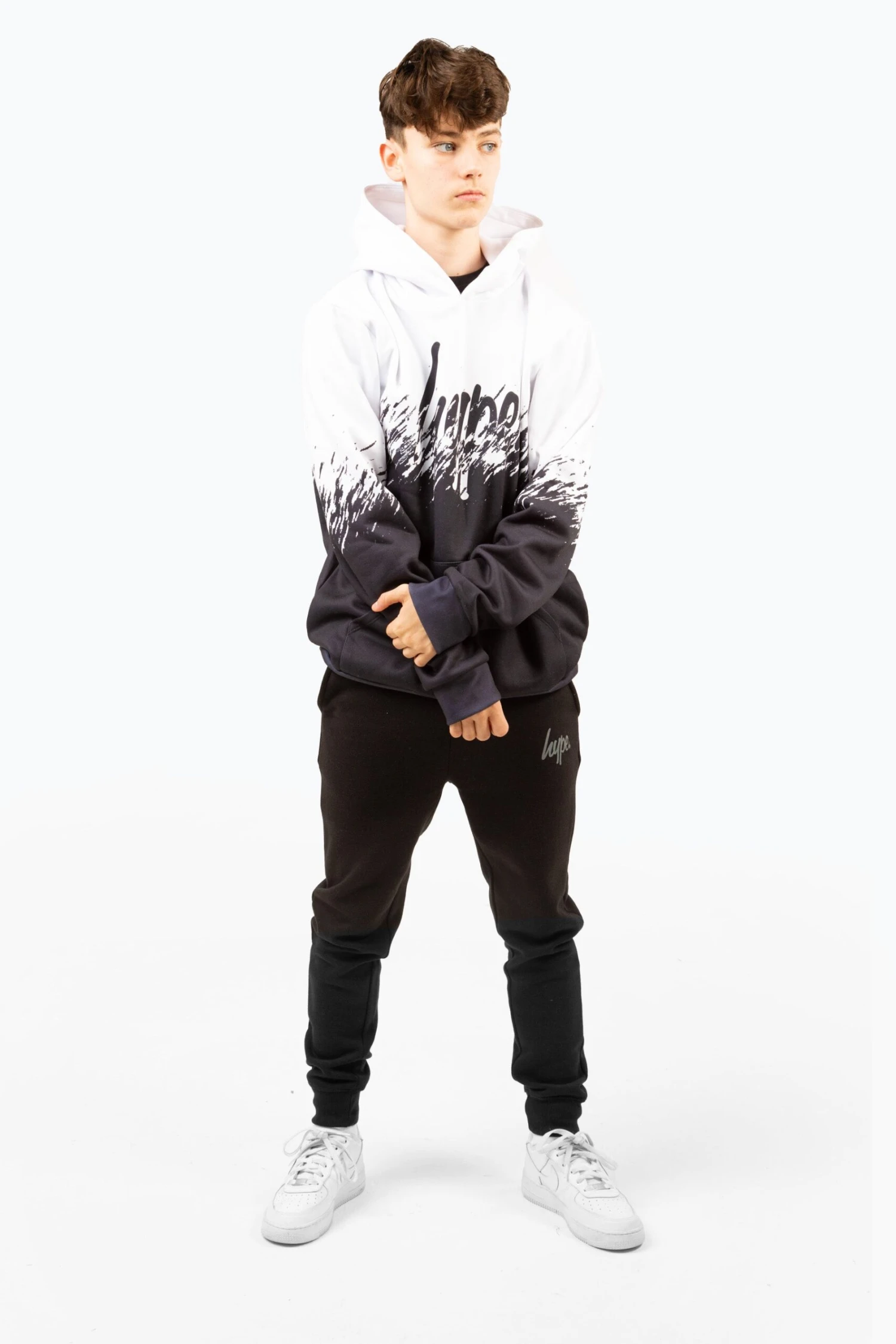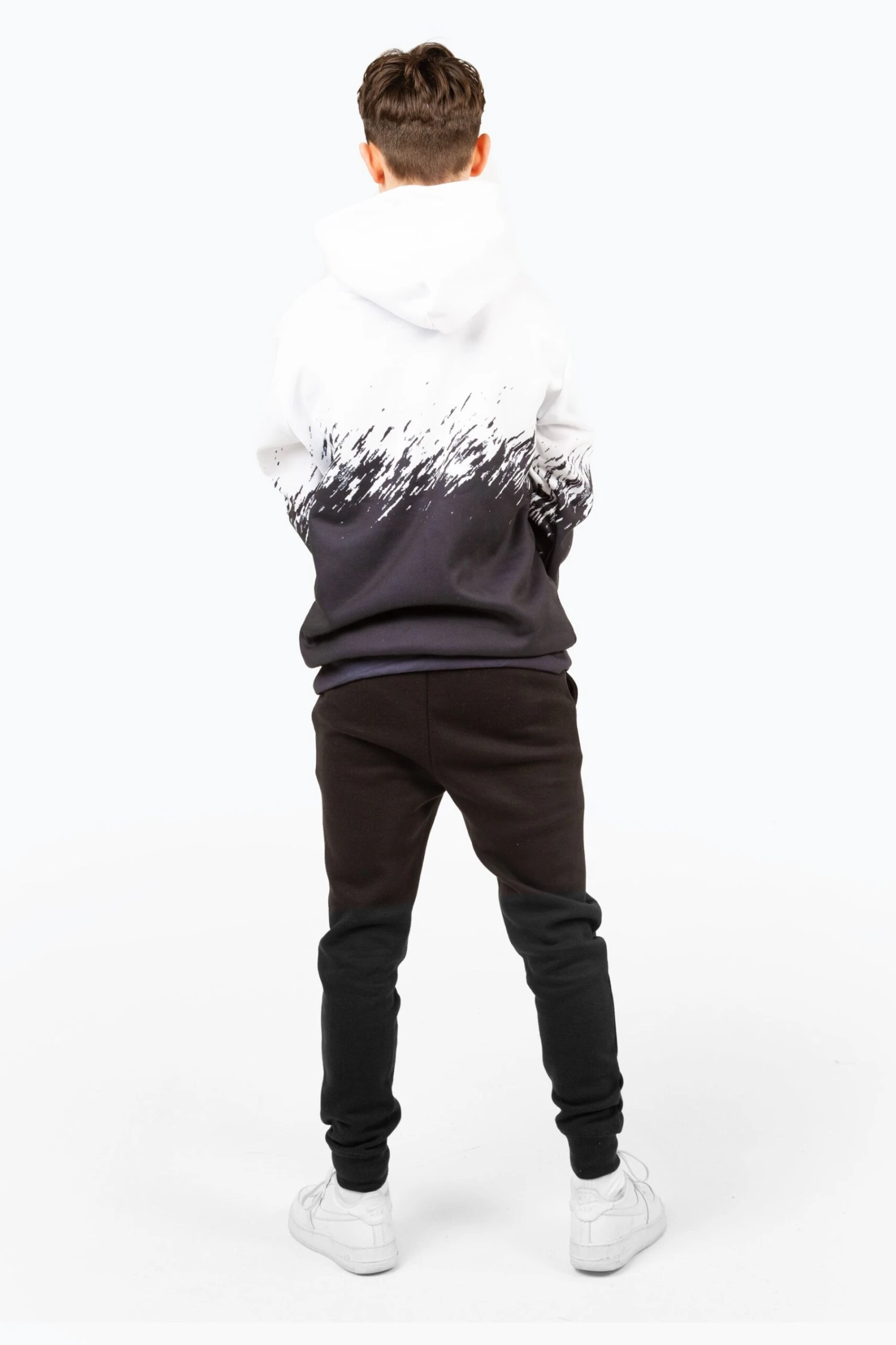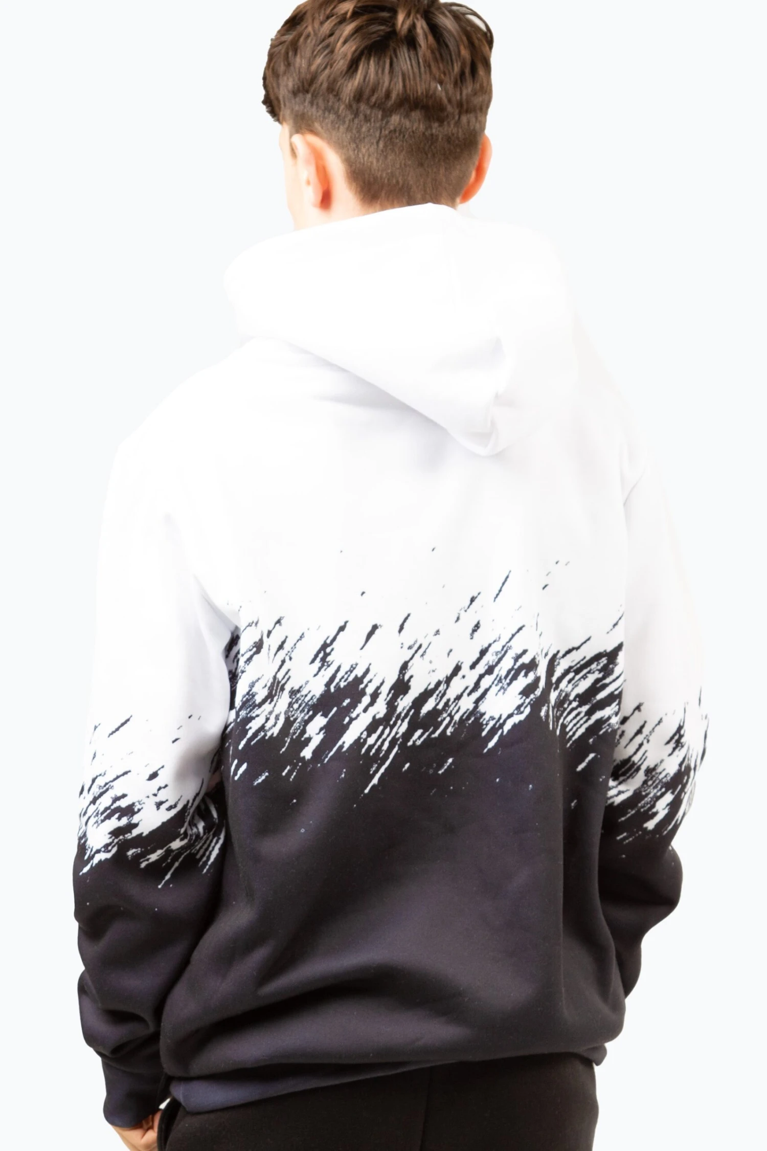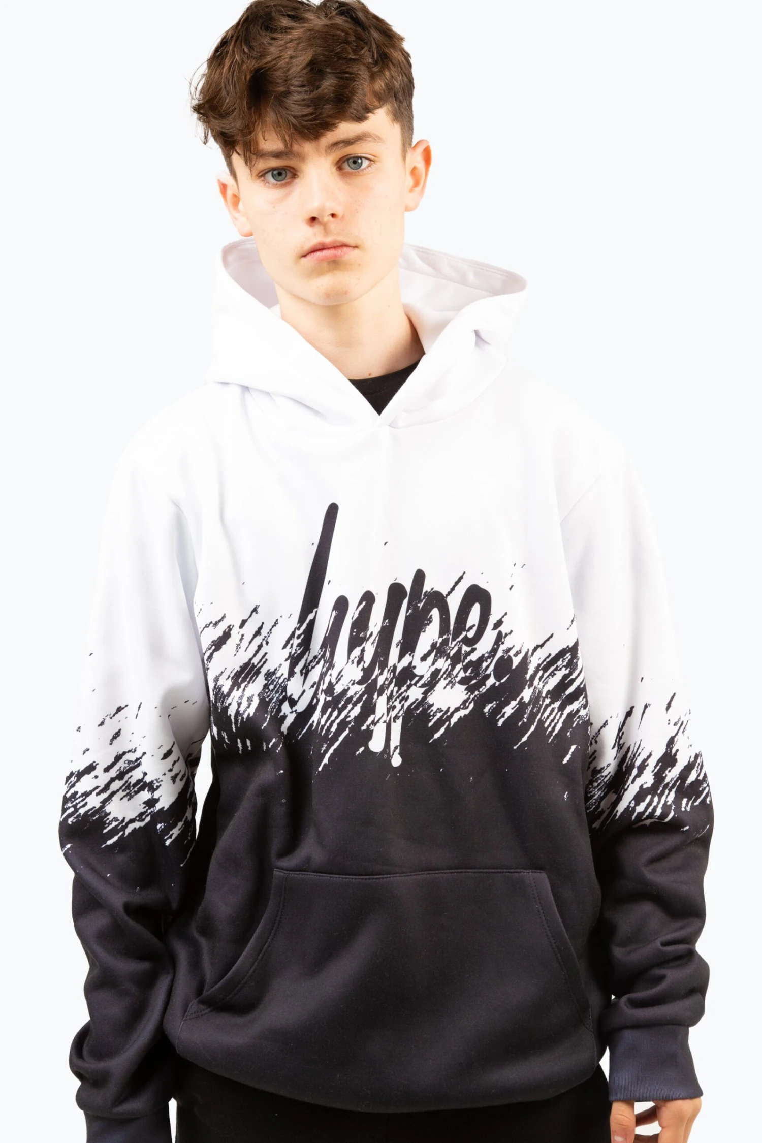 The HYPE. Boys Mono Split Hoodie is designed in a soft-touch fabric for the utmost comfort. Highlighting our standard kids pullover hoodie shape. Featuring a half and half black and white colour palette with paint stroke inspired effects across the middle of the garment with the Hype script logo across the front. Finished with a fixed hood, kangaroo pocket and fitted hem and cuffs. Machine wash at 30 degrees.