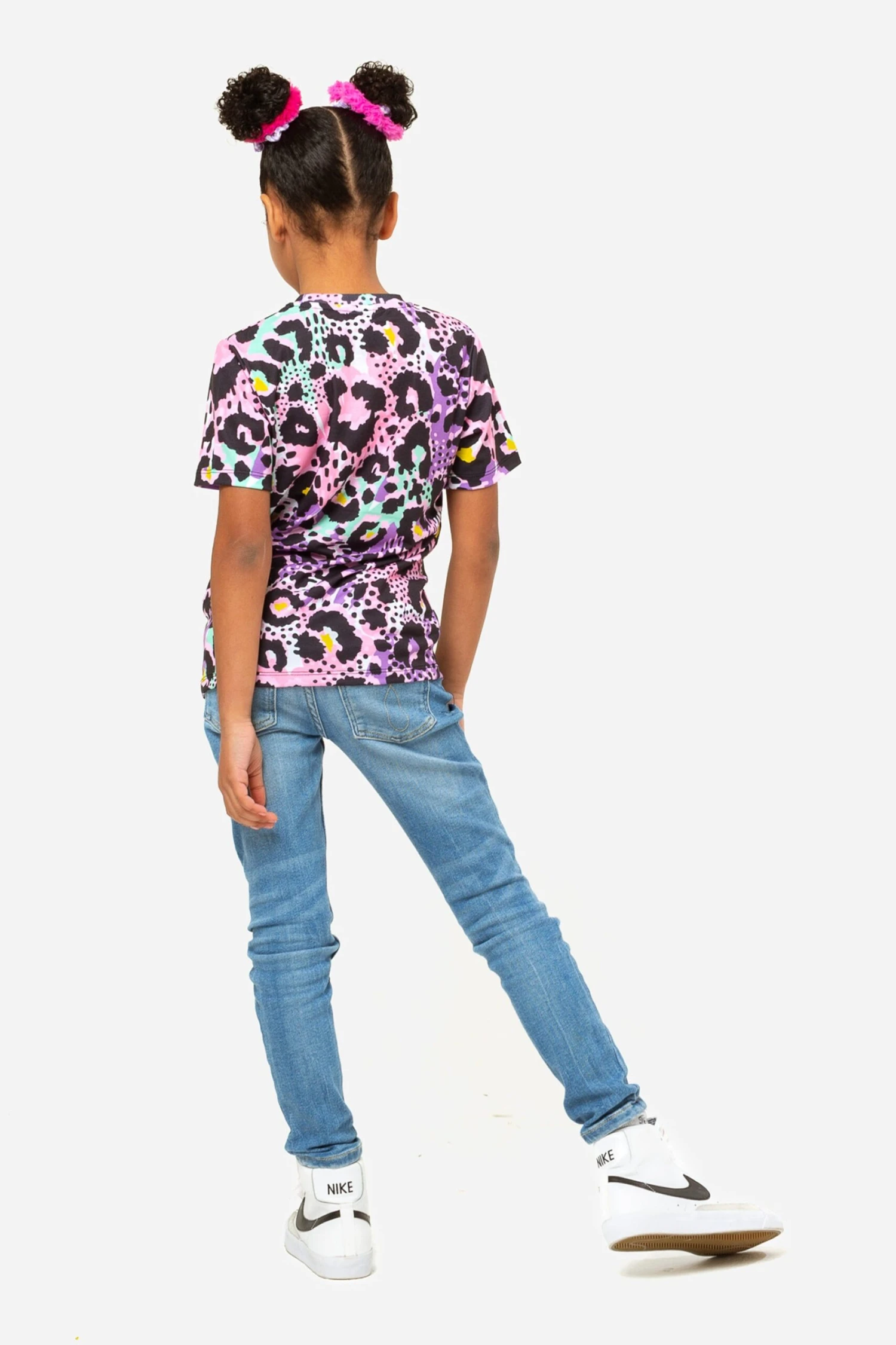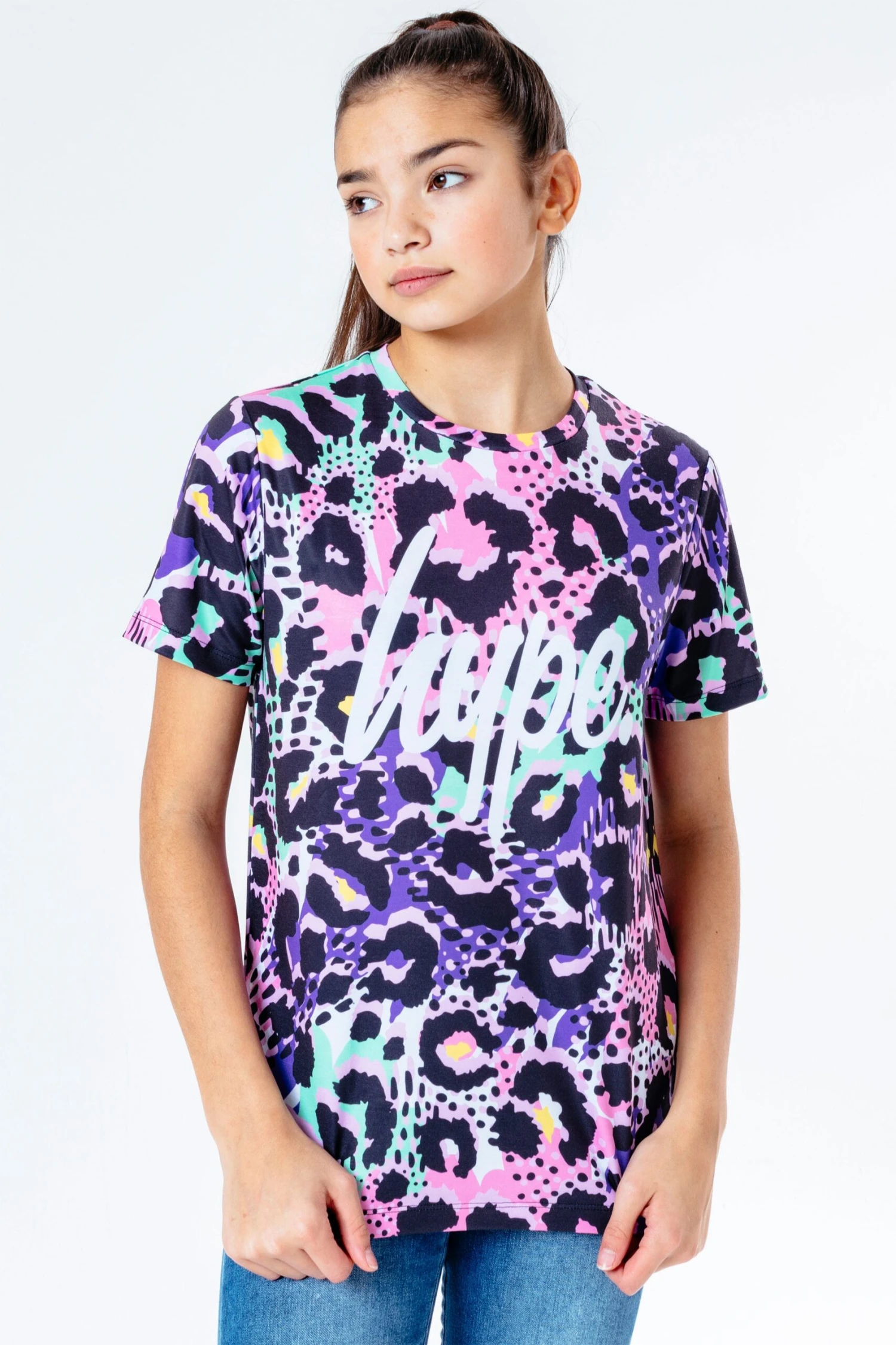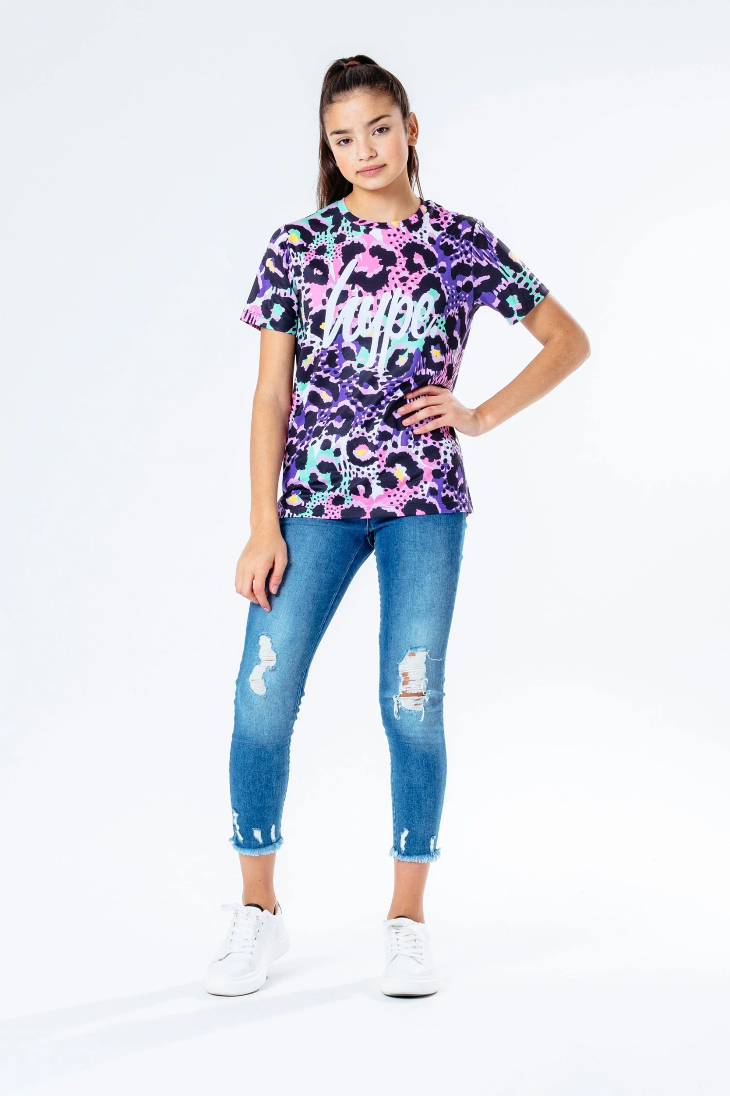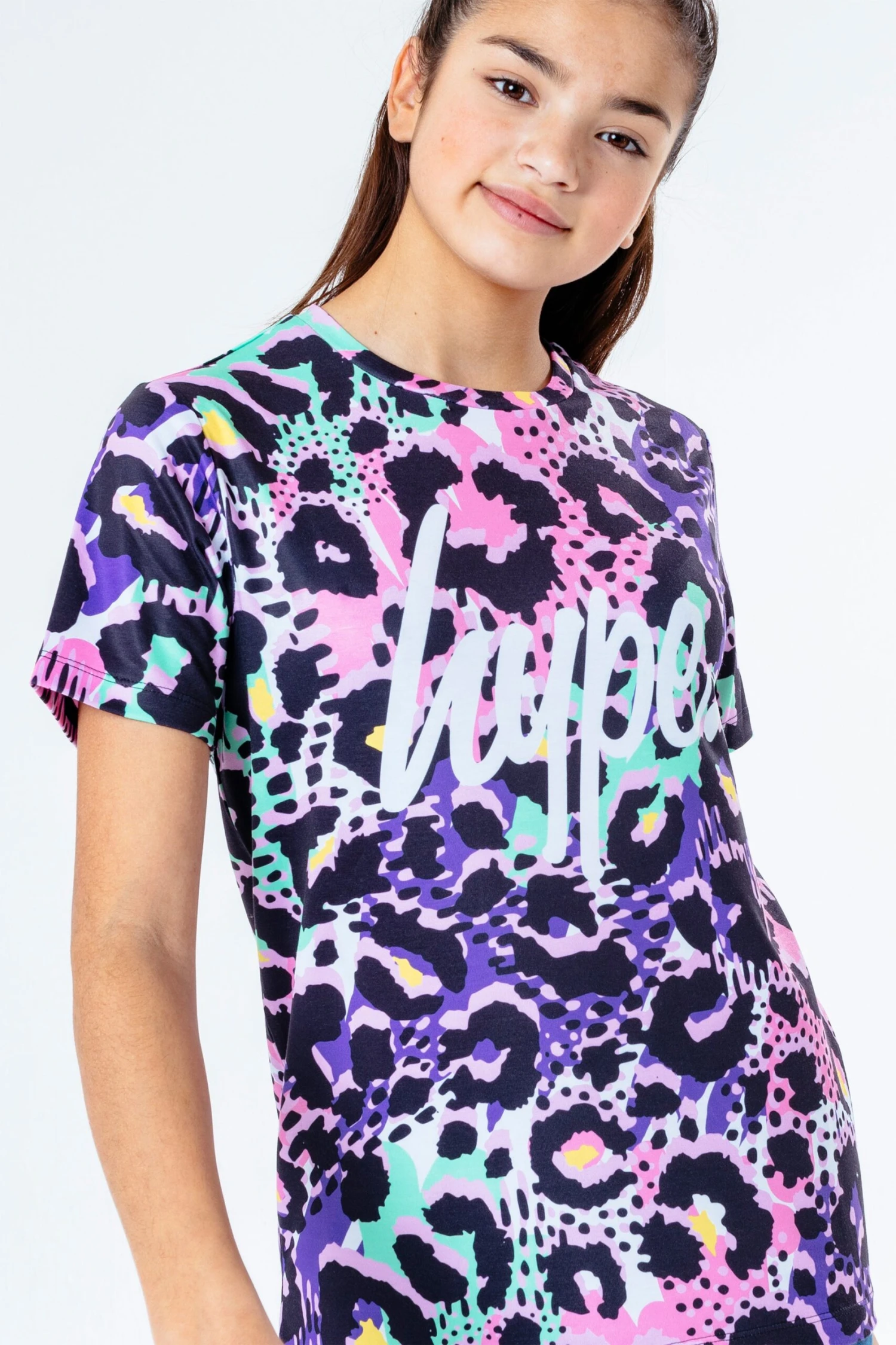 The HYPE. Chic Animal Script Kids T-shirt, your perfect go-to tee. Designed in a 95% Polyester and 5% Elastane fabric base for supreme comfort and perfect amount of breathable space. Featuring our animal-skin-inspired design in an all-over-print with a peach, purple, pink, green and orange colour palette. Highlighting a crew neckline and short sleeves for a classic fit. Finished with the iconic HYPE. script logo in a contrasting white across the front. Wear with denim jeans, oversized jacket and trainers to complete the look. Machine washable.
