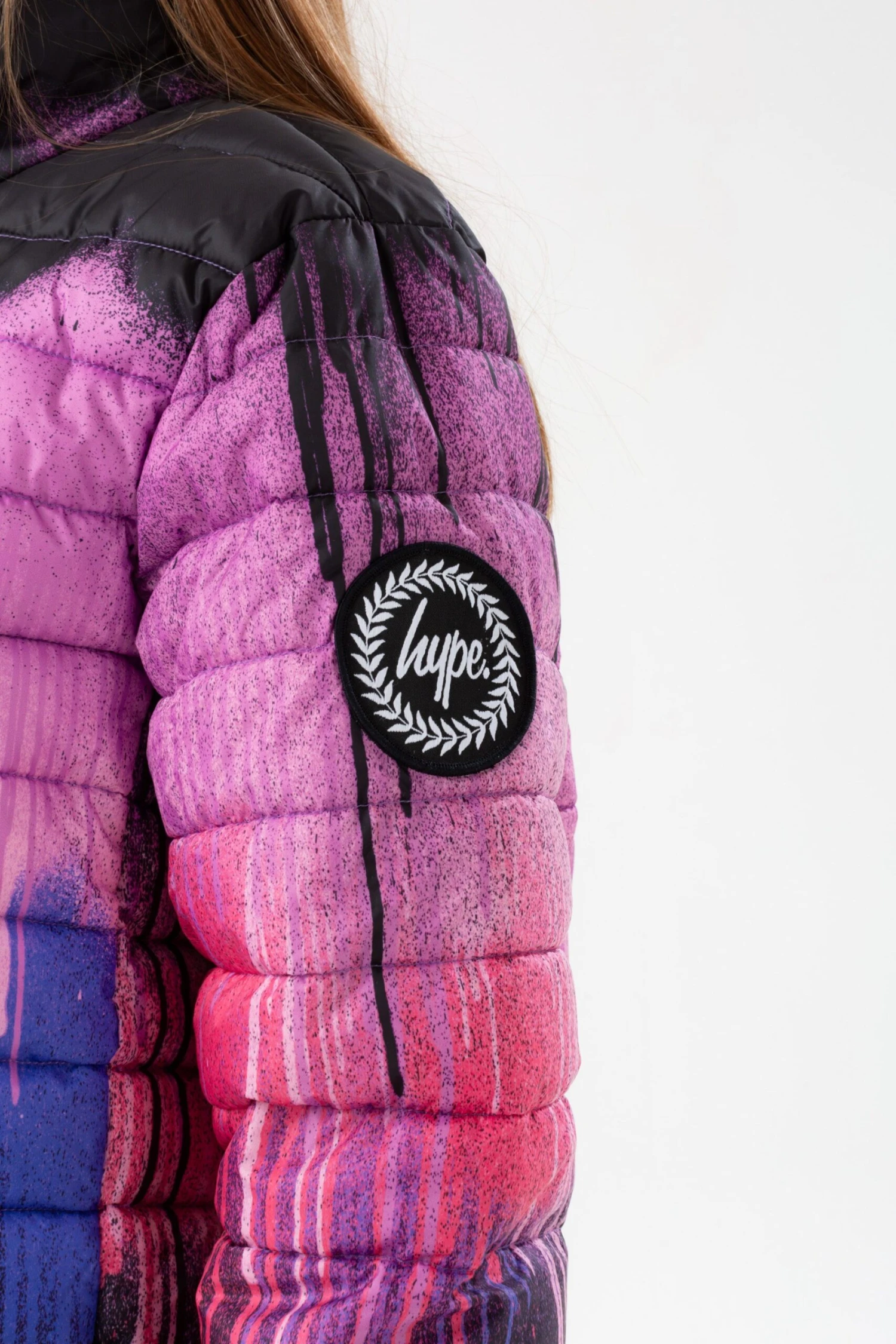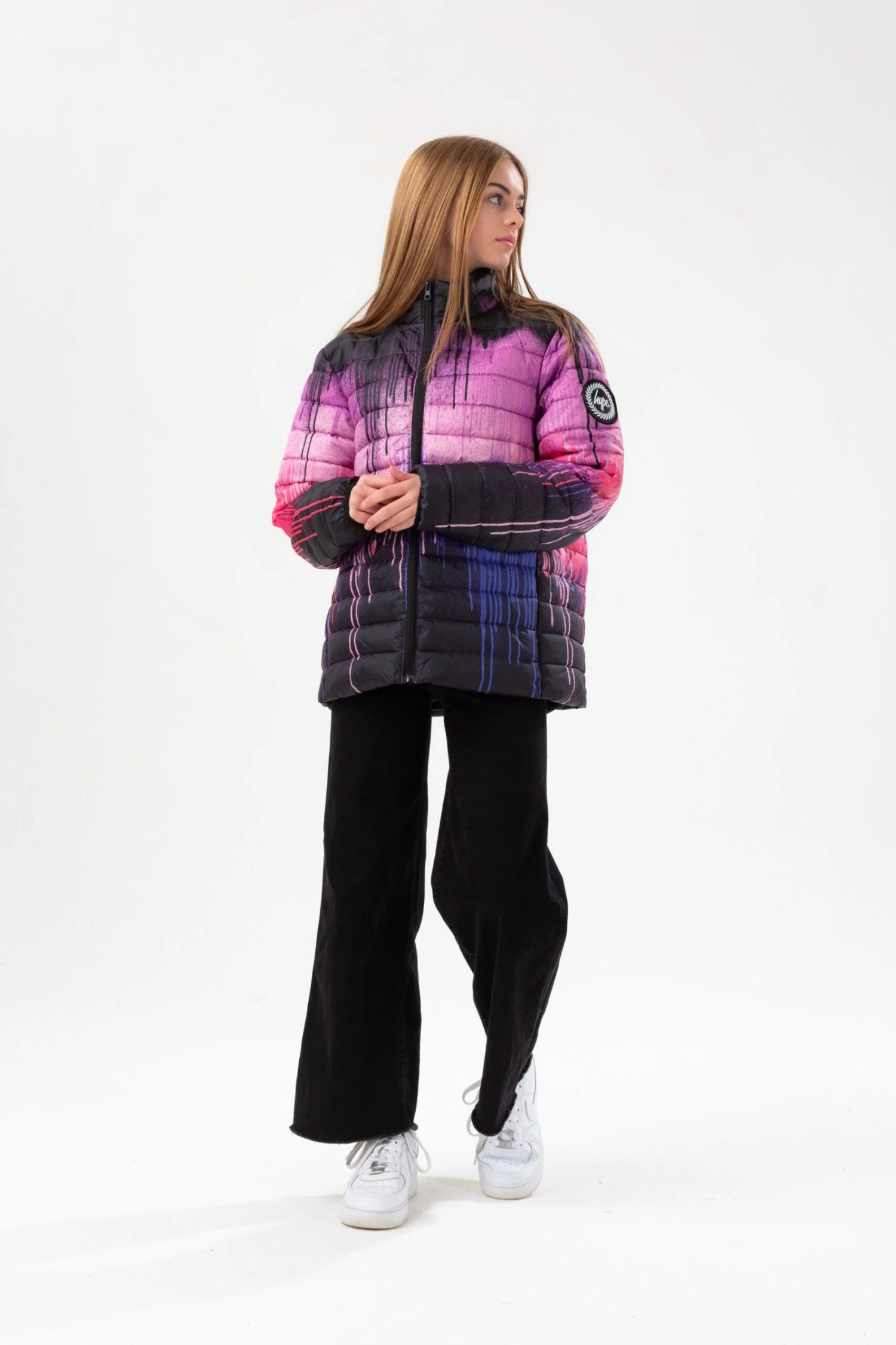 Don?t just keep cosy and warm during these colder months, do it in style with the HYPE. Girls Dark Pink Drips Short Padded Arm Crest Jacket. Designed in our standard short padded jacket shape, boasting a sublimated all-over dark pink drips print, and the iconic HYPE. crest embroidered on the sleeve. Wear with jeans and a t-shirt or a HYPE. hoodie and matching joggers for the ultimate comfortable fit. Wash inside out at 30 degrees with similar colours only.