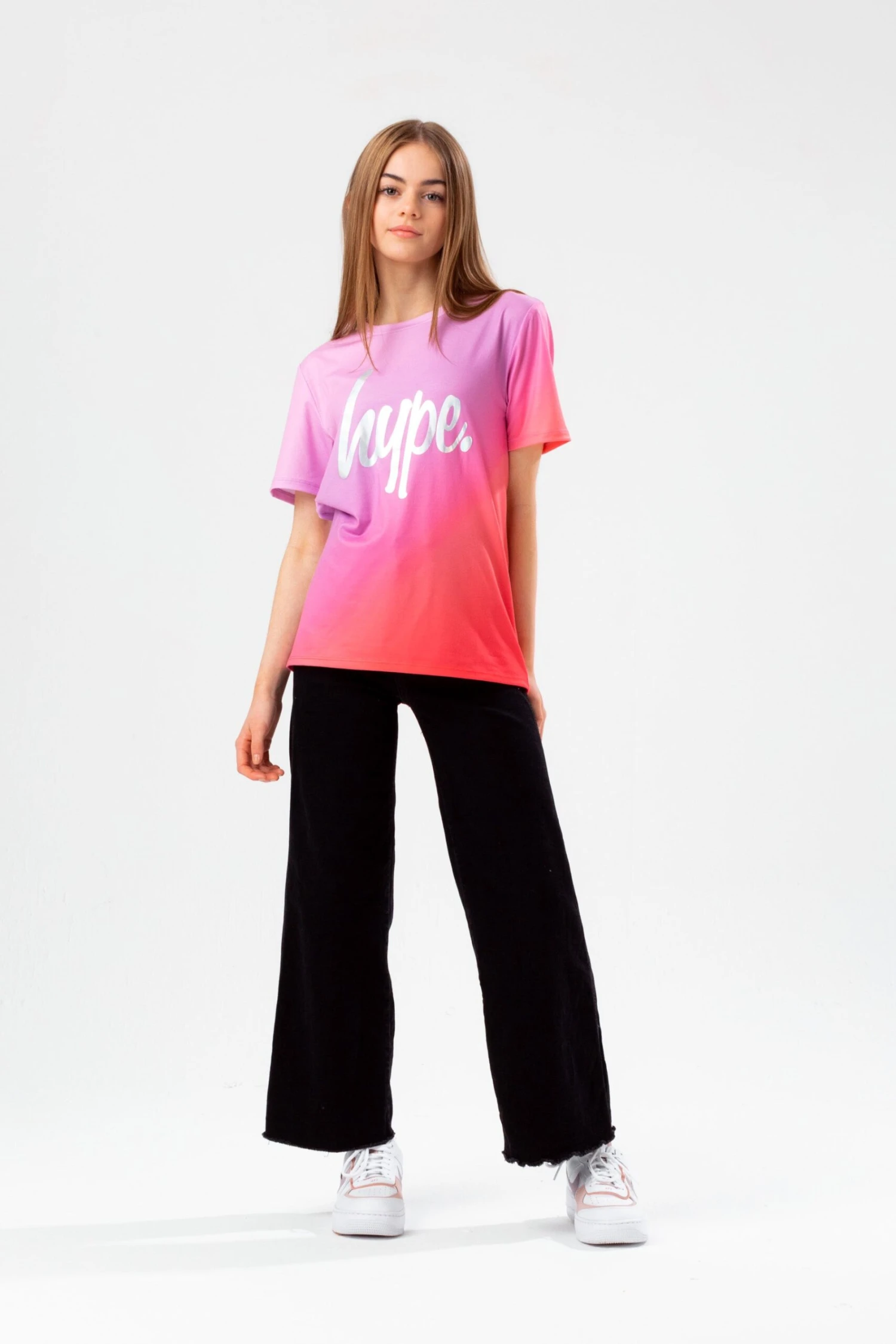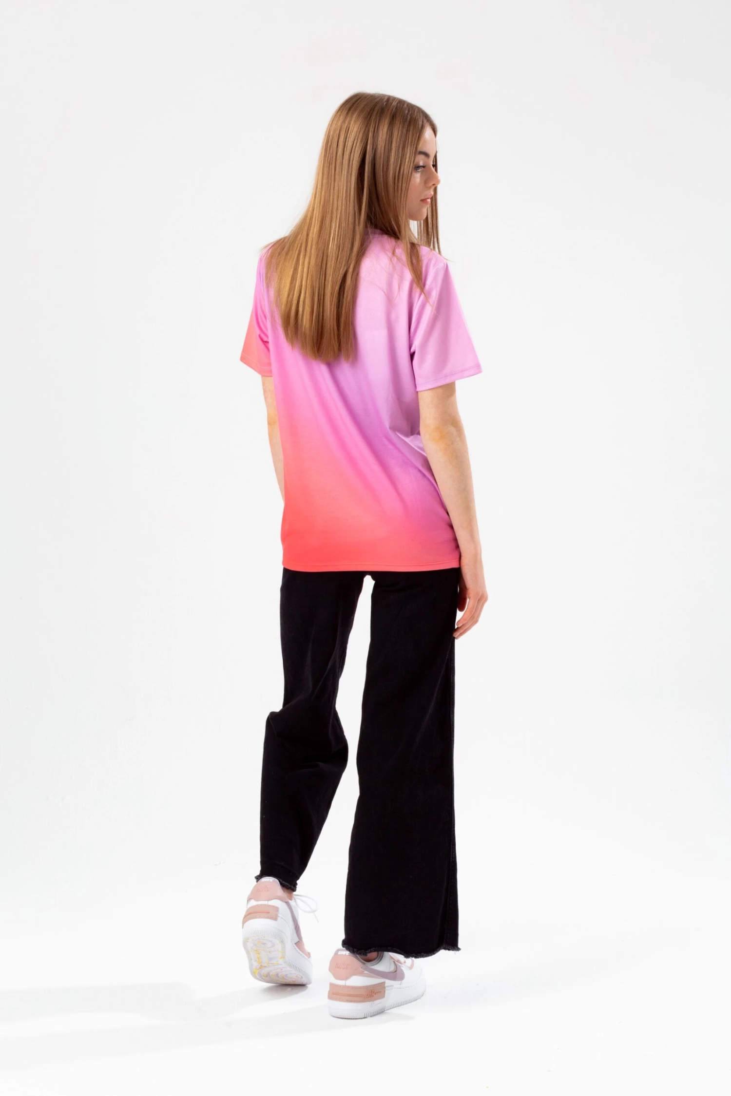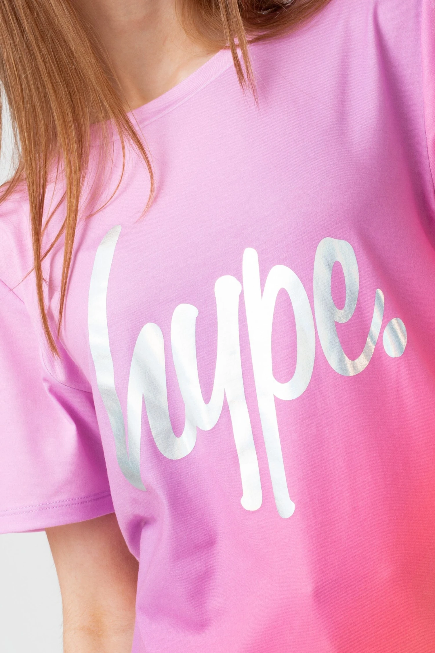 Make a statement in the HYPE. Pink Fade Holographic Script T-Shirt. Designed in a soft touch fabric blend for a supreme amount of comfort in our standard t-shirt shape. Featuring an all-over pink fade print and finished with a crew neckline, short sleeves, and the HYPE. logo in silver holographic script. Wear with a HYPE. hoodie and leggings to complete the look. Wash inside out at 30 degrees with similar colours only.