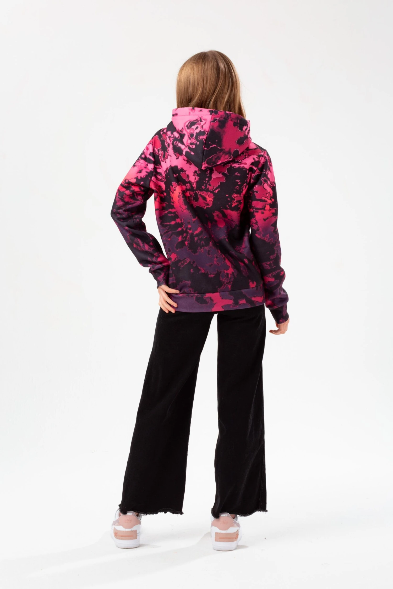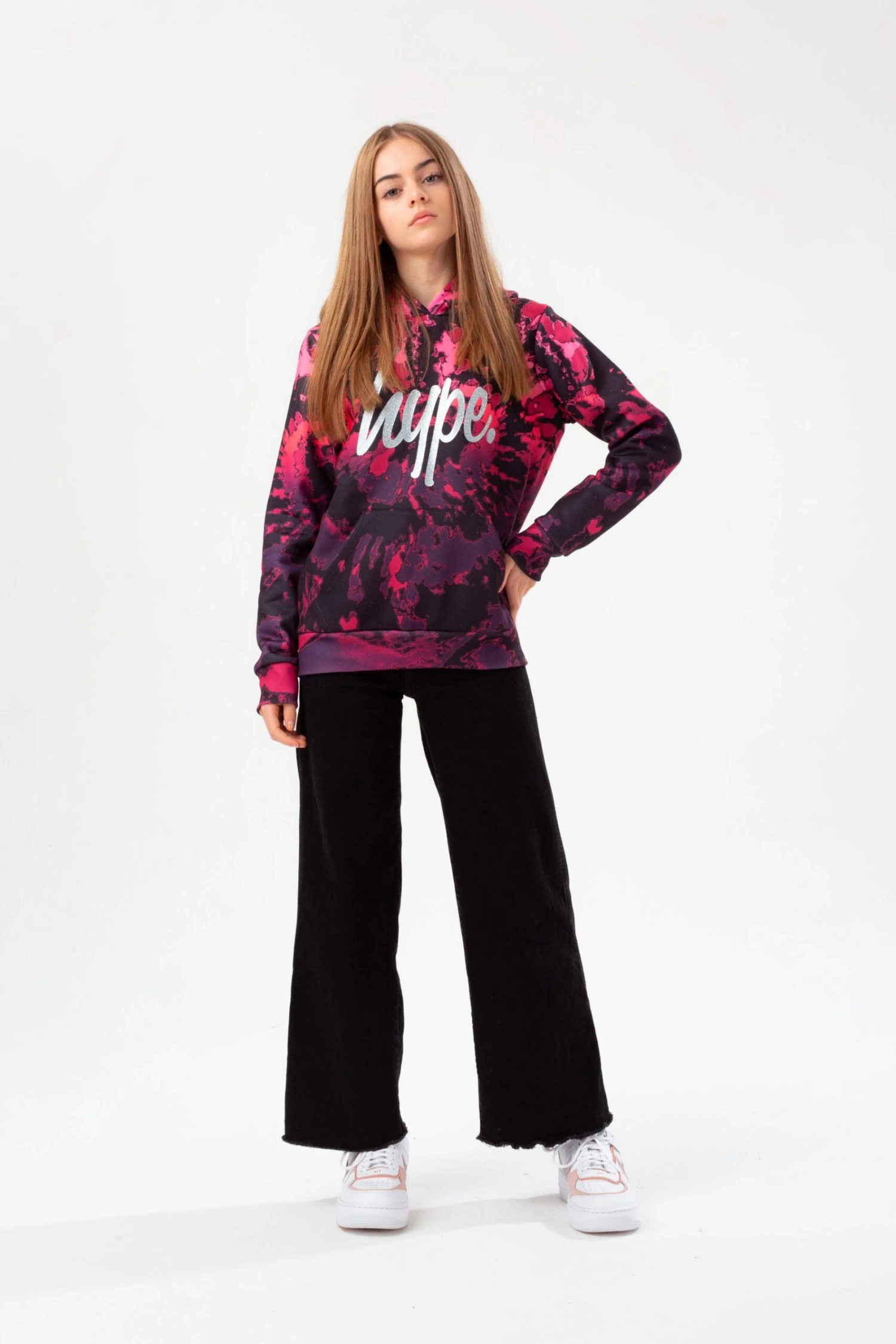 Let us introduce you to your next go-to pullover, the HYPE. Pink Fade Tie Dye Silver Glitter Script Hoodie. Designed in a 75% polyester 25% cotton fabric blend for your ultimate comfort in our standard kids hoodie shape. Featuring an all-over pink fade tie dye print and finished with a fitted hem and cuffs, kangaroo pouch, hood, and the HYPE. logo in silver glitter script. Wear with the matching t-shirt and leggings to complete the look. Machine wash at 30 degrees.