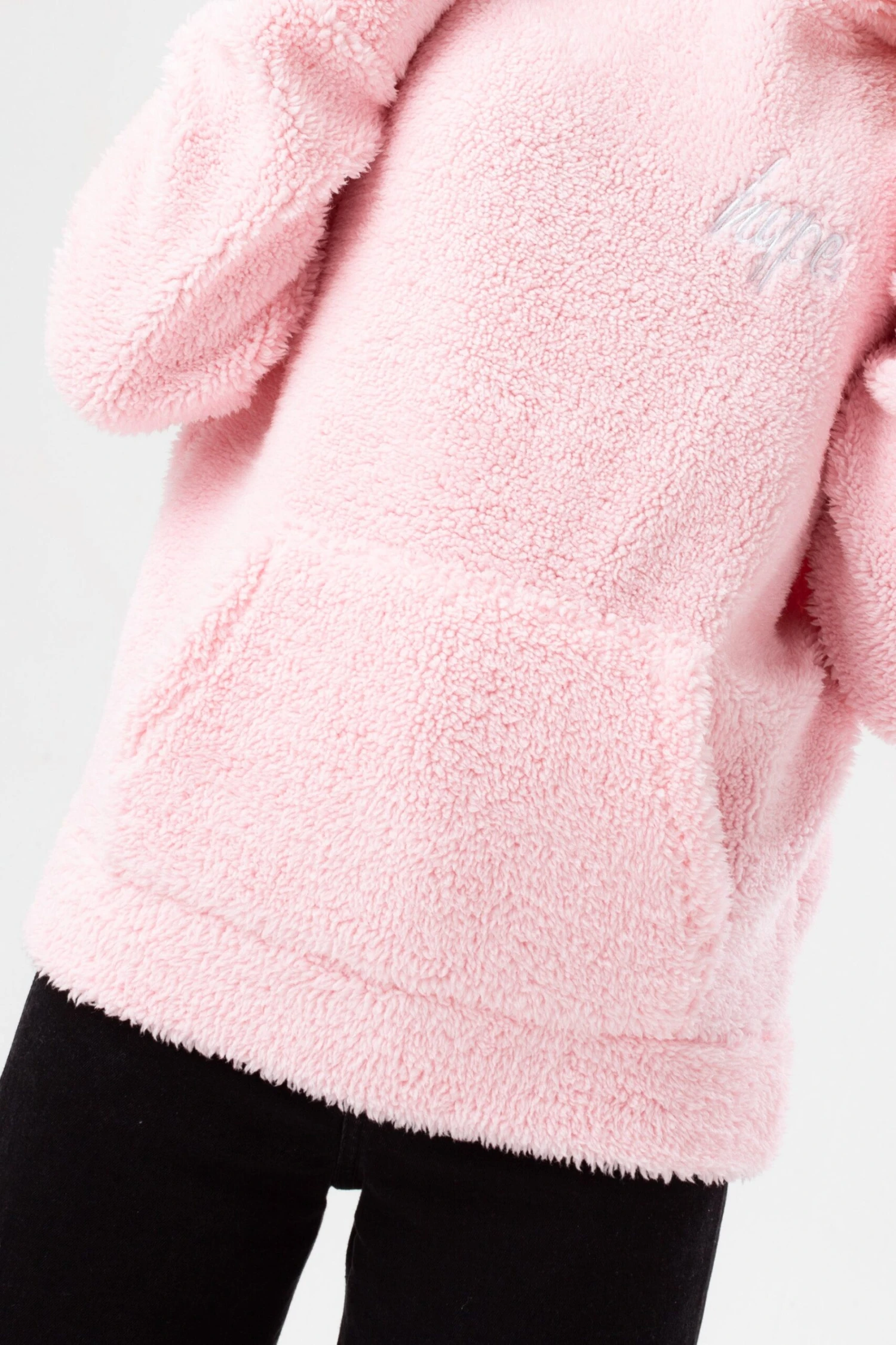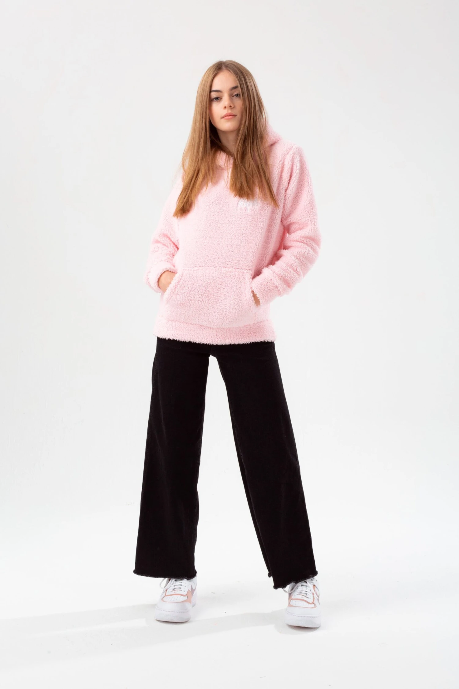 The HYPE. Girls Pink Sherpa Script Hoodie is your next go-to jumper. Designed in soft touch pink sherpa fabric for the ultimate amount of comfort in our standard kids hoodie shape. Finished with a fitted hem and cuffs, kangaroo pouch, hood, and the mini HYPE. logo in white script. Wear with a HYPE. t-shirt and leggings to complete the look. Machine wash at 30 degrees.