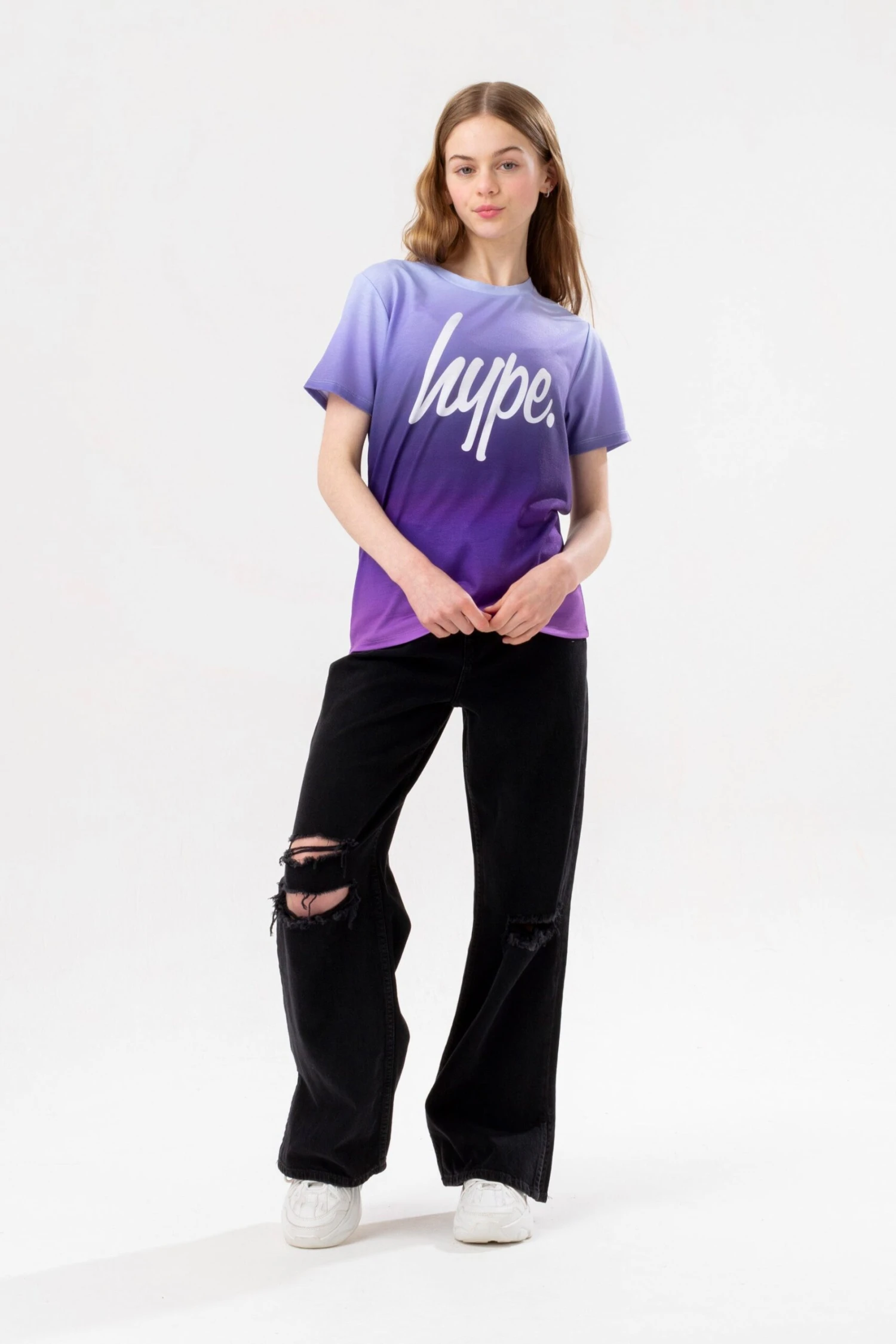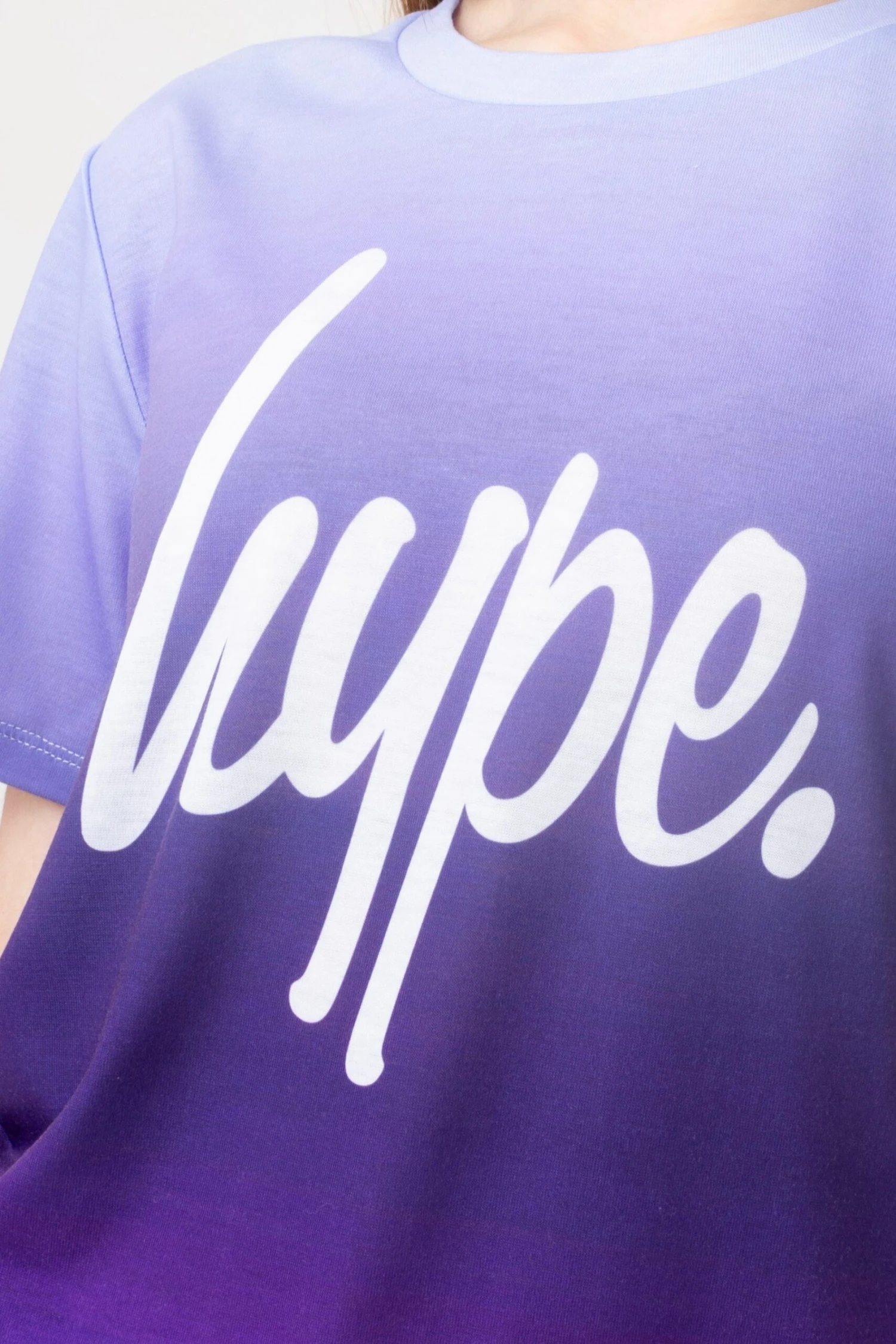 Make a statement in the HYPE. Girls Purple Fade Script T-Shirt. Designed in our standard kids tee shape with a soft touch fabric base for the ultimate comfort. Finished with a crew neckline and short sleeves. Wear with jeans and jacket for a casual-smart fit or joggers for a casual look. Machine wash at 30 degrees.