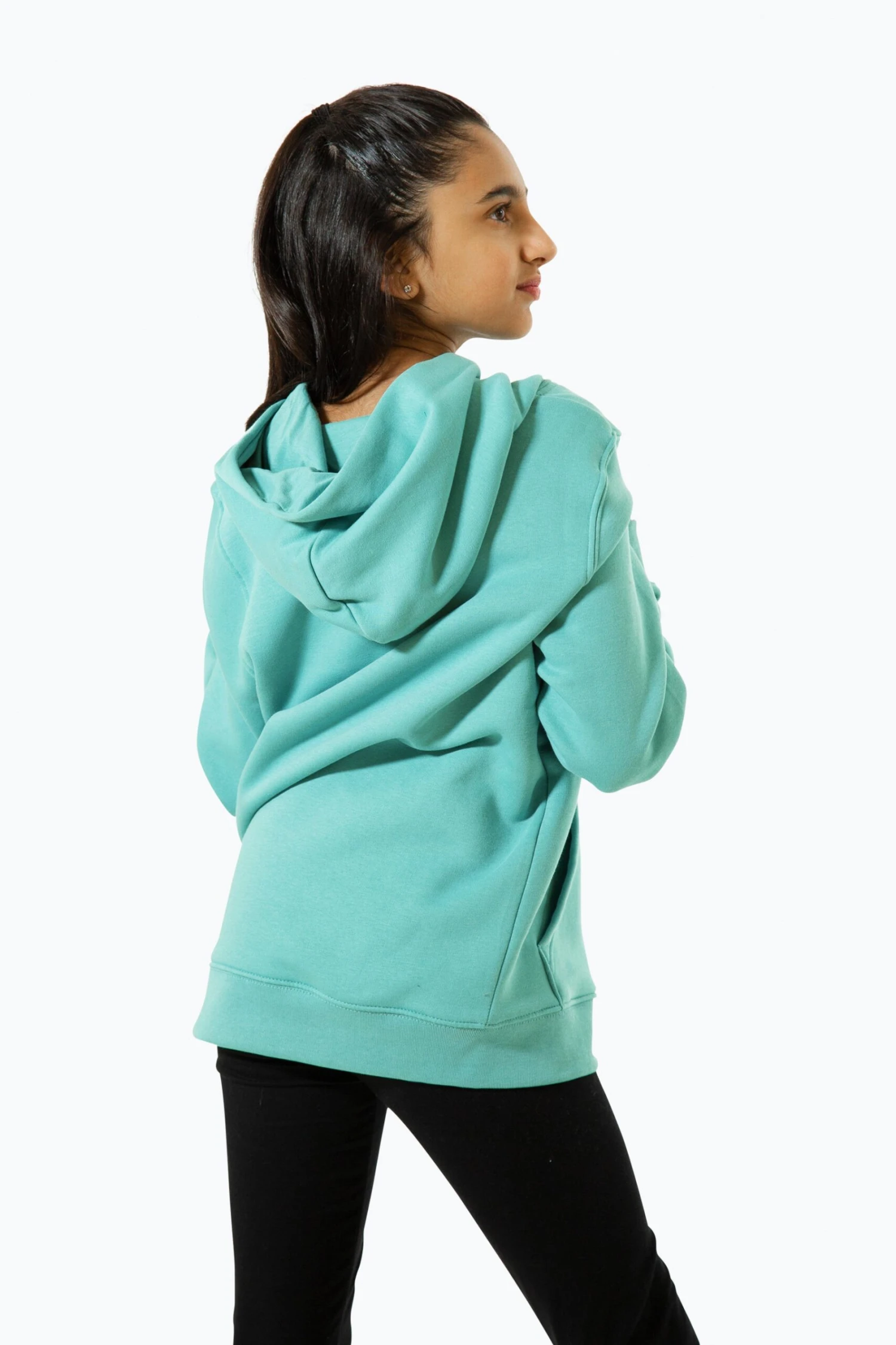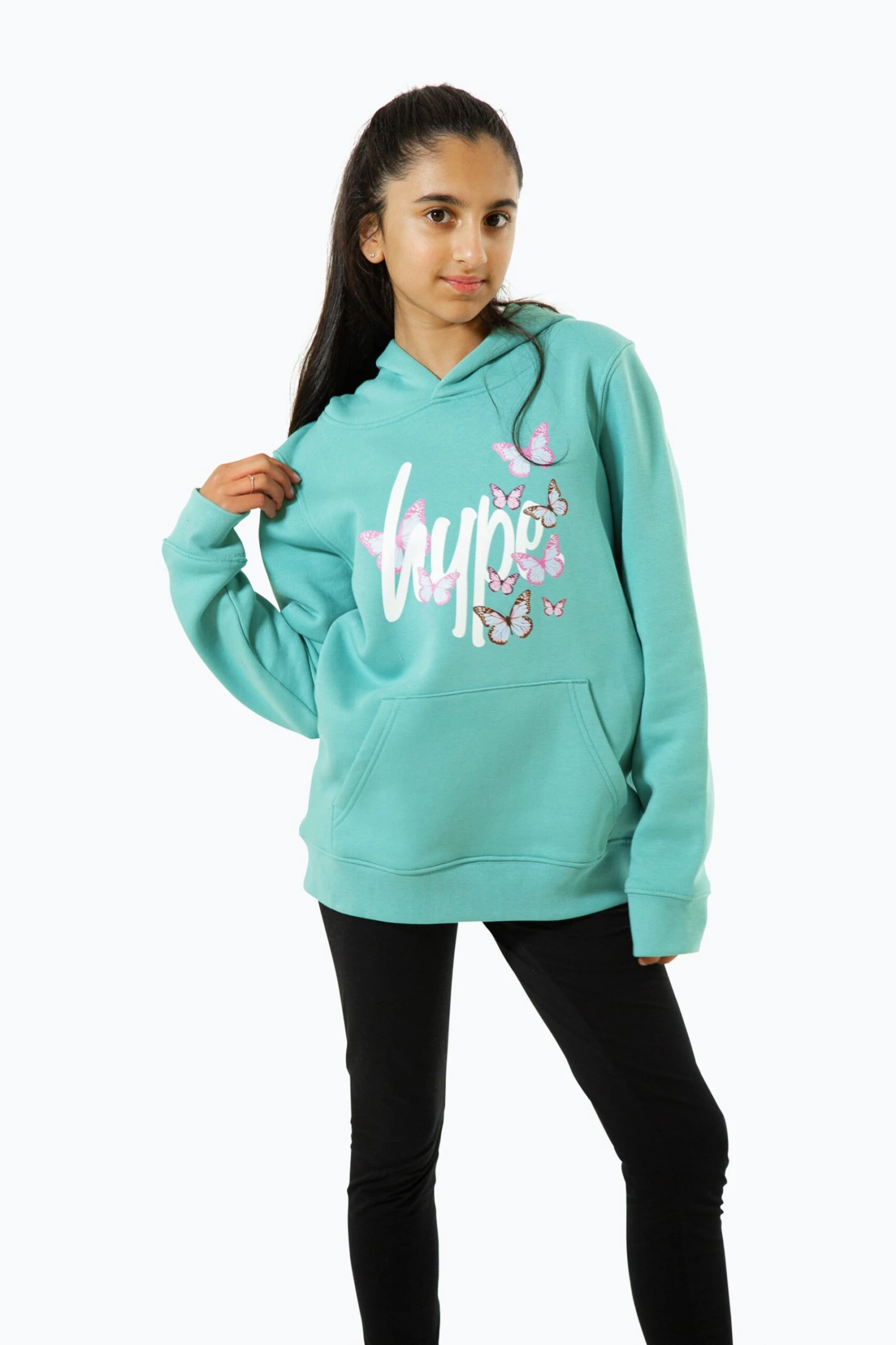 The HYPE. Kids Teal Butterfly Script Hoodie is designed in our unisex kids hoodie shape in a 85% cotton 15% polyester teal fabric blend for the ultimate amount of comfort. Featuring a fixed hood, kangaroo pocket, fitted hem and cuffs, and the HYPE. script logo in contrasting white surrounded by pink and purple butterflies. Wear with the matching joggers to complete the look. Machine wash at 30 degrees.