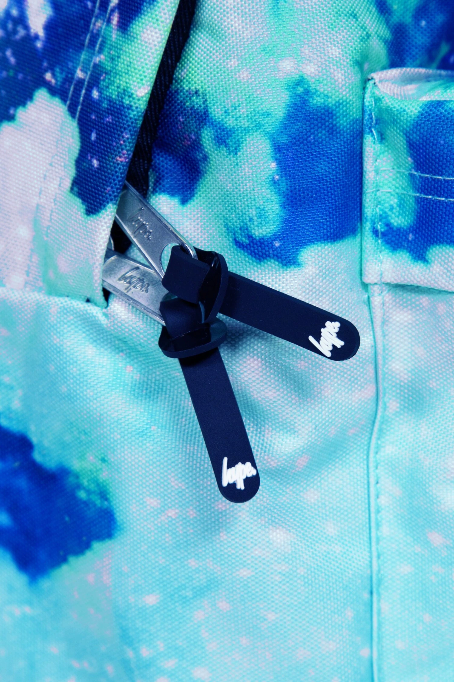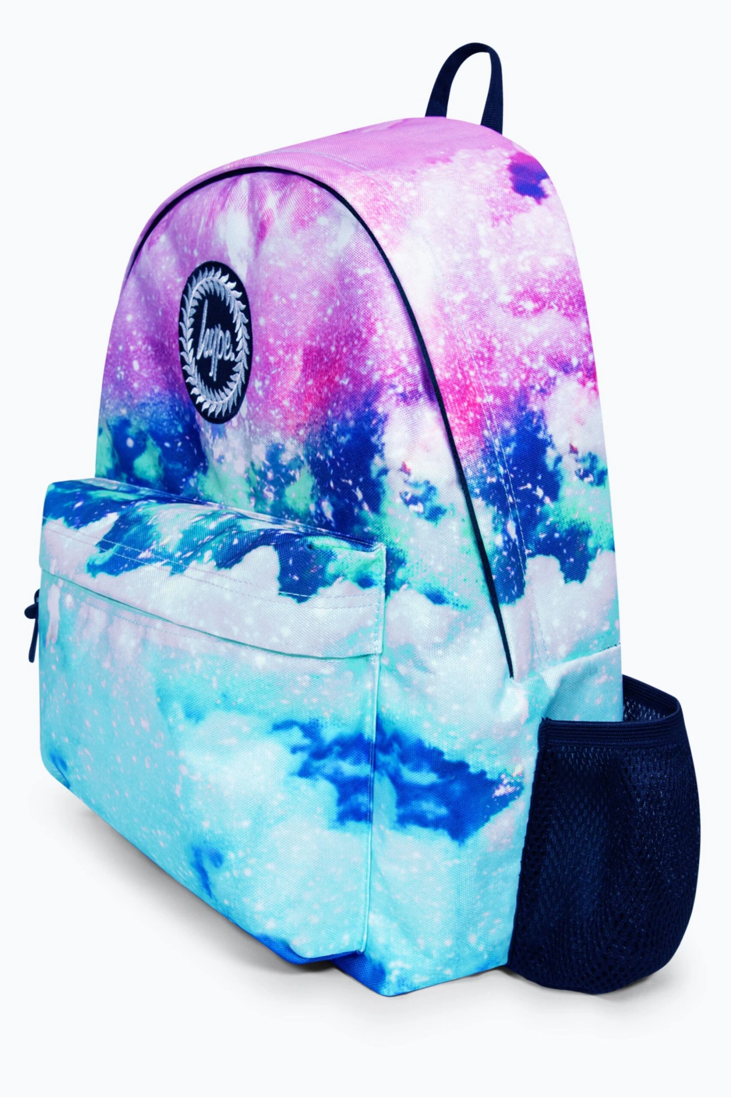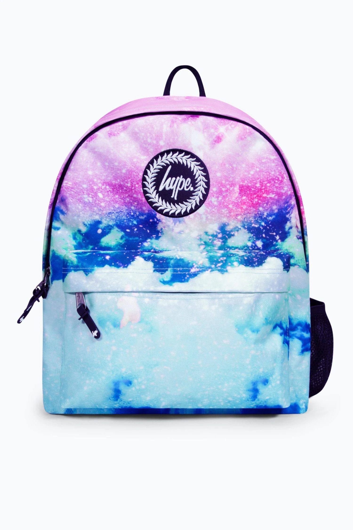The HYPE. Glitter Skies Badge Backpack is your new accessory staple. With an all over skies inspired print, in a pink and blue colour palette. Measuring at 42cm x 30cm x 12cm, finished with a front mini pocket, grab handle, embossed zips, branded inside lining. Boasting the iconic HYPE. crest badge in monochrome embroidered on the front and straps offer supreme comfort with just the right amount of padding on the back. This backpack features a mesh side bottle holder and inside padded laptop sleeve and velcro fastening. Wipe clean only.