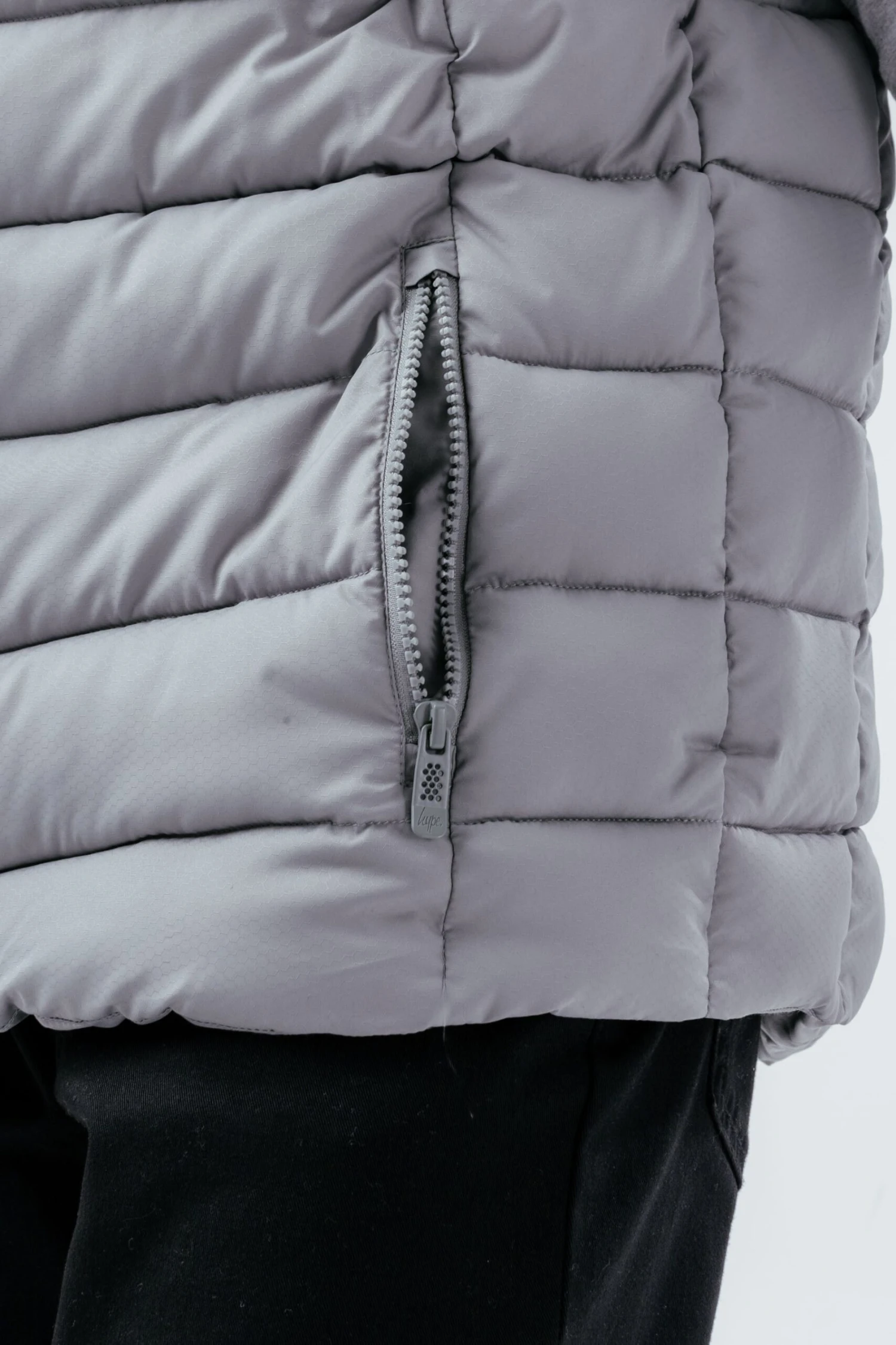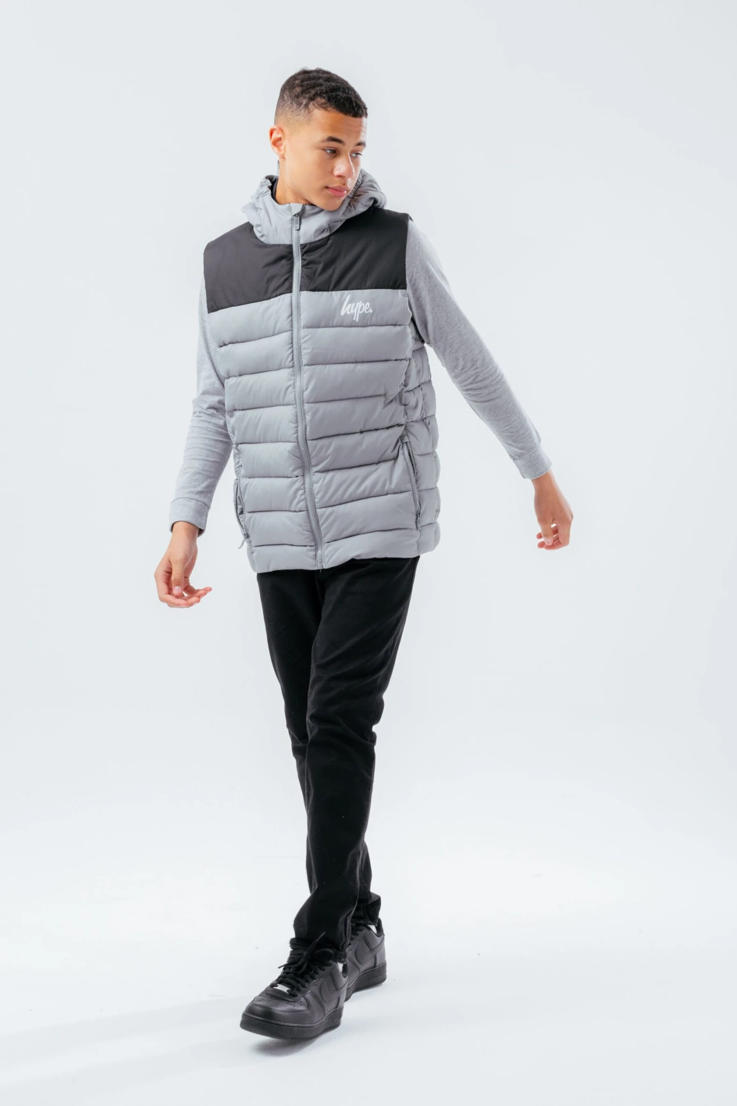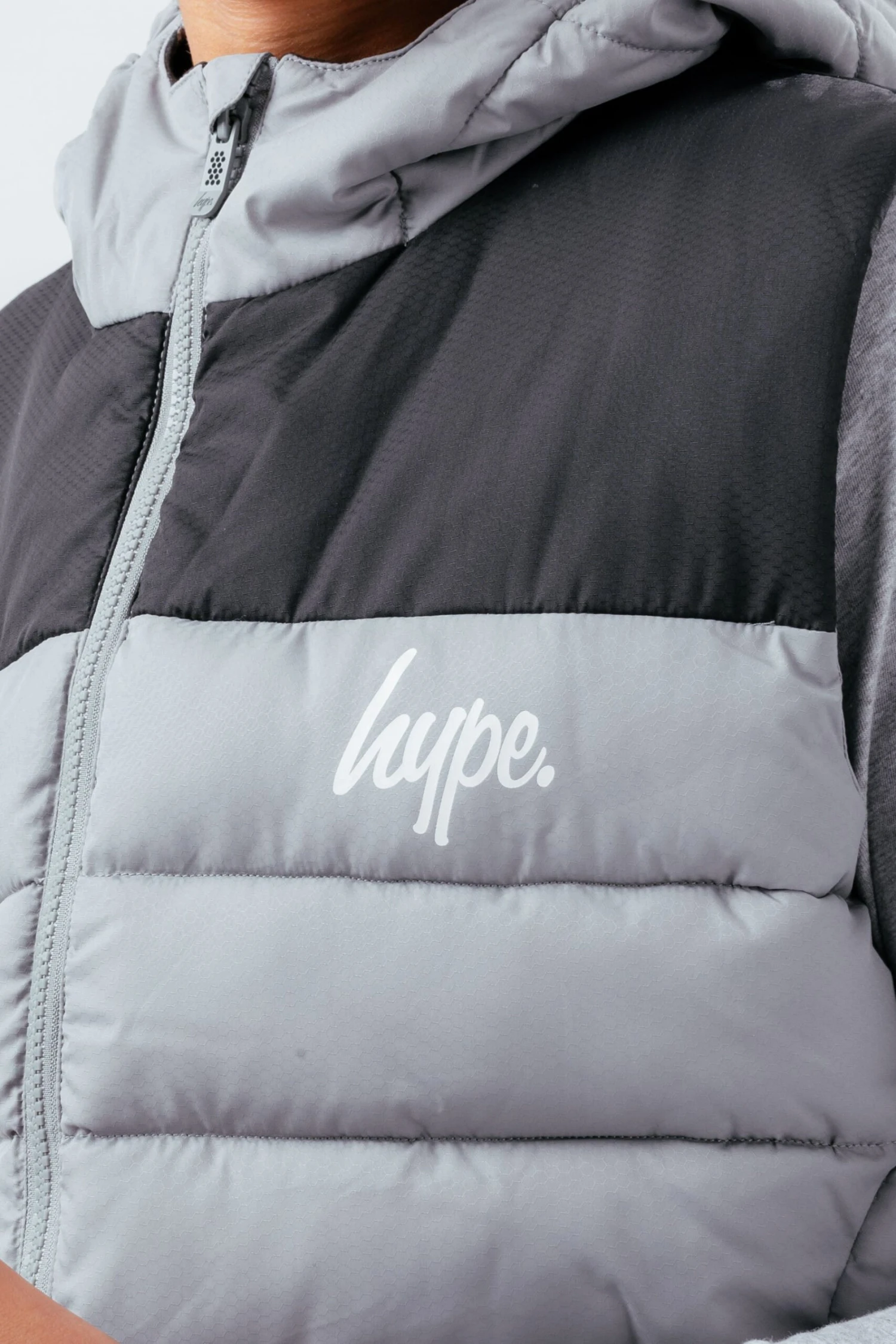 Meet the HYPE. Grey Black Kids Gilet, perfect for those warmer days when your mum says you still need to wear a jacket. Designed in our standard unisex gilet shape, the gilet features padding to keep you cosy, a full front zip, fixed hood, and the iconic HYPE. logo. Machine wash at 30 degrees.