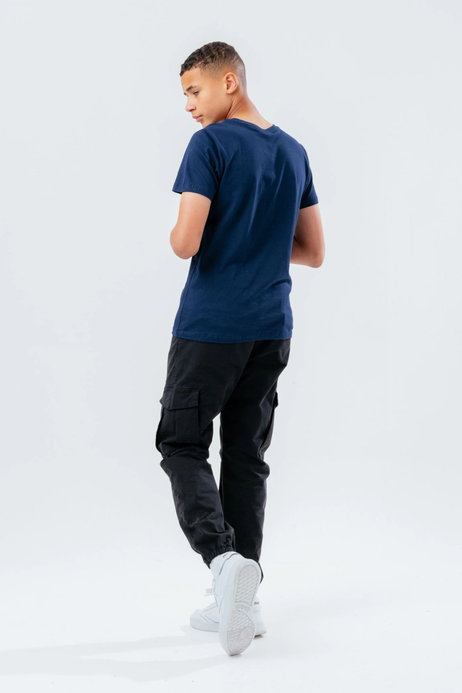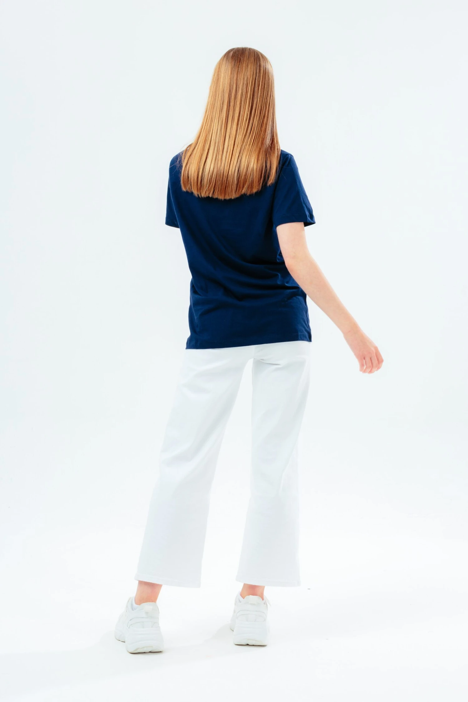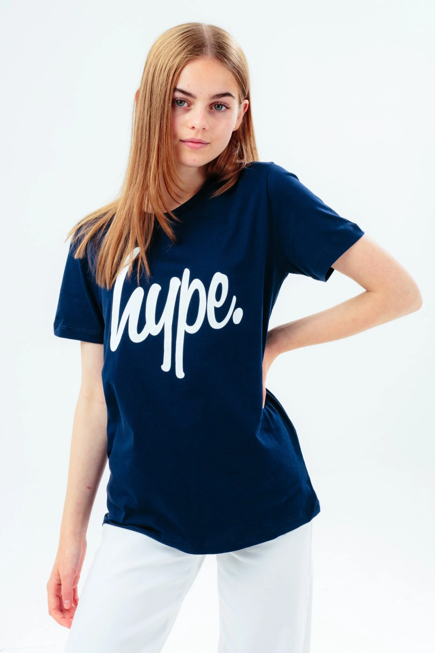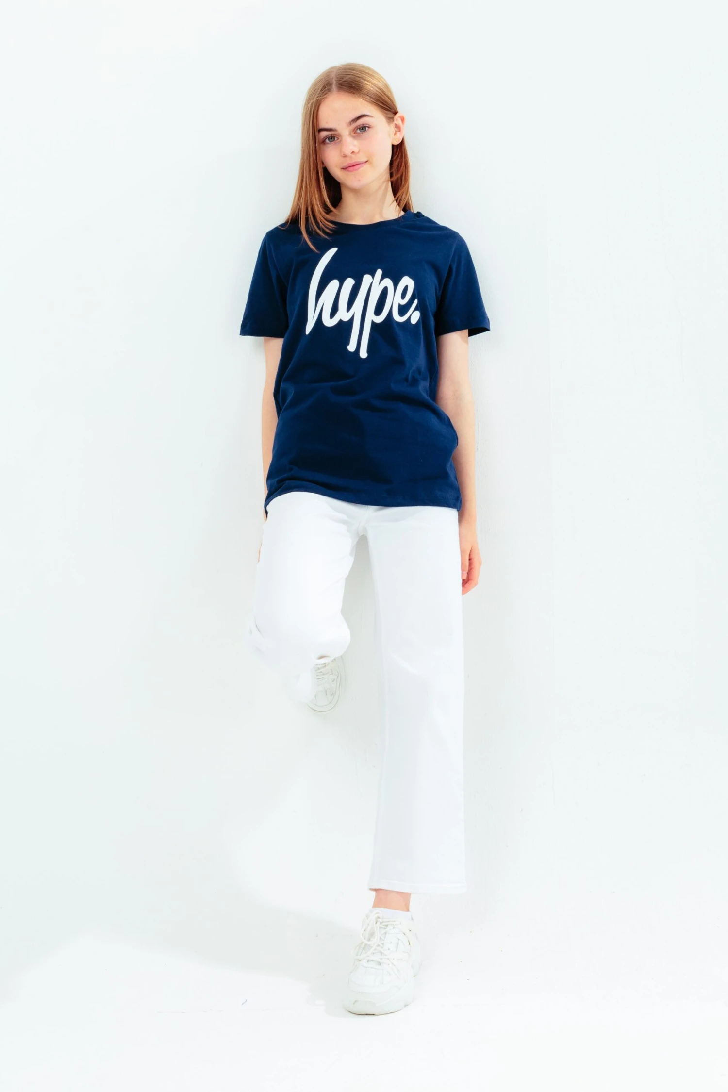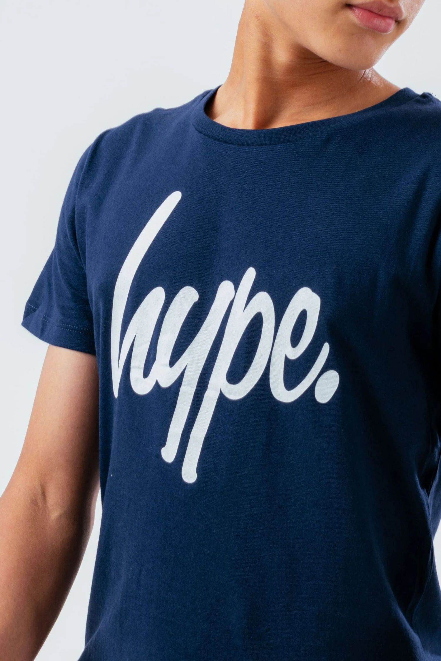 The HYPE. Kids Unisex Navy Script T-Shirt is designed in a soft-touch 100% cotton navy fabric base in our standard kids’ t-shirt shape. Featuring a crew neckline and short sleeves, finished with the HYPE. logo in contrasting white script. Wear with the matching hoodie and joggers or shorts to complete the look. Machine wash at 30 degrees.