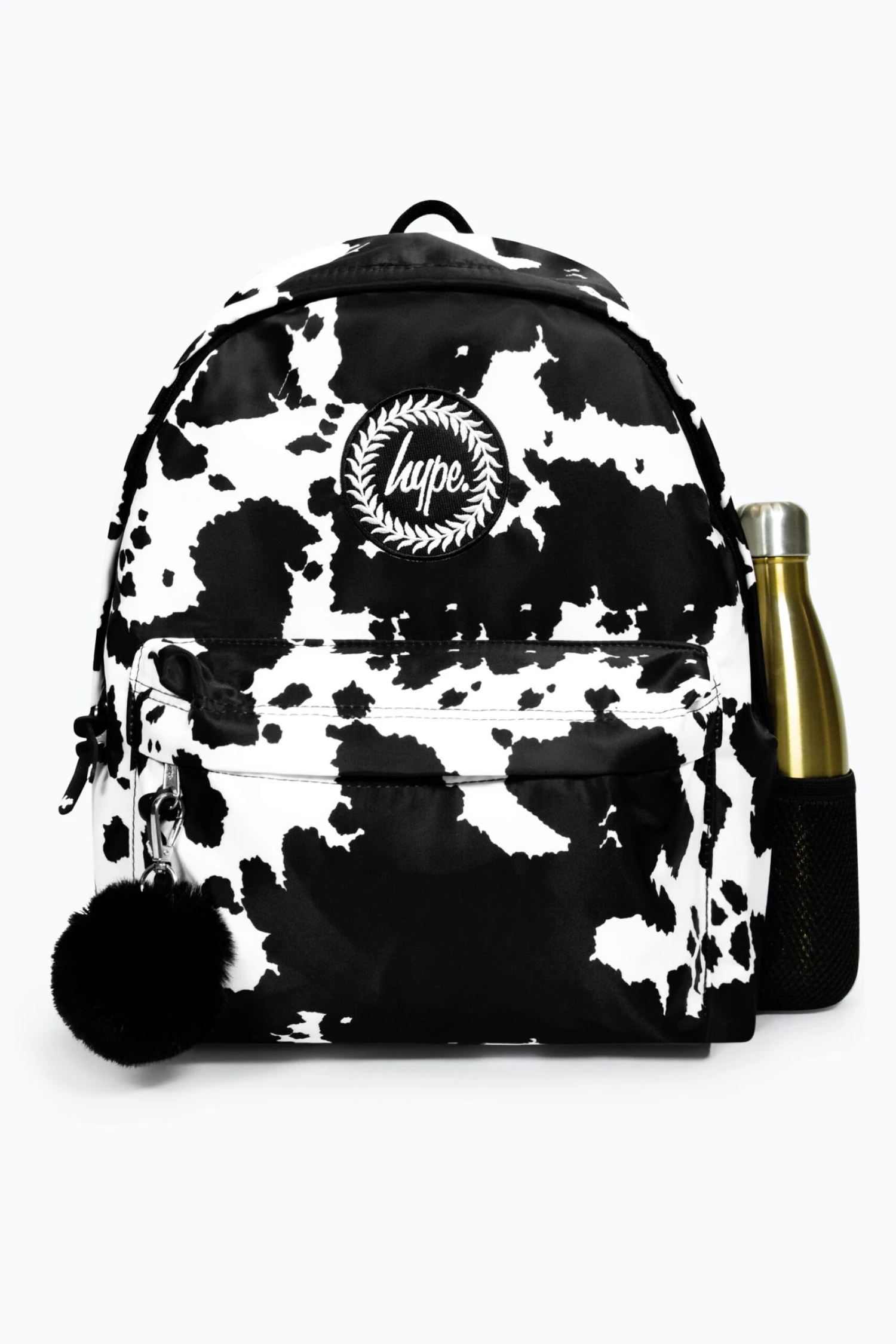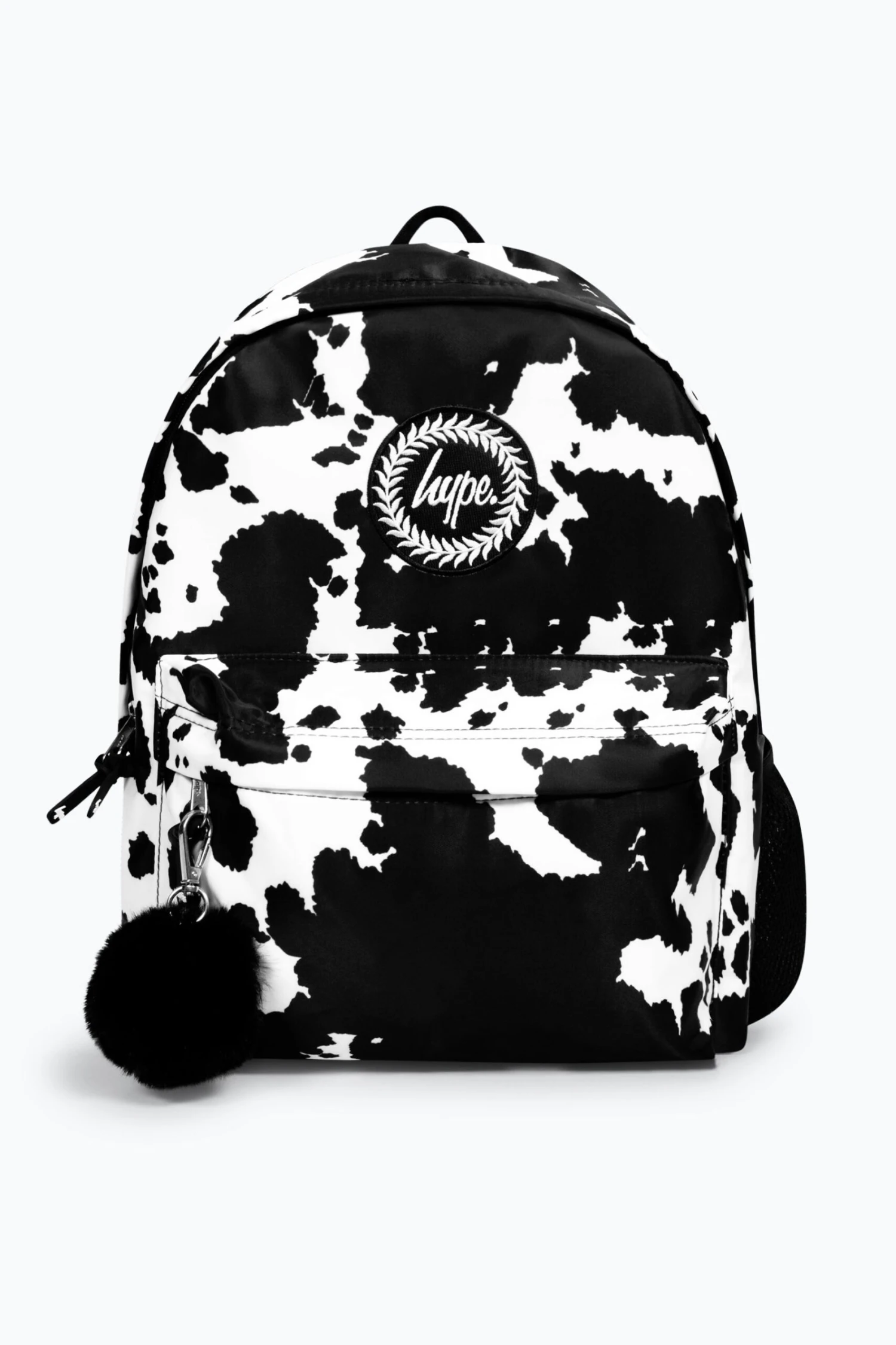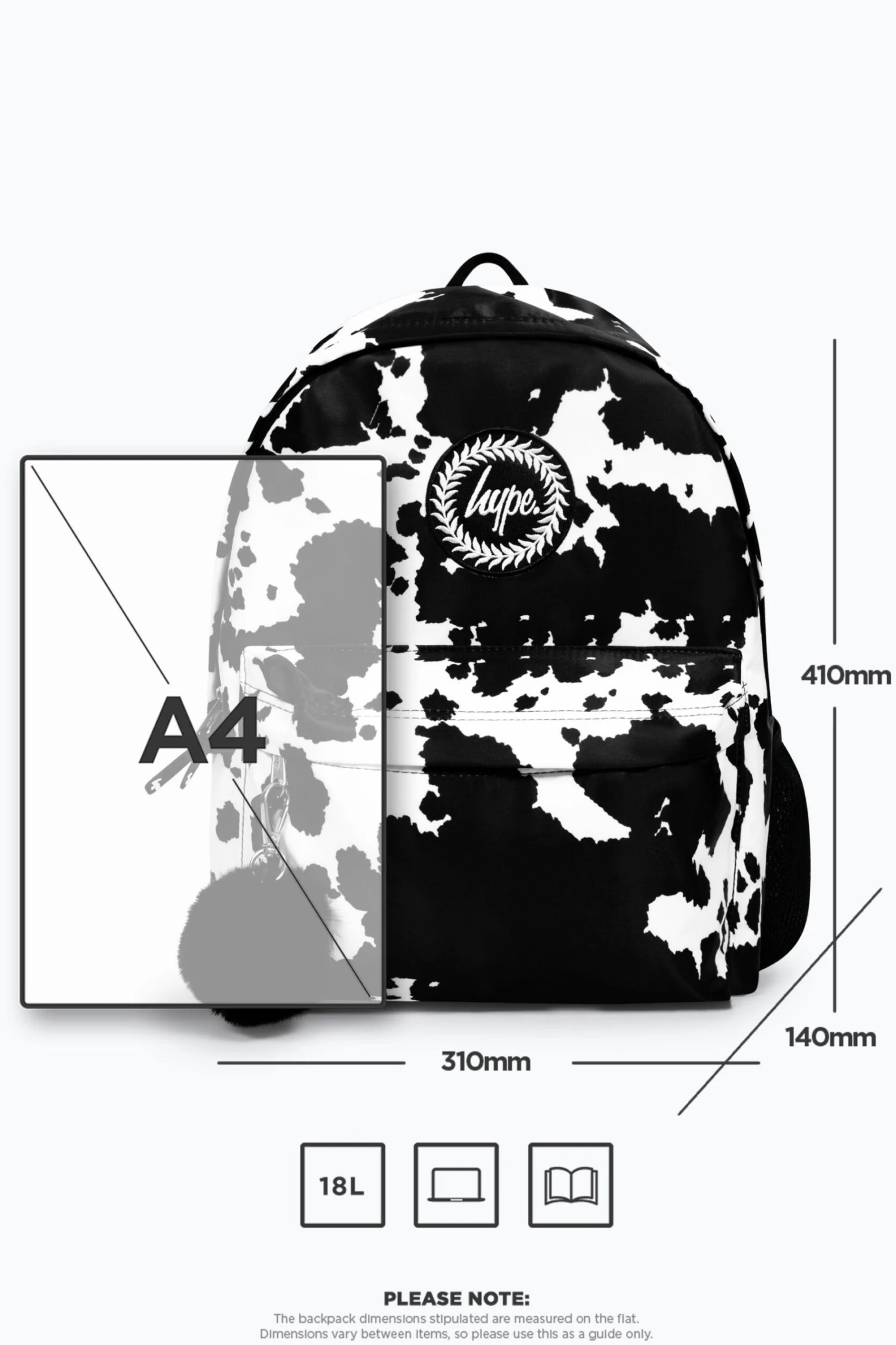 The HYPE. Mono Cow Badge Backpack is your new accessory staple. With an all-over cow-inspired print in a monochrome colour palette – with a removable pom pom key chain. Measuring at 42cm x 30cm x 12cm, finished with a front mini pocket, grab handle, embossed zips, branded inside lining. Boasting the iconic HYPE. crest badge in monochrome embroidered on the front and straps offer supreme comfort with just the right amount of padding on the back. This backpack features a mesh side bottle holder and inside padded laptop sleeve and velcro fastening. Wipe clean only.