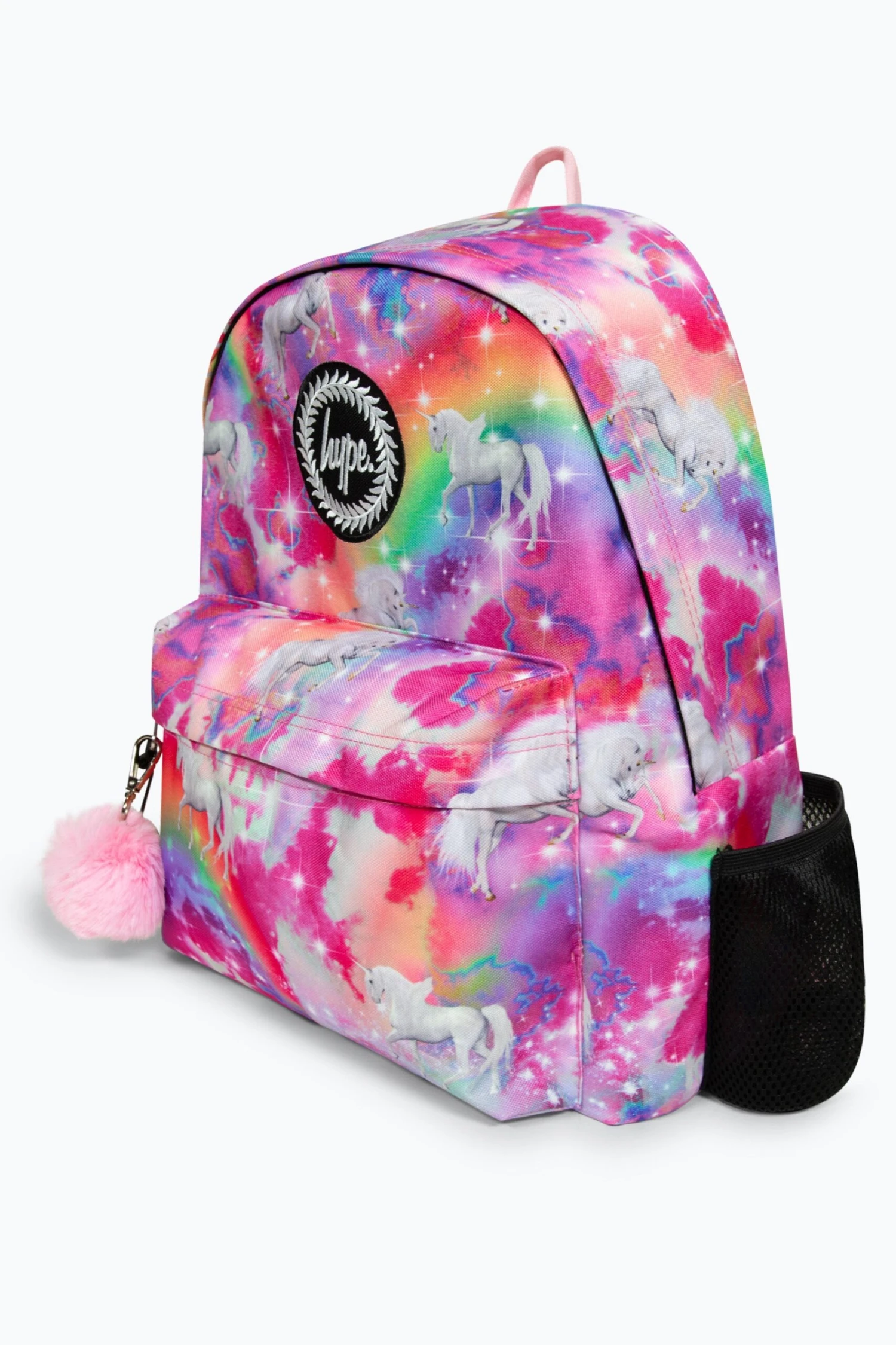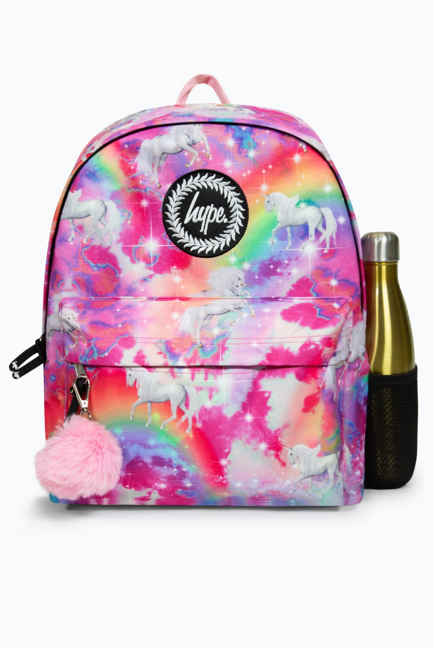 The HYPE. Pink Magical Badge Backpack is your new accessory staple. With an all-over multi colour palette featuring unicorns – with a removable pom pom key chain. Measuring at 42cm x 30cm x 12cm, finished with a front mini pocket, grab handle, embossed zips, branded inside lining. Boasting the iconic HYPE. crest badge in monochrome embroidered on the front and straps offer supreme comfort with just the right amount of padding on the back. This backpack features a mesh side bottle holder and inside padded laptop sleeve and velcro fastening. Wipe clean only.
