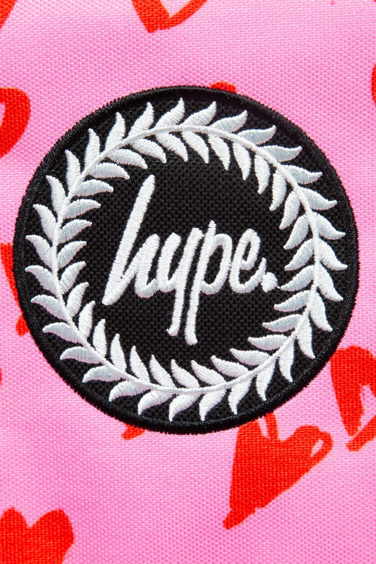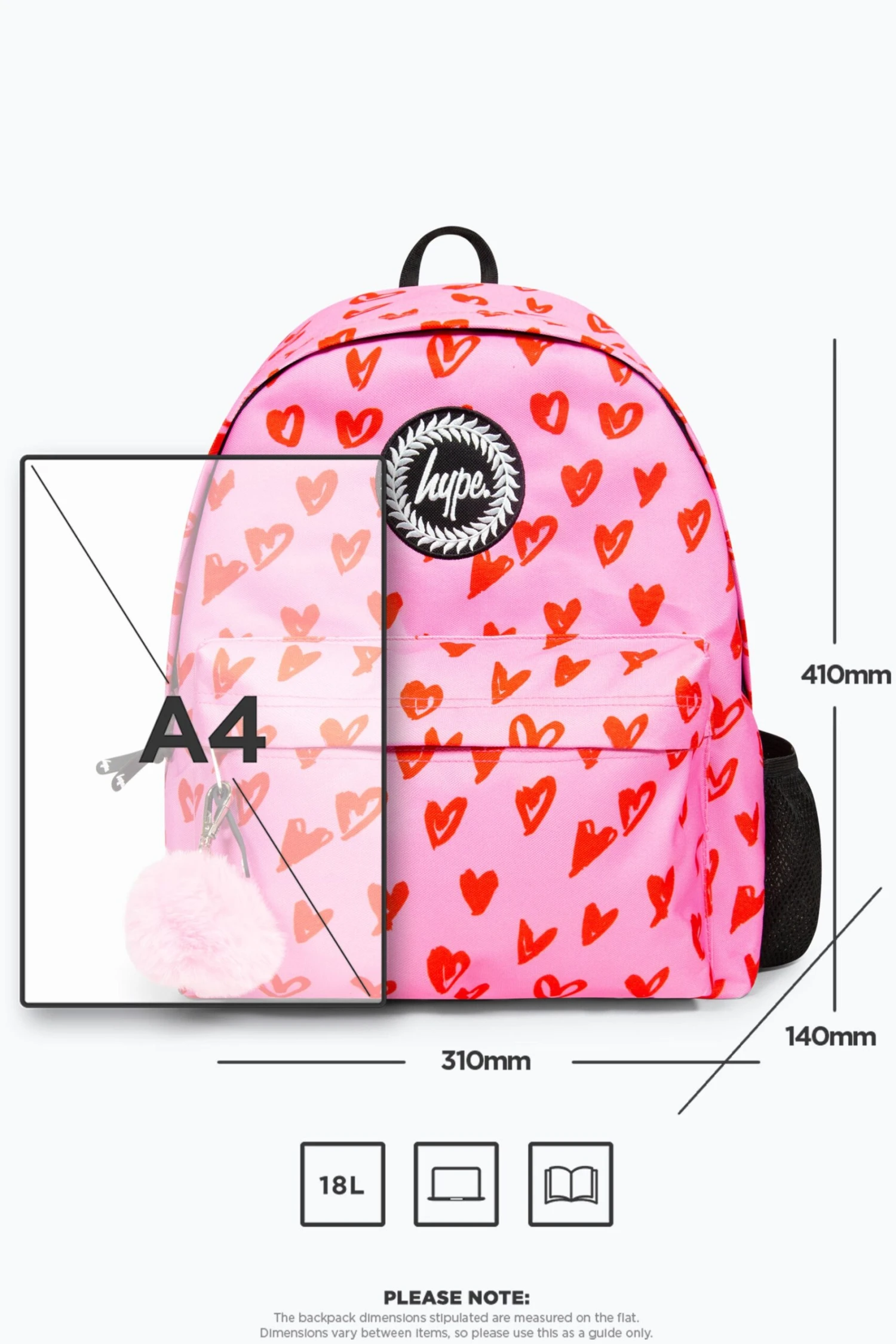 The HYPE. Scribble Heart Badge Backpack is your new accessory staple. Designed with a hand drawn heart repeat print in a contrasting pink and red colour palette – with removable pom pom key chain. Measuring at 42cm x 30cm x 12cm, finished with a front mini pocket, grab handle, embossed zips, branded inside lining. Boasting the iconic HYPE. crest badge in monochrome embroidered on the front and straps offer supreme comfort with just the right amount of padding on the back. This backpack features a mesh side bottle holder and inside padded laptop sleeve and velcro fastening. Wipe clean only.