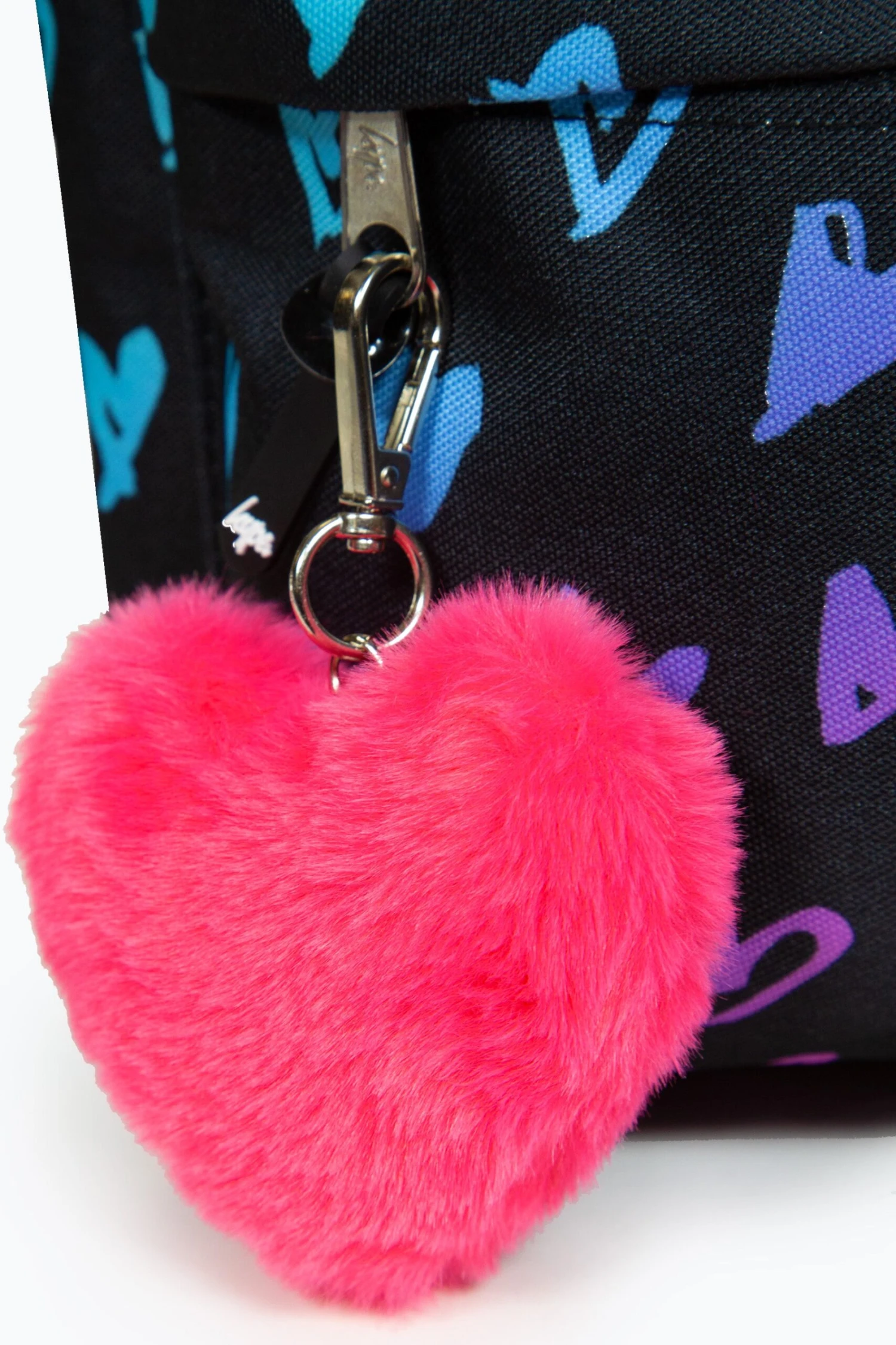 The HYPE. Scribble Heart Badge Backpack is your new accessory staple. With an all-over hand drawn heart repeat print in a pink, blue and green fade- with a removable heart shaped pom pom key chain. Measuring at 42cm x 30cm x 12cm, finished with a front mini pocket, grab handle, embossed zips, branded inside lining. Boasting the iconic HYPE. crest badge in monochrome embroidered on the front and straps offer supreme comfort with just the right amount of padding on the back. This backpack features a mesh side bottle holder and inside padded laptop sleeve and velcro fastening. Wipe clean only.