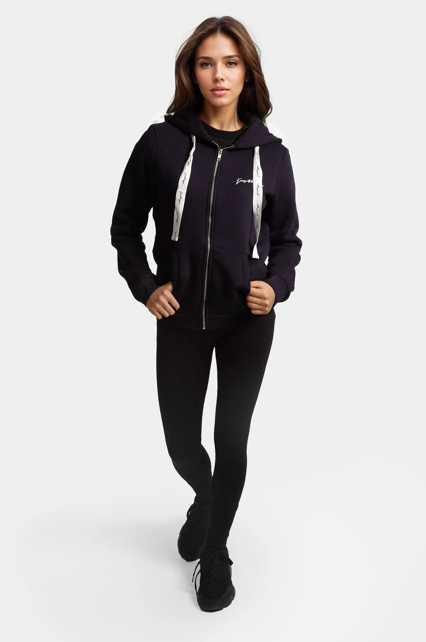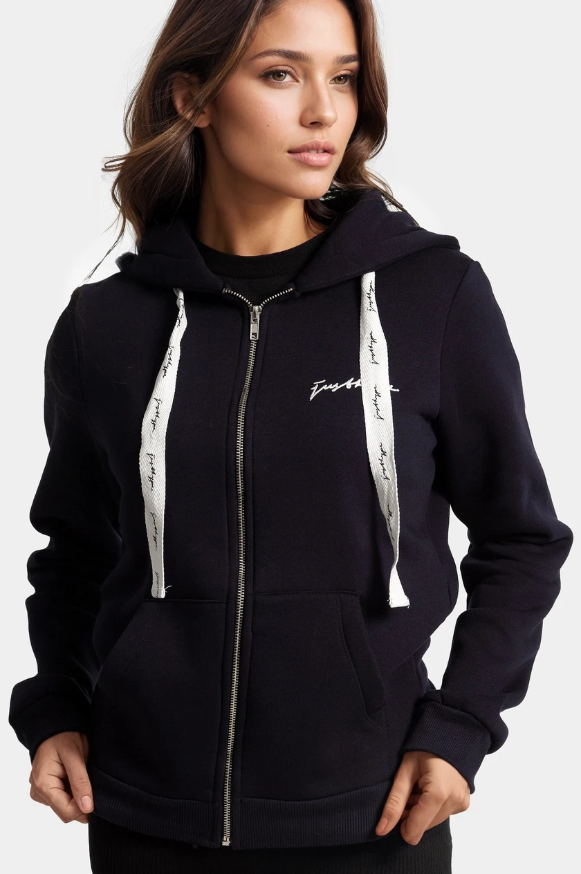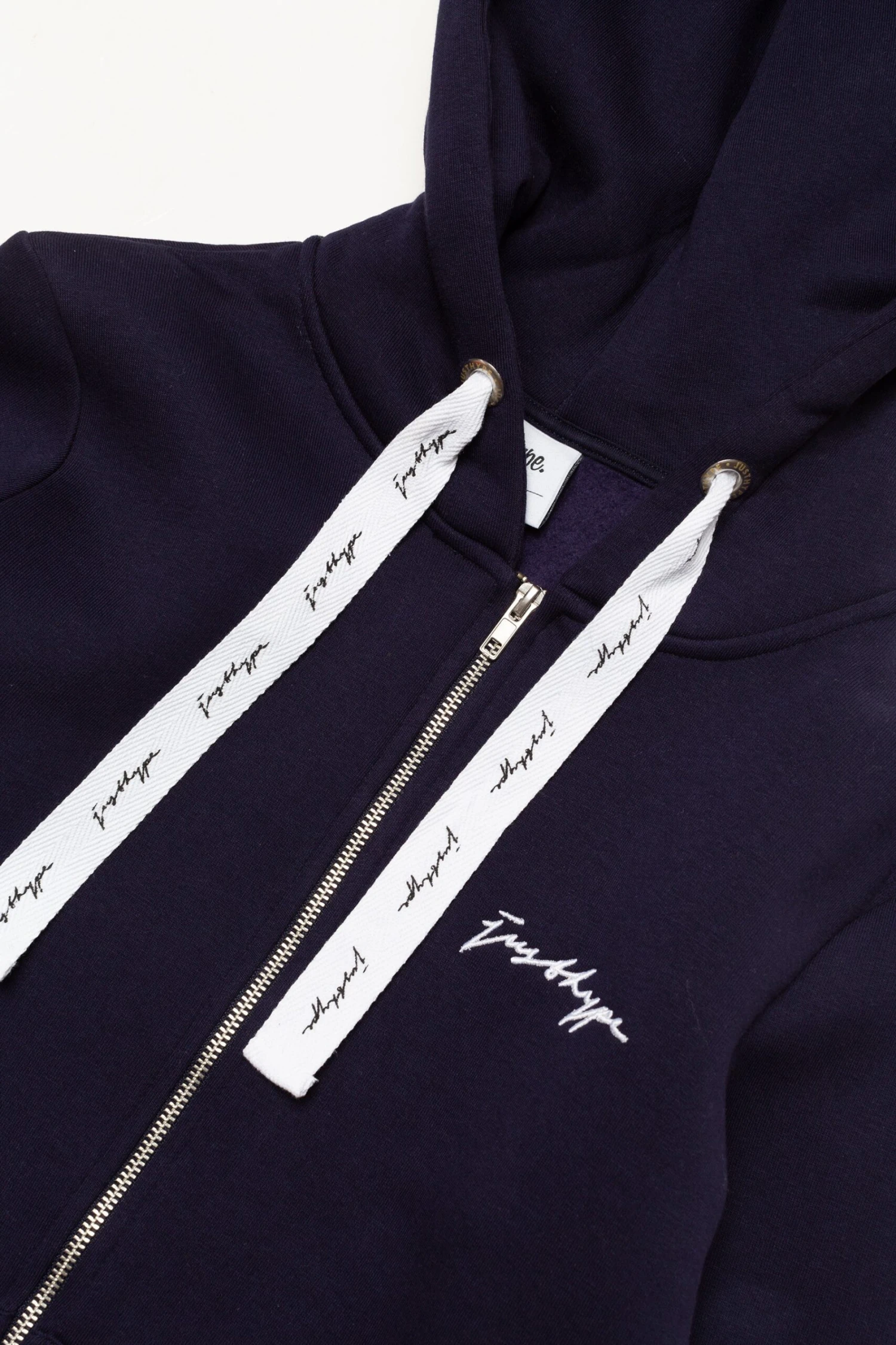 The HYPE. Womenโs Navy Scribble Zip Hoodie is designed in a soft-touch 100% cotton navy fabric base for the ultimate amount of comfort in our standard womenโs zip hoodie shape. Featuring a fixed hood, drawstring pullers, zip, drawstring pullers, fitted hem and cuffs, and the JustHype scribble logo. Wear with the matching t-shirt and joggers or shorts to complete the look. Machine wash at 30 degrees.