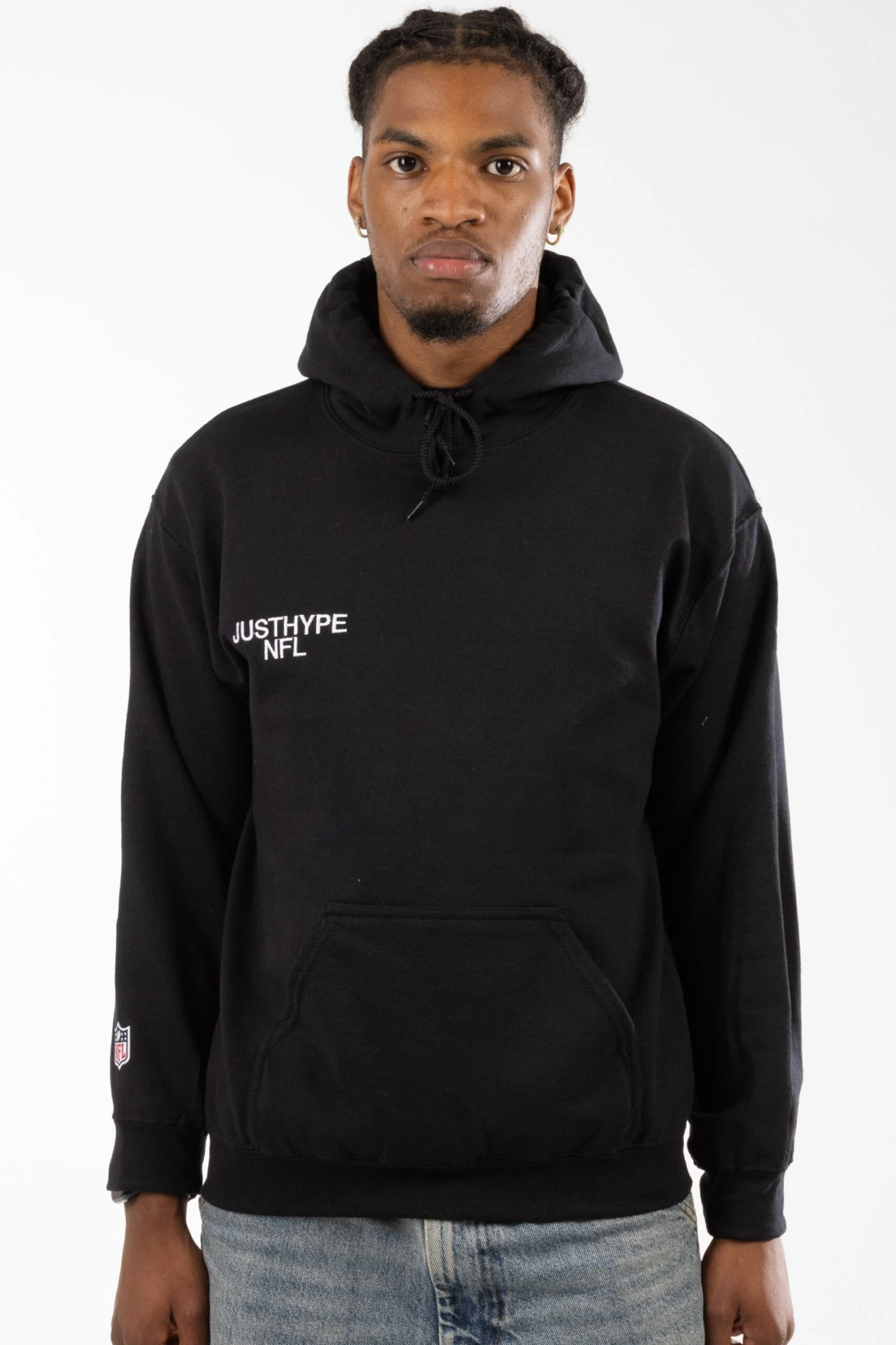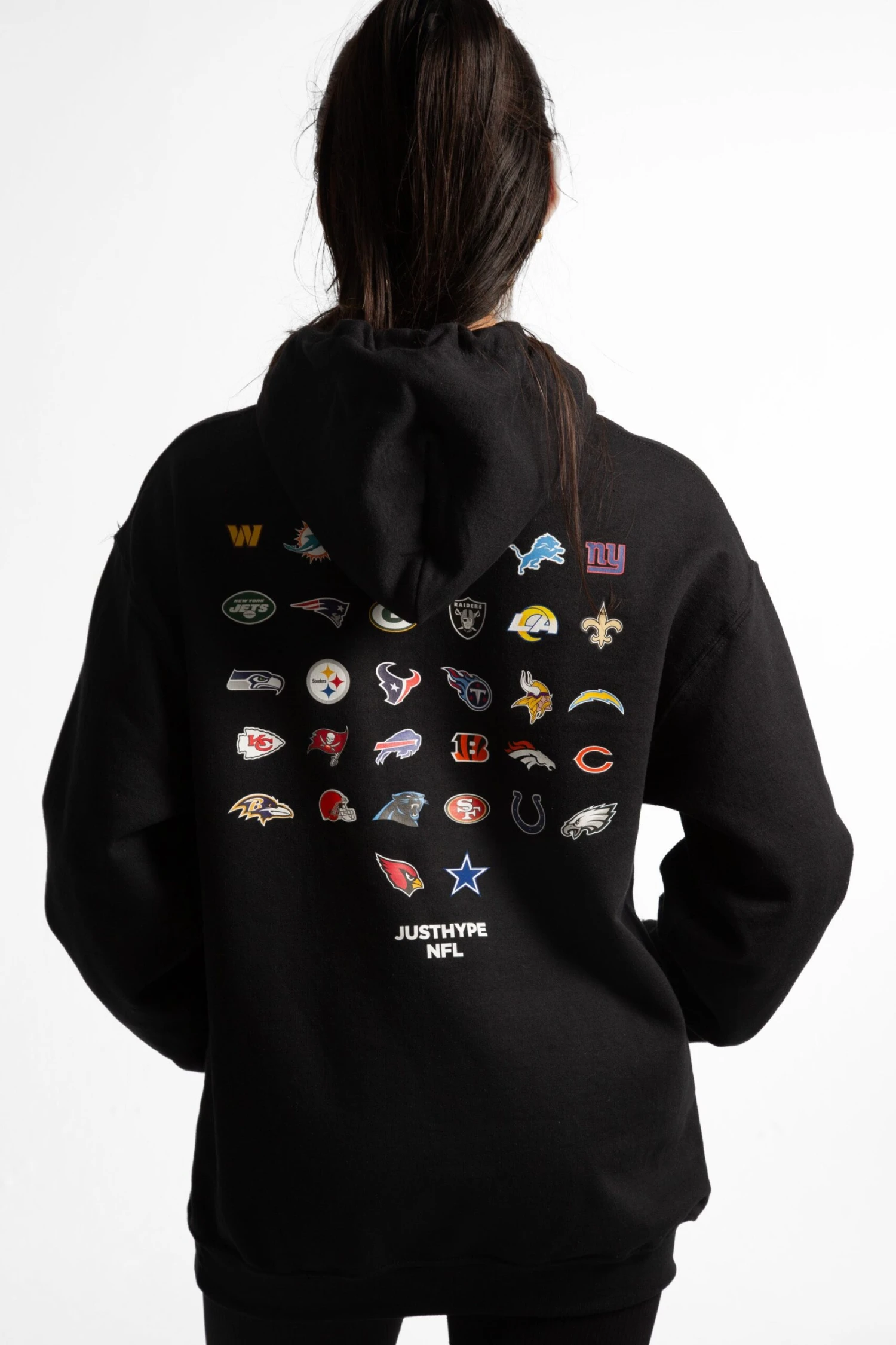 Touchdown! The NFL x HYPE Adults Black National Football League Hoodie, a must-have this season. Designed in a core black soft touch fabric for the ultimate comfortable fit, featuring a fitted hem and cuffs, kangaroo pouch and drawstring pullers. Finished with all 32 NFL teams as an enlarged back graphic. Made in England. Machine wash at 30 degrees.