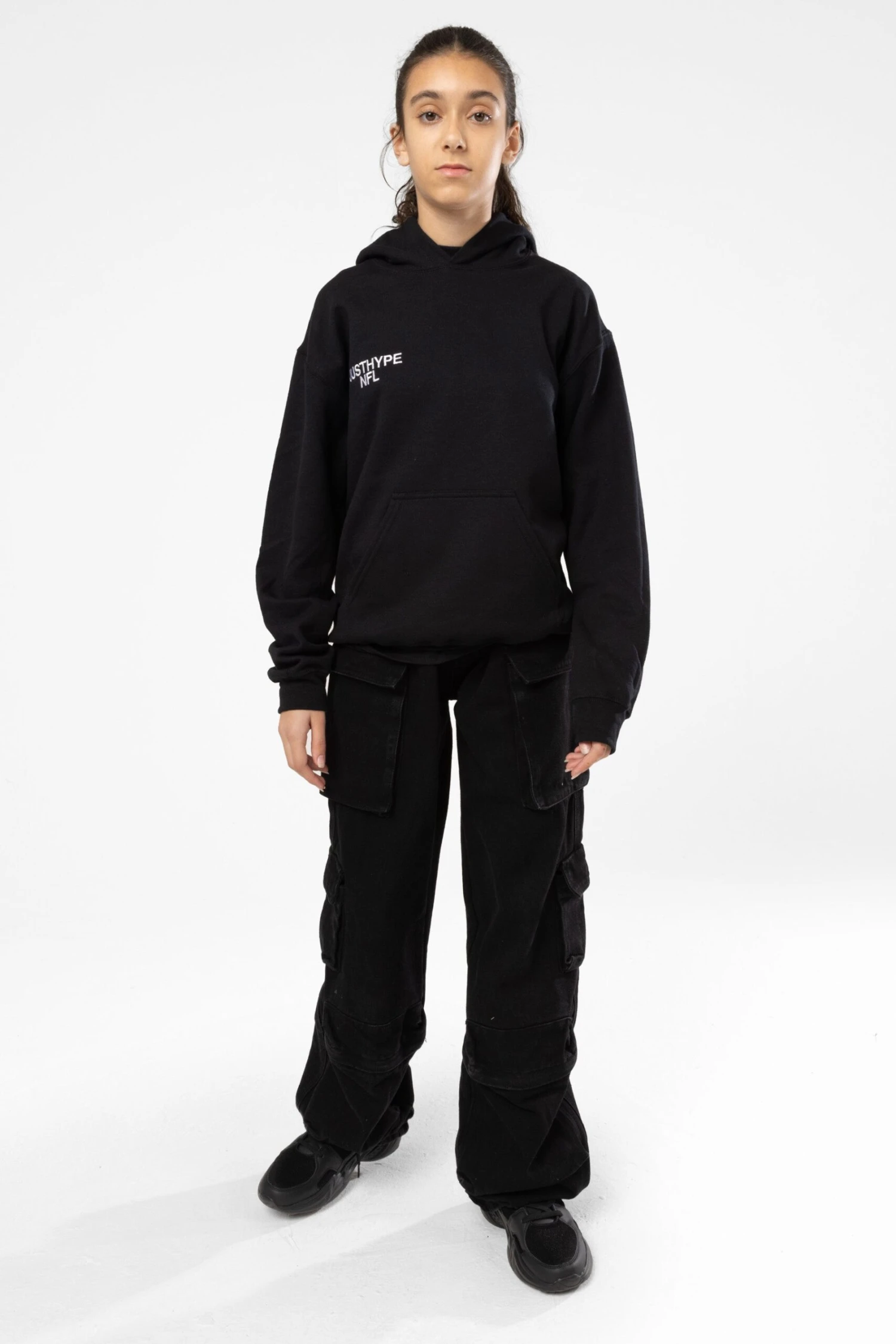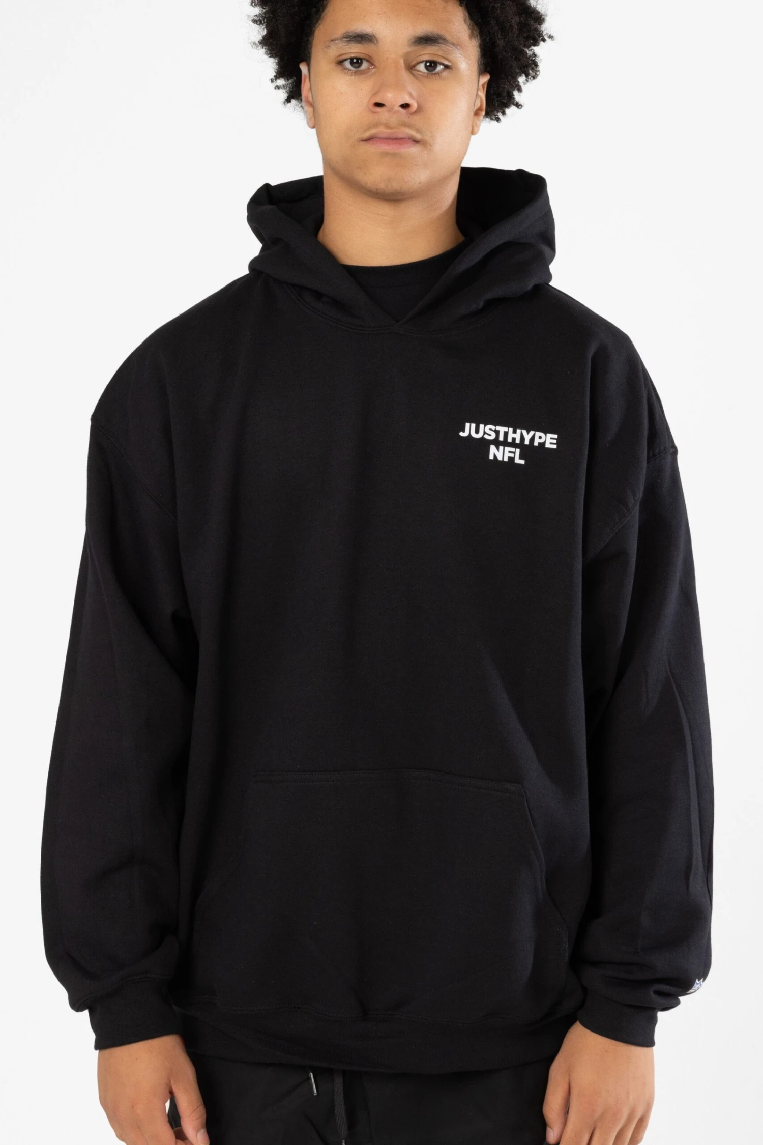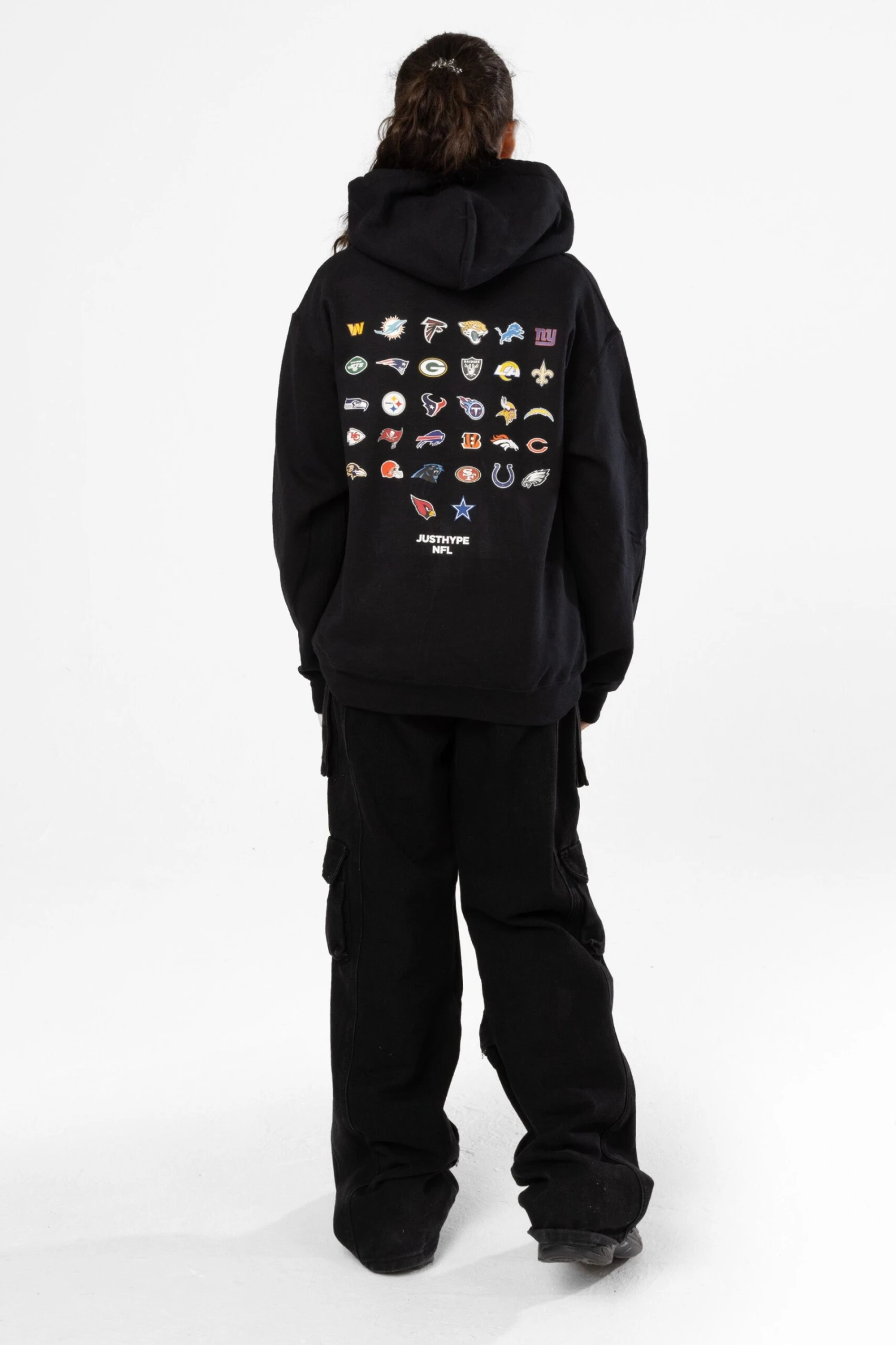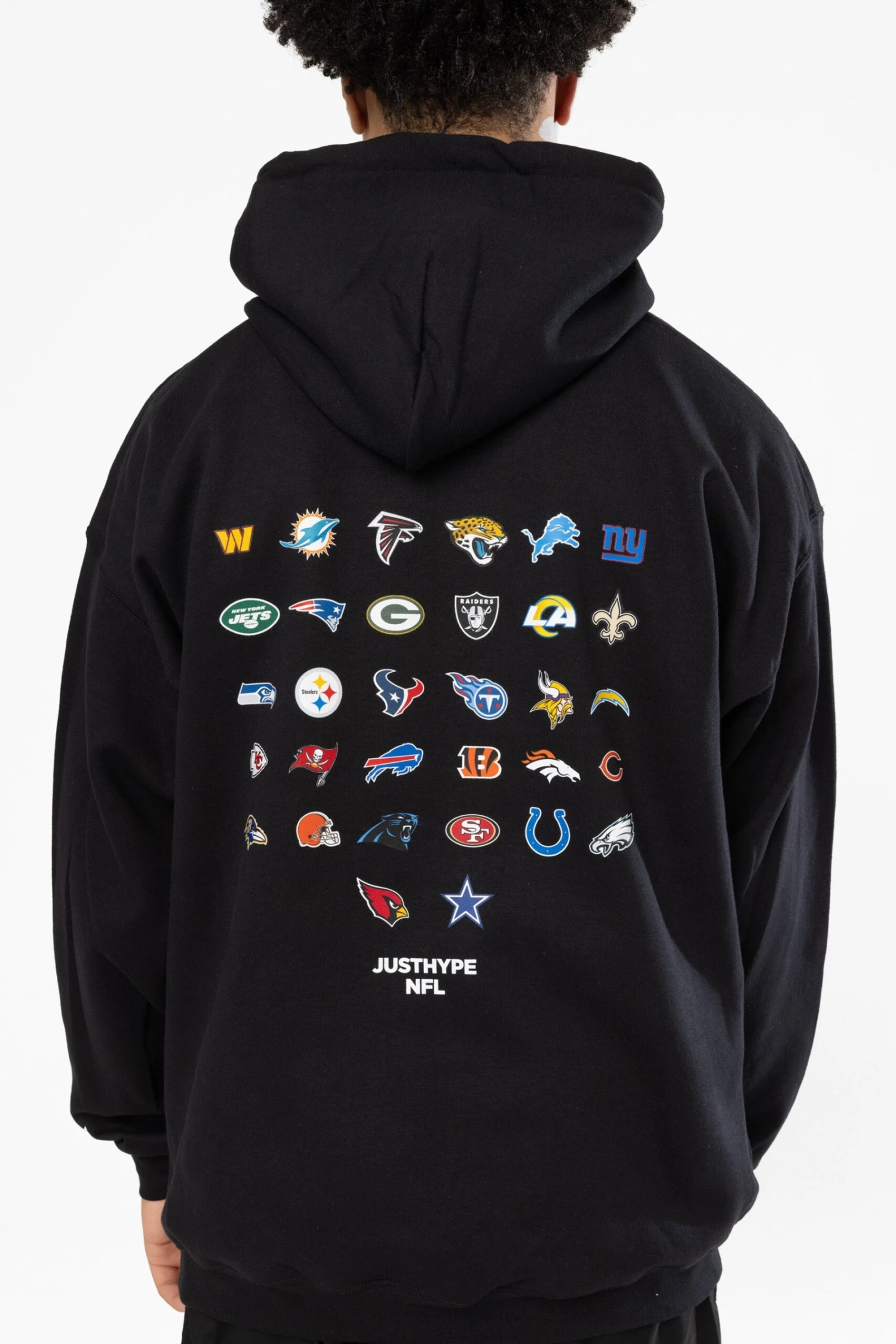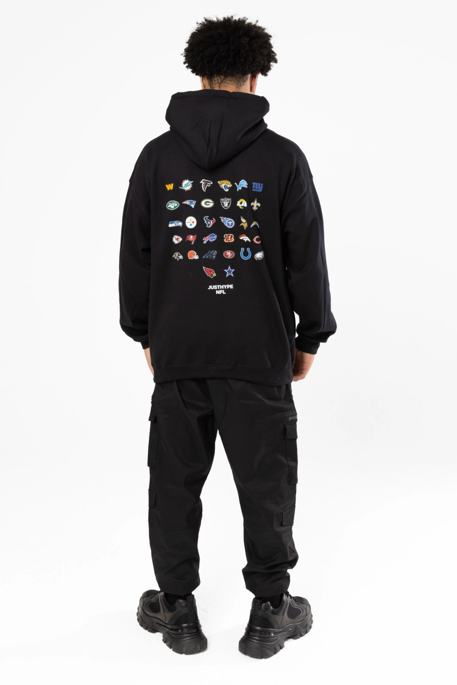 Touchdown! The NFL x HYPE Kids Black National Football League Hoodie, a must-have this season. Designed in a core black soft touch fabric for the ultimate comfortable fit, featuring a fitted hem and cuffs and kangaroo pouch. Finished with all 32 NFL teams as an enlarged back graphic. Made in England. Machine wash at 30 degrees.