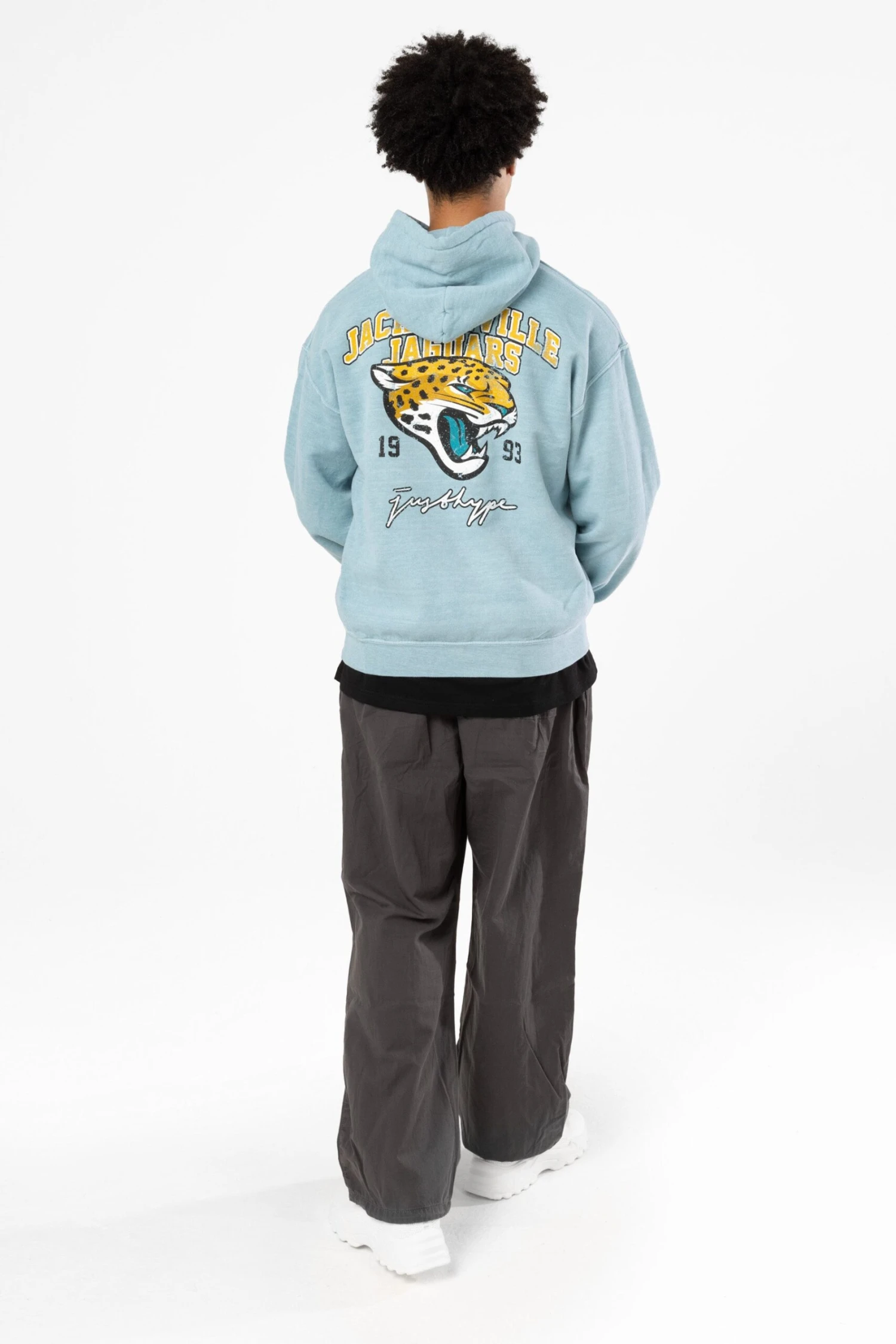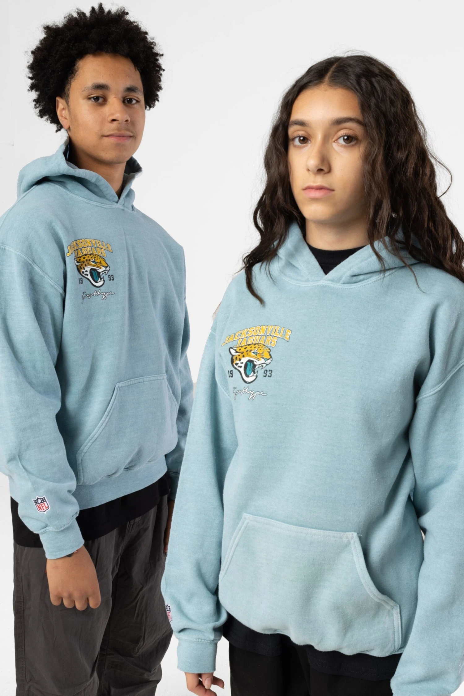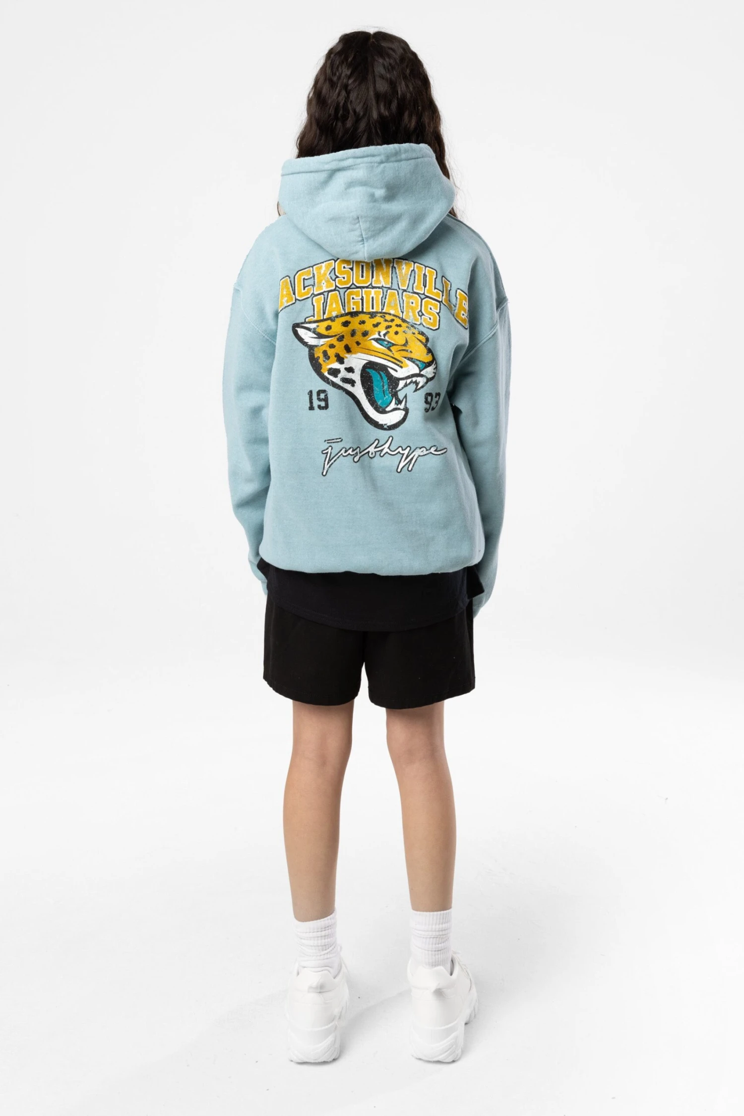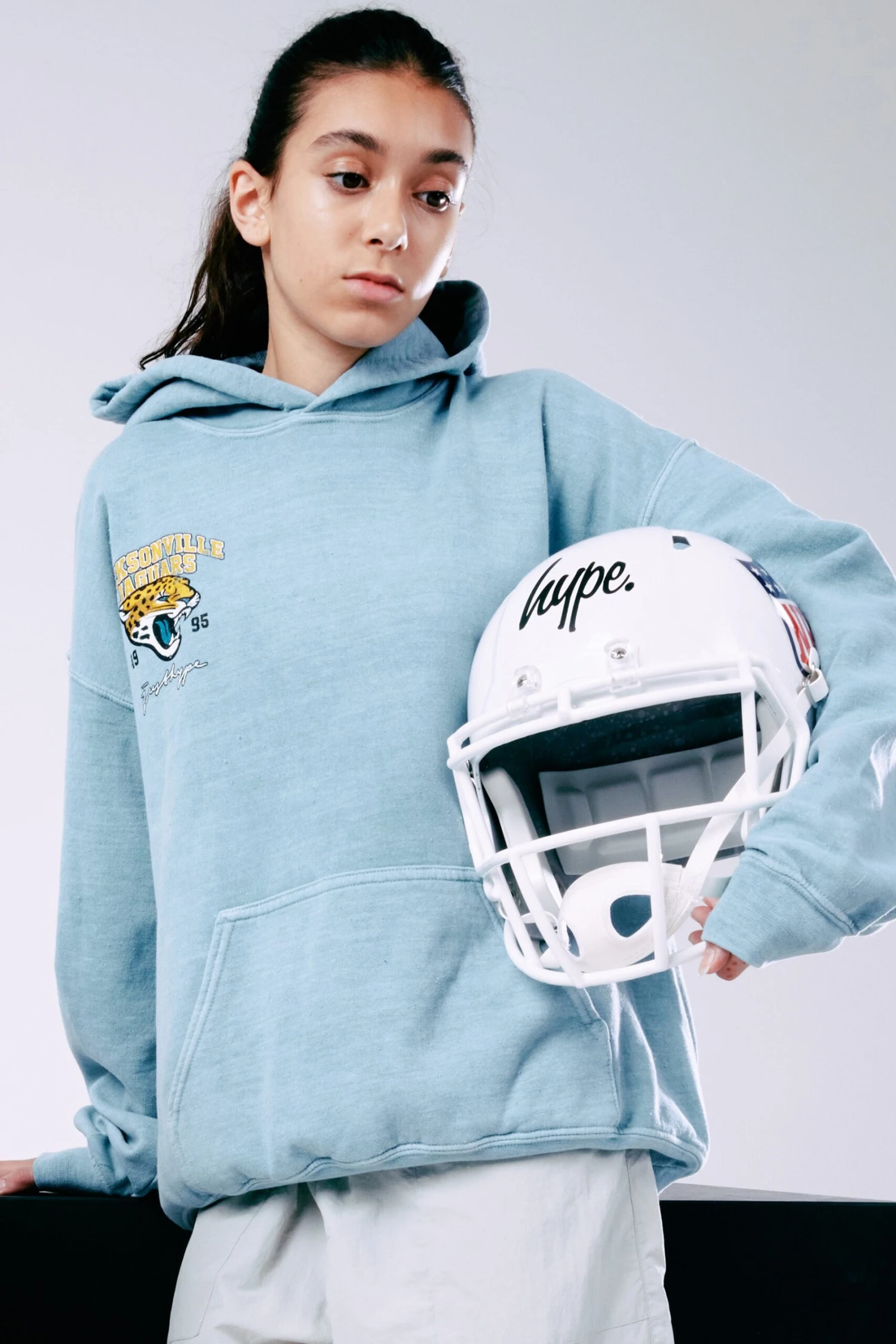 Touchdown! The NFL x HYPE Teal Kids Jacksonville Jaguars Hoodie, a must-have this season. Designed in a teal soft touch fabric for the ultimate comfortable fit, featuring a fitted hem and cuffs and kangaroo pouch. Finished with the Jacksonville Jaguars logo distressed and washed on the front pocket and elarged backprint. Made in England. Machine wash at 30 degrees.