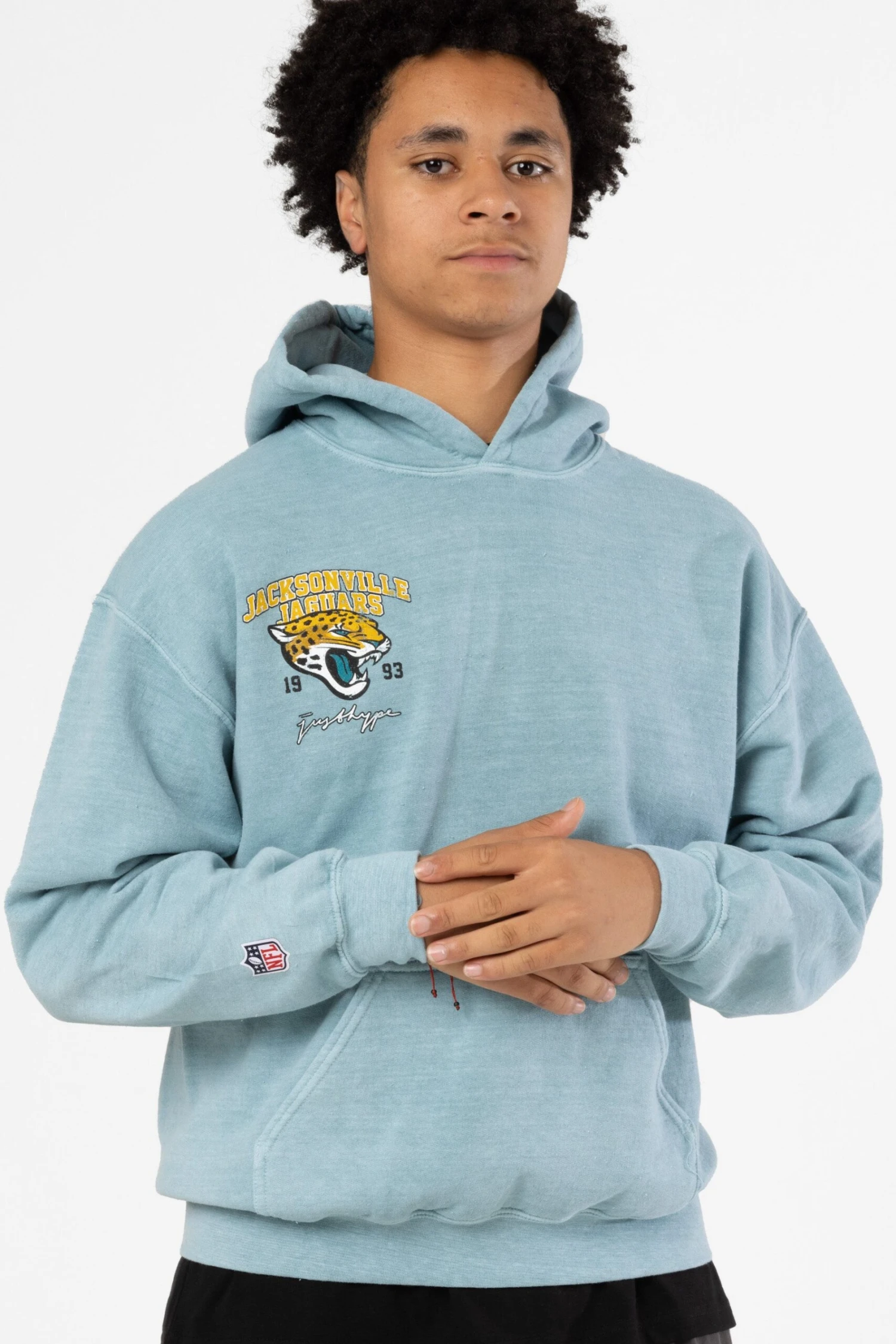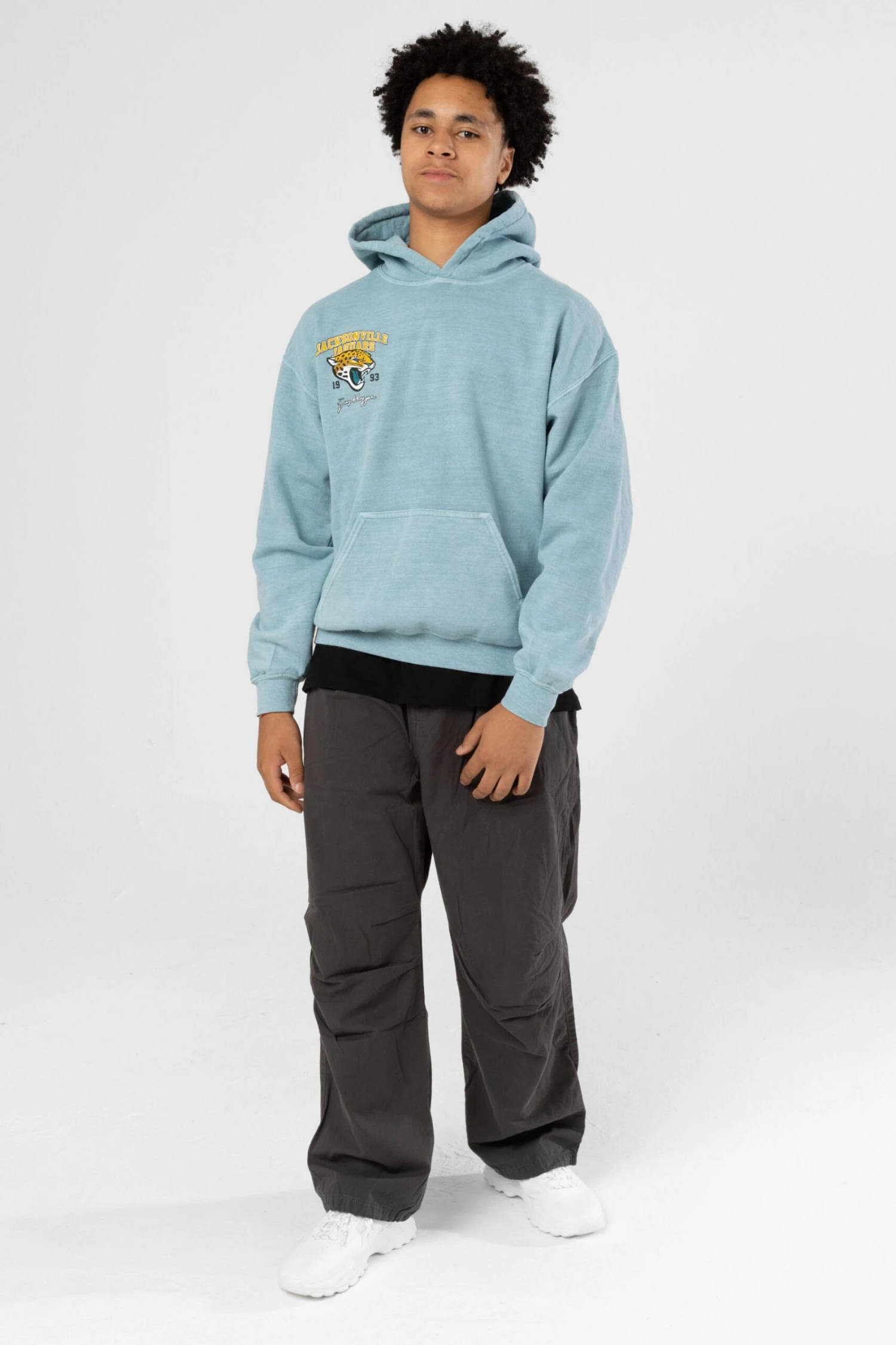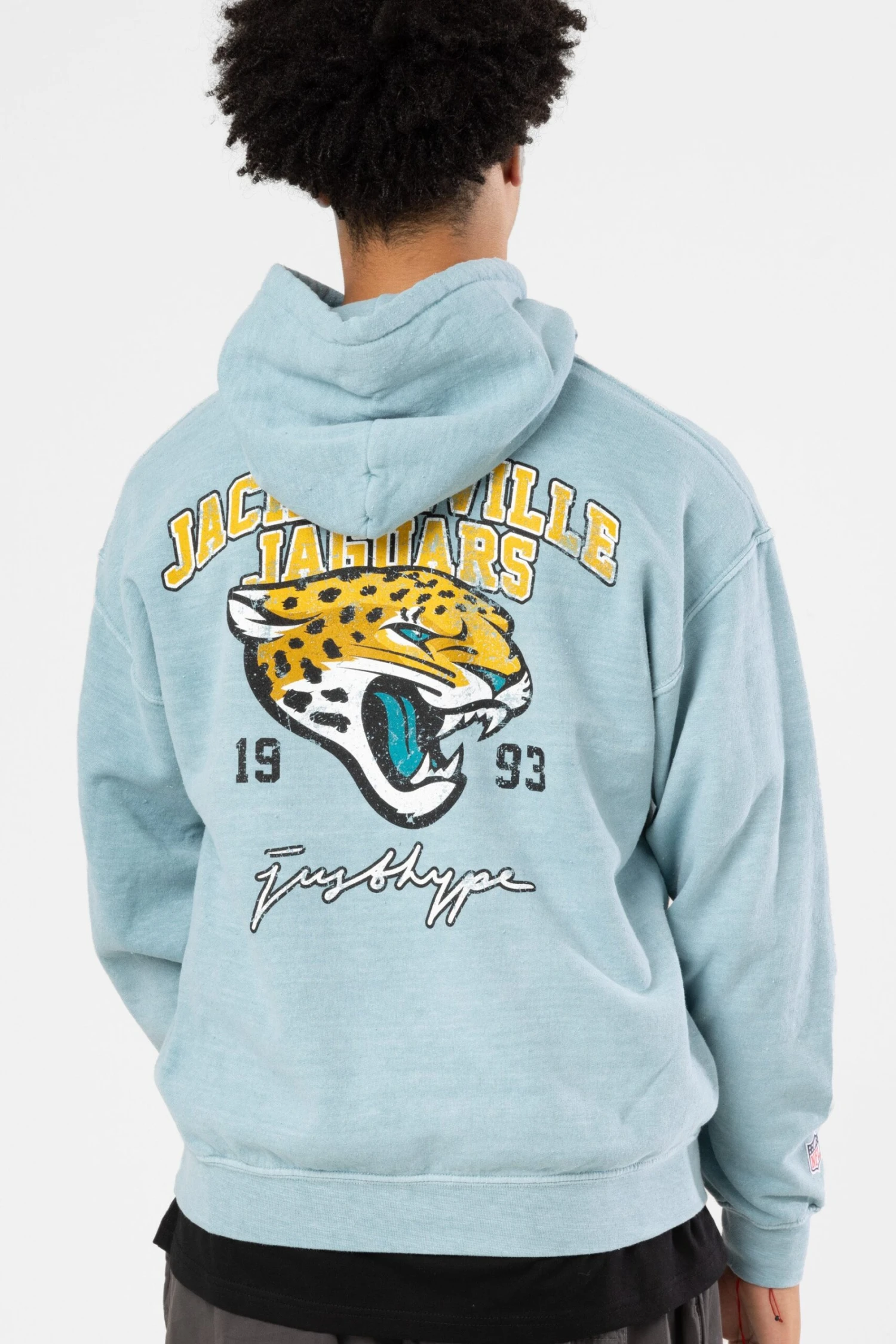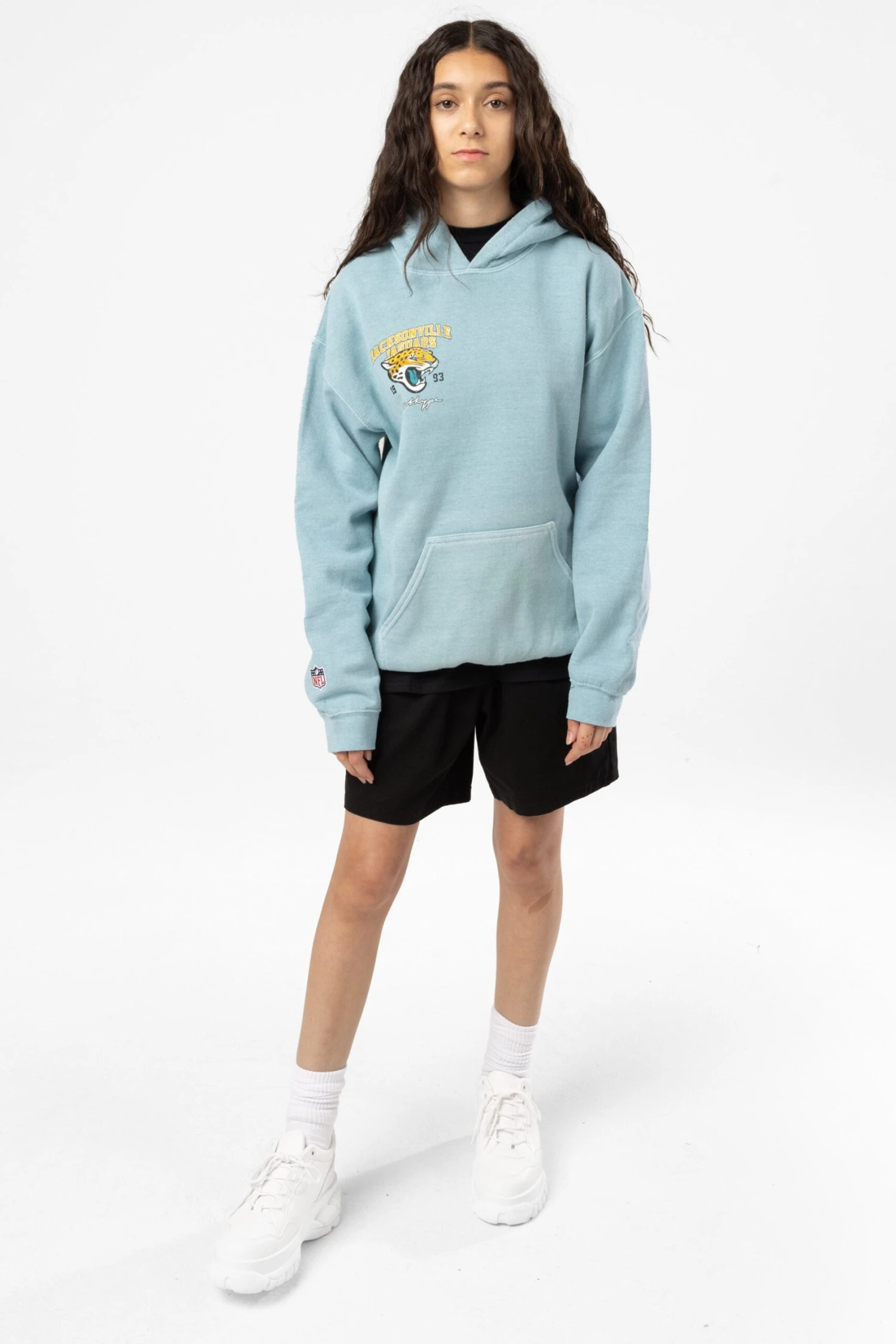 Touchdown! The NFL x HYPE Teal Kids Jacksonville Jaguars Hoodie, a must-have this season. Designed in a teal soft touch fabric for the ultimate comfortable fit, featuring a fitted hem and cuffs and kangaroo pouch. Finished with the Jacksonville Jaguars logo distressed and washed on the front pocket and elarged backprint. Made in England. Machine wash at 30 degrees.